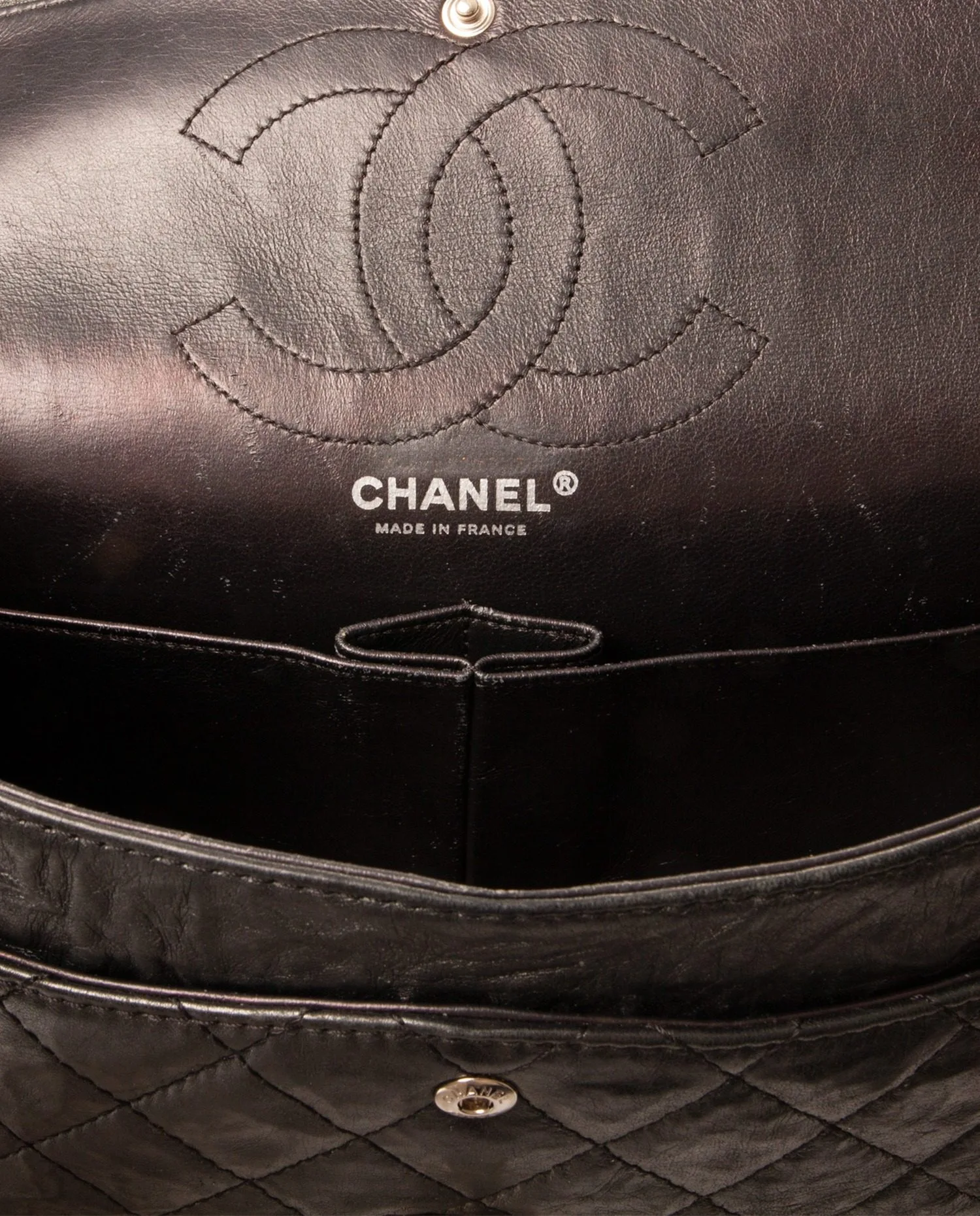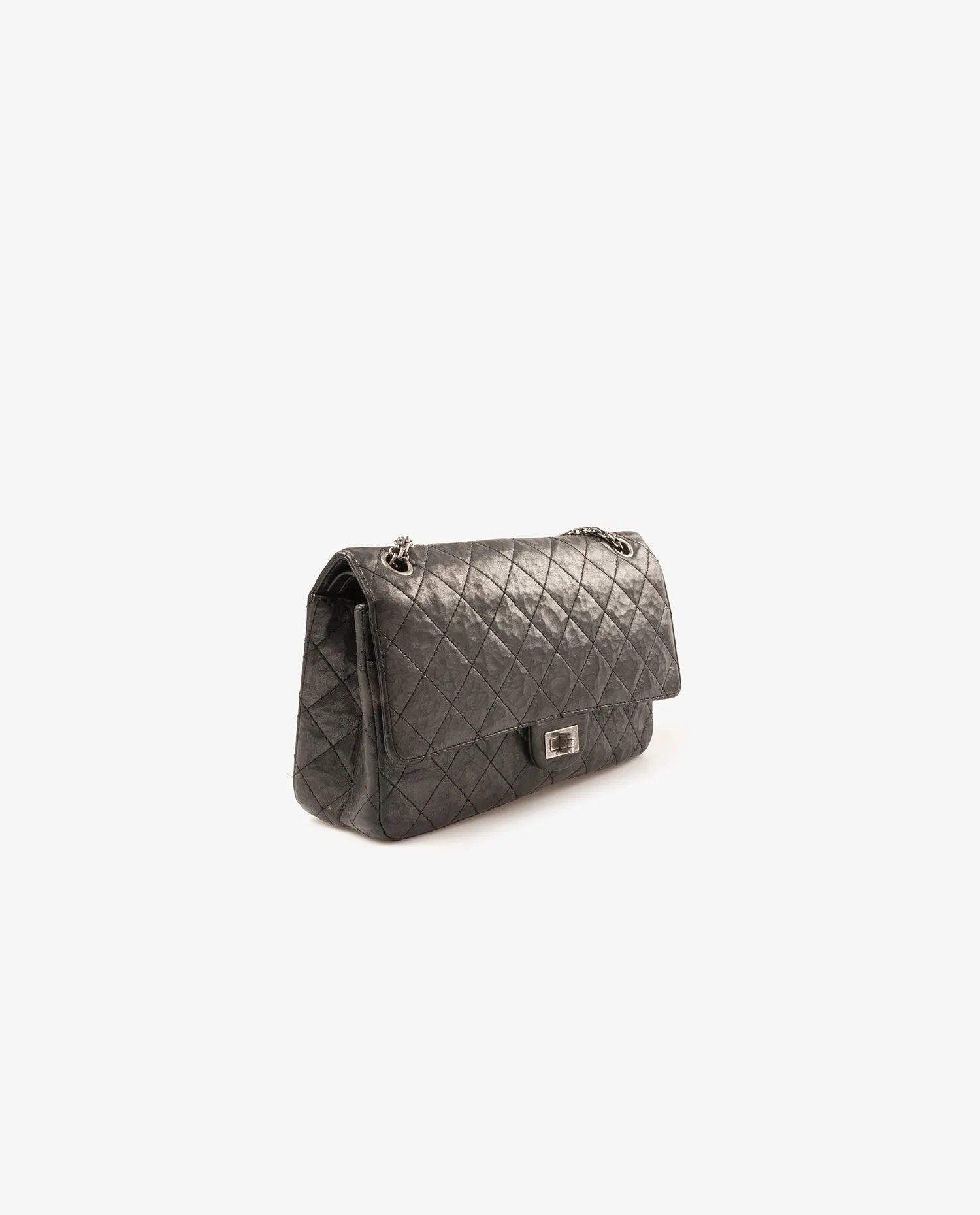 History of the Model: The 2.55 bag, created by Gabrielle Chanel in February 1955 (hence its name), was designed against the conventions of the time. For the first time, a woman offered an elegant, hands-free shoulder bag. Each element carries meaning: the quilting is inspired by the grooms’ jackets, the burgundy lining recalls the uniforms of the orphanage where she grew up, and the metal chain evokes the keys carried by the nuns. The rectangular clasp, nicknamed “Mademoiselle Lock”, underlines her independence – Gabrielle Chanel never married. In 2005, Karl Lagerfeld reissued the model in a version faithful to the original: the 2.55 Reissue. This contemporary model, produced in 2014, is the direct heir of this emblematic reissue. Exterior Details: The aged calfskin has a crinkled and supple texture, here in a Metallic Gray shade – a deep shade with anthracite reflections, reinforced by a metallic treatment which accentuates the play of light. The full metal curb chain (without interwoven leather) comes in a matching gunmetal tone, and allows for single or double wear thanks to its sliding system. The rectangular clasp engraved “CHANEL” completes the ensemble with sobriety. Interior Details: The bag has a double interior flap, typical of the 2.55 models, with a zipped compartment, flat pockets and smooth black leather lining. The interior organization is designed to combine discretion and practicality, while retaining the historic codes of the house. Product Condition: The leather retains its original texture and shine with no notable visible marks. The chain is intact, without oxidation, and the clasp works perfectly. The interior is clean, with no visible wear. The corners and edges are well preserved, making this model a prized and perfectly preserved collector’s item. Maintenance Tips: Avoid prolonged exposure to humidity and heat. Store the bag in its dustbag when not in use to preserve its shape and color. Clean gently with a soft cloth. If necessary, call on an antique leather specialist for occasional care. Why Choose this Product: This Chanel 2.55 Reissue medium size, in aged gray metallic leather, combines history, know-how and strong aesthetics. Its original design by Gabrielle Chanel, faithfully reinterpreted in 2014, makes it a collector’s item sought after by connoisseurs. Its metallic anthracite gray shade and its absence of ostentatious logo make it a piece that is both discreet and daring, ideal for everyday use as well as for more special occasions. A durable and symbolic choice for any high-end vintage wardrobe.