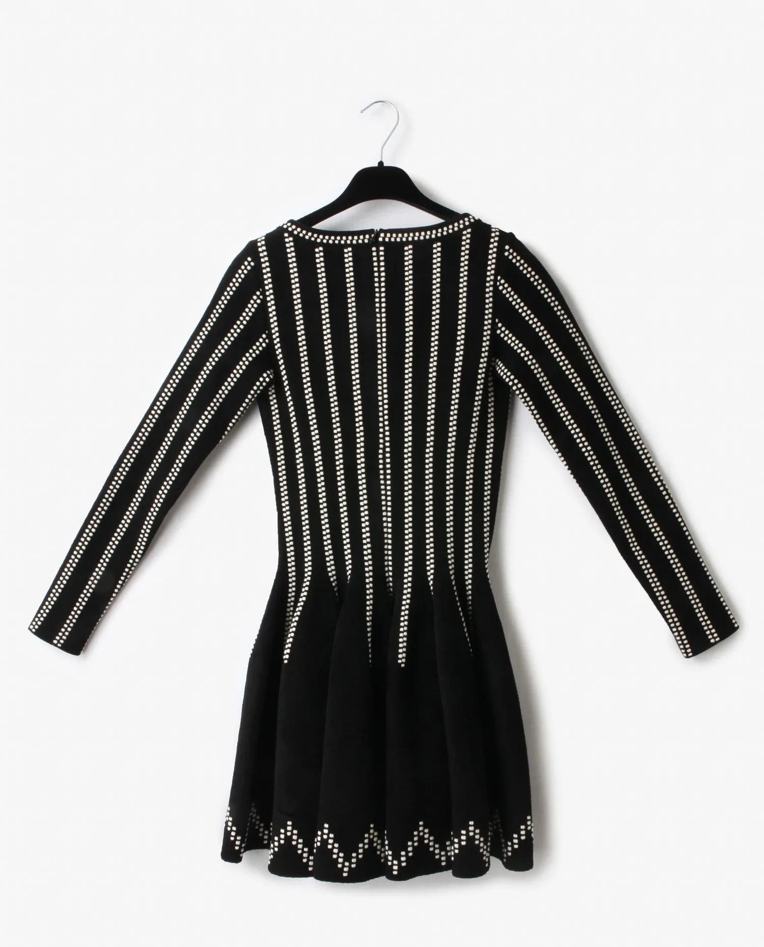 Alaïa short dress, iconic skater volume in jacquard weave. A true masterpiece, which elegantly enhances the silhouette. Long sleeves, round neckline.