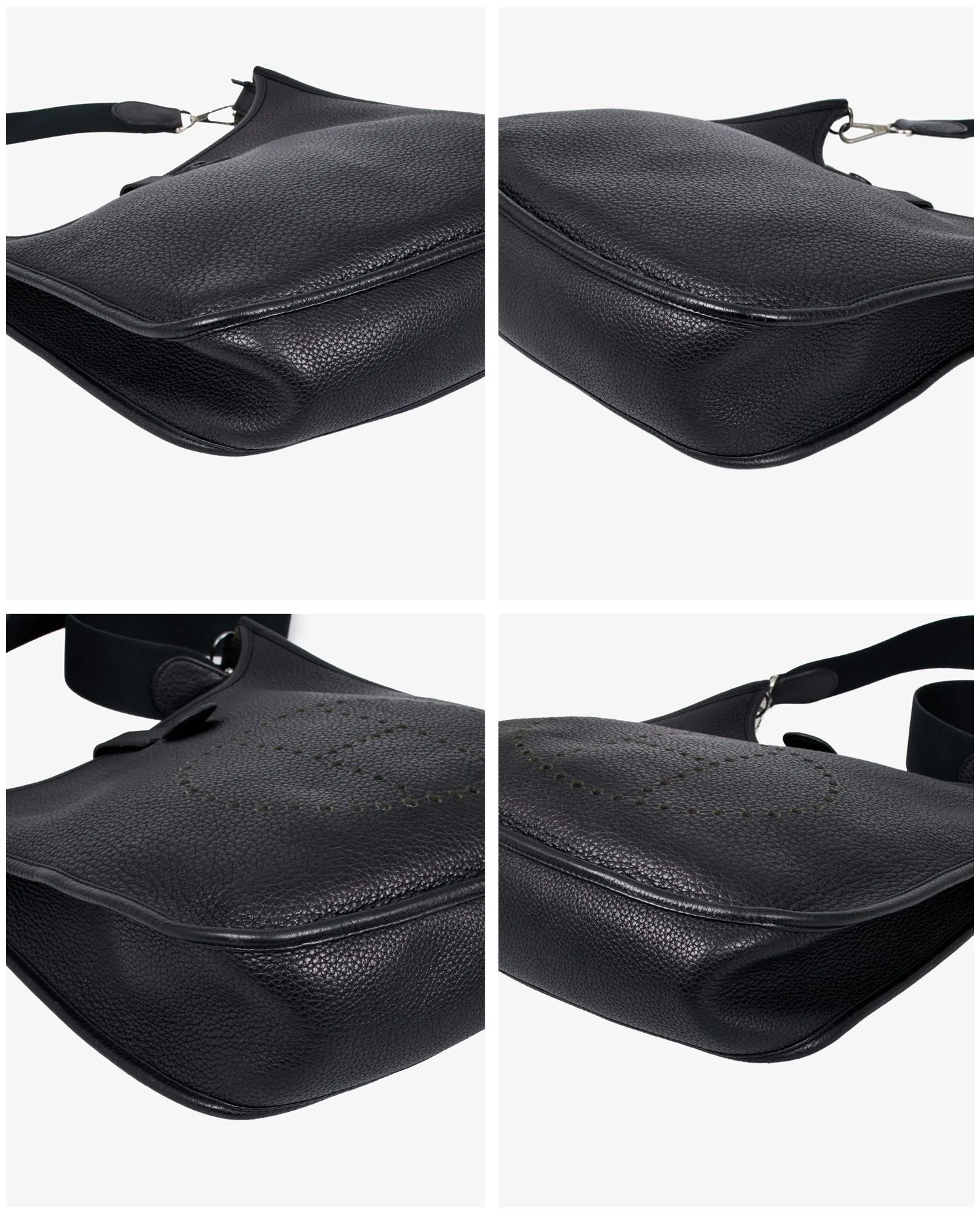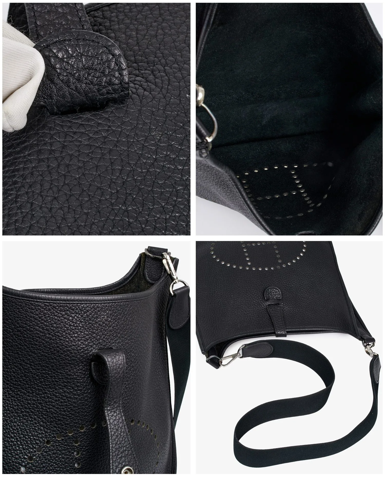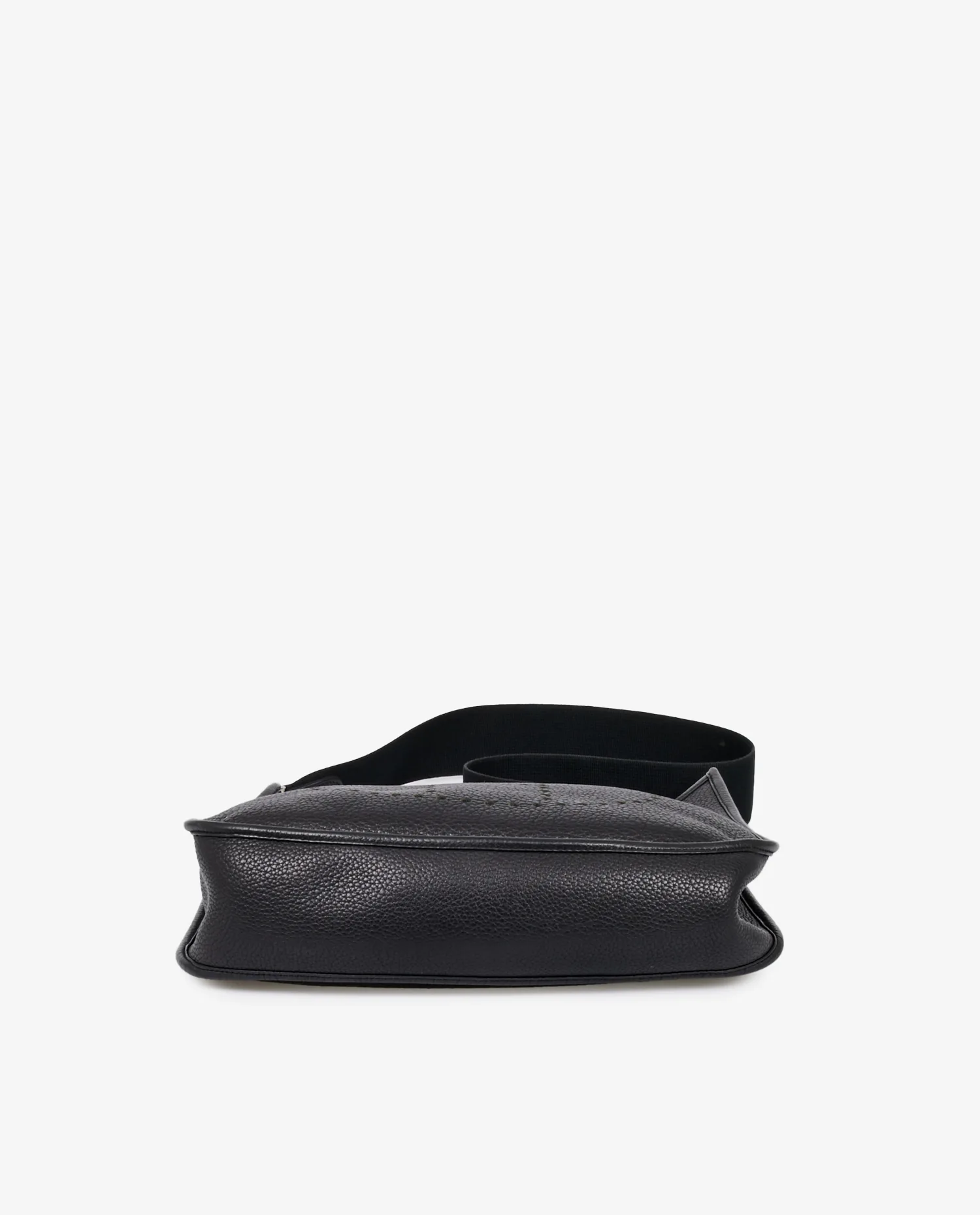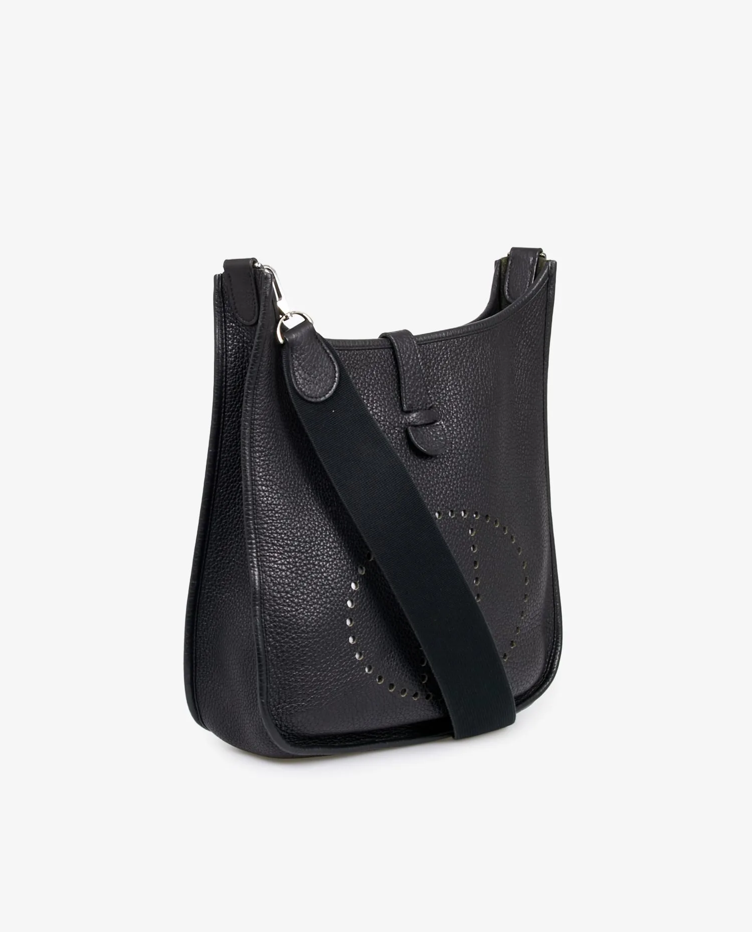 Vintage Evelyne Hermès bag in black togo. Silver jewelry. Carried over the shoulder with a removable nylon strap. In very good condition.