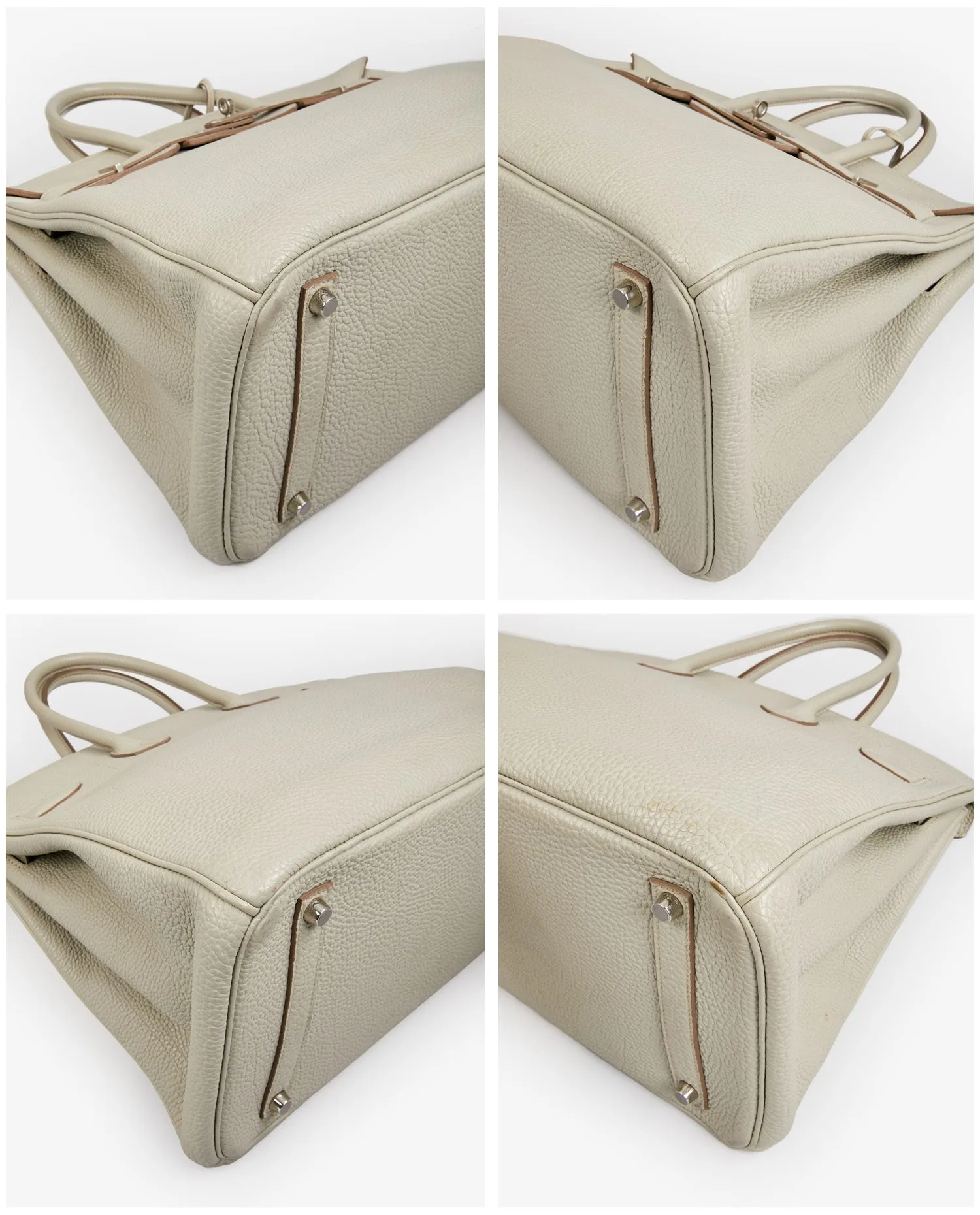 This Birkin is made from Togo leather, a grained calf leather naturally resistant to scratches and deformation. The soft, powdery Gris Neve shade adds a subtle touch of sophistication. The iconic cut-out flap closes with two side straps, a turnstile clasp and a silver-tone metal padlock, all fully covered in their protective plastic. The rounded, rigid handles offer excellent grip. The bottom is reinforced by four polished silver metal studs, also protected by their own films. Each exterior seam is hand-sewn, a testament to the expertise of Hermès craftsmen.
