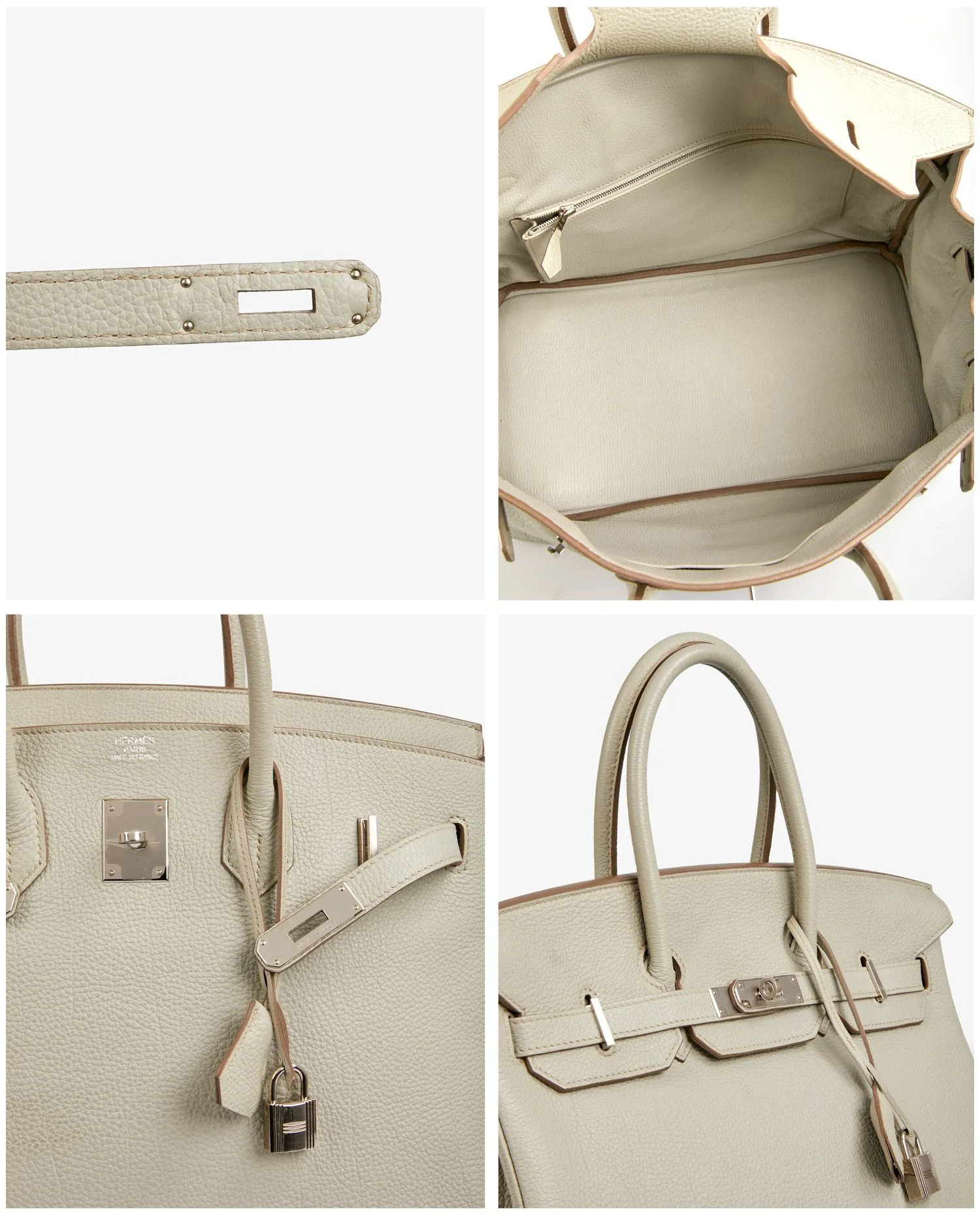 This Birkin 35 Hermès in Togo Gris Neve leather represents a rare opportunity to acquire a piece in exceptional, almost new condition, with all its plastics still present. Its discreet yet singular color, the quality of its workmanship and its excellent preservation make it a coveted model for both elegant use and heritage collection. It is an emblematic piece of Hermès savoir-faire, in a rare, timeless and durable version, meeting the most demanding criteria of luxury vintage leather goods enthusiasts.