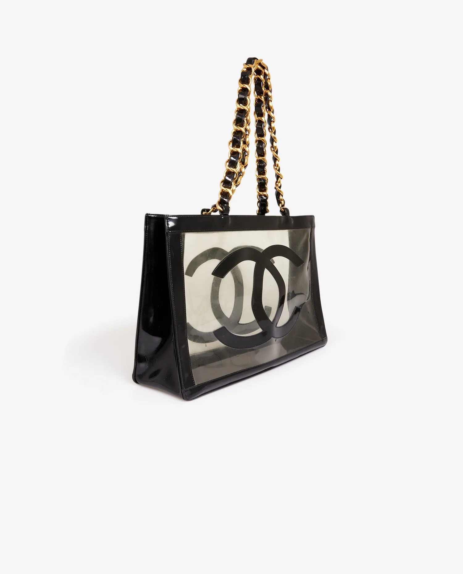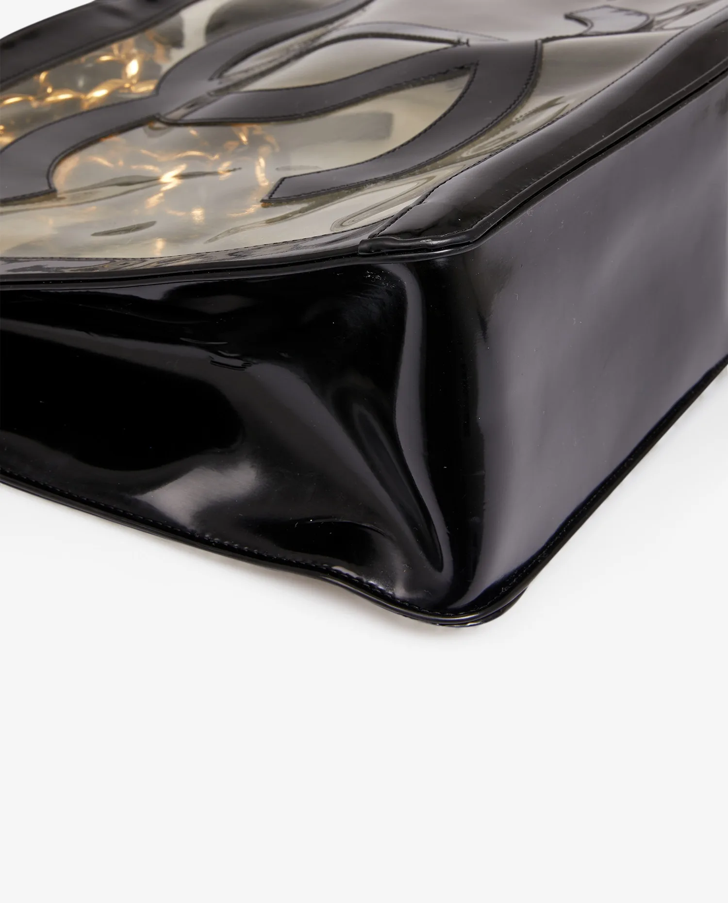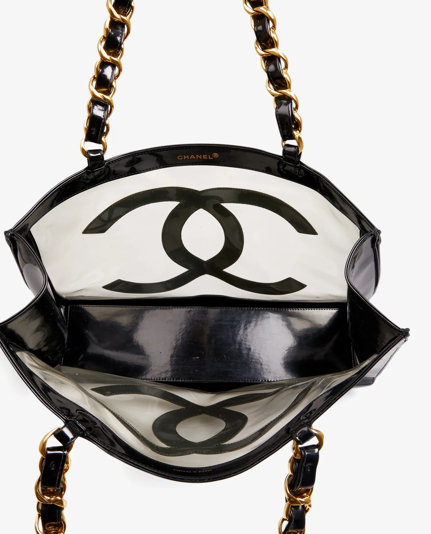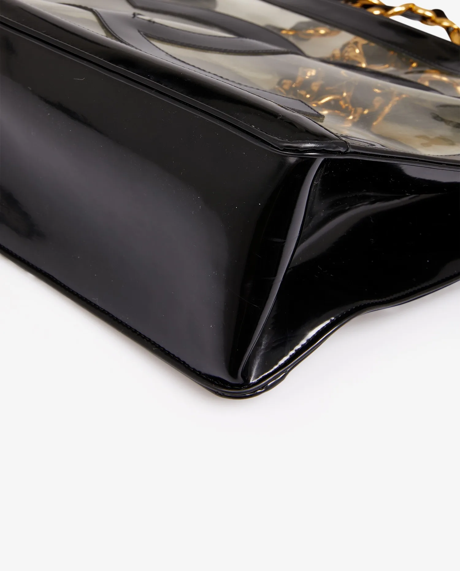 Collector! Chanel tote bag in black and transparent patent leather. Carried on the shoulder with its two gold chain and black leather handles.