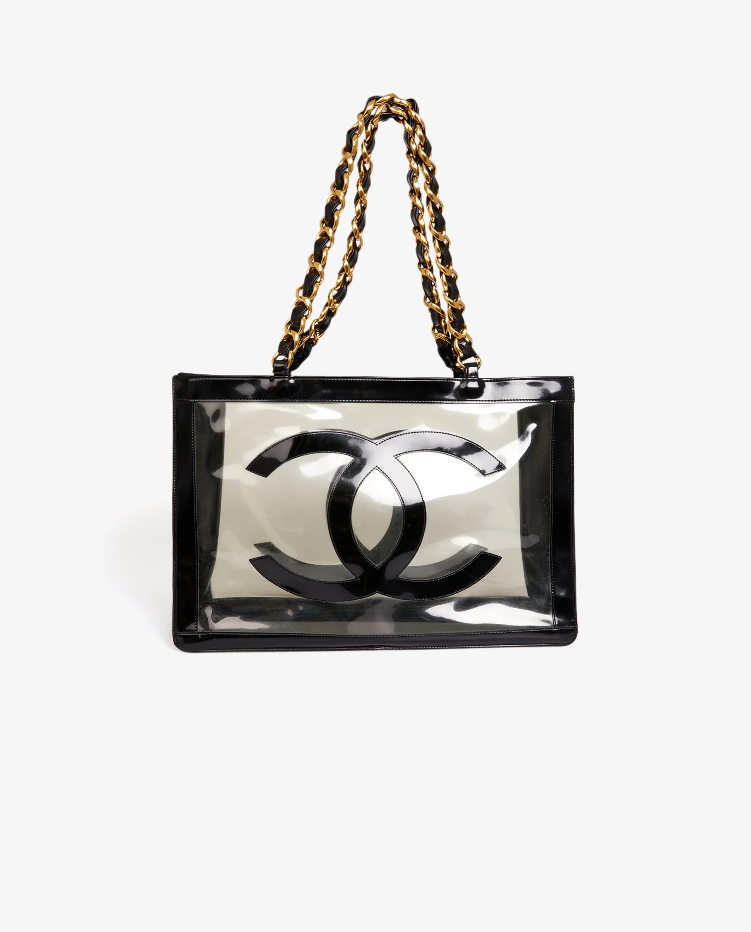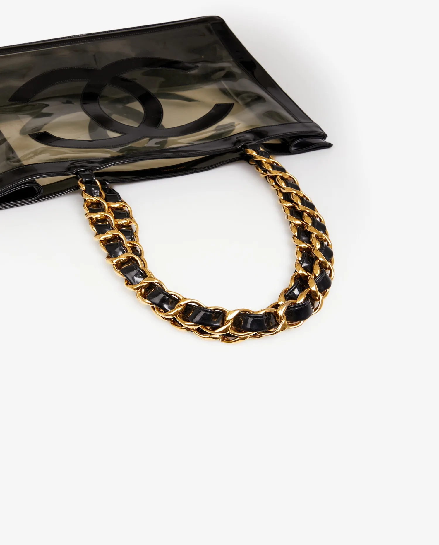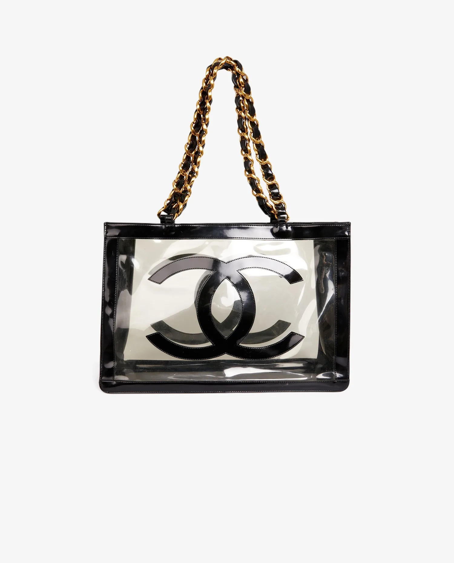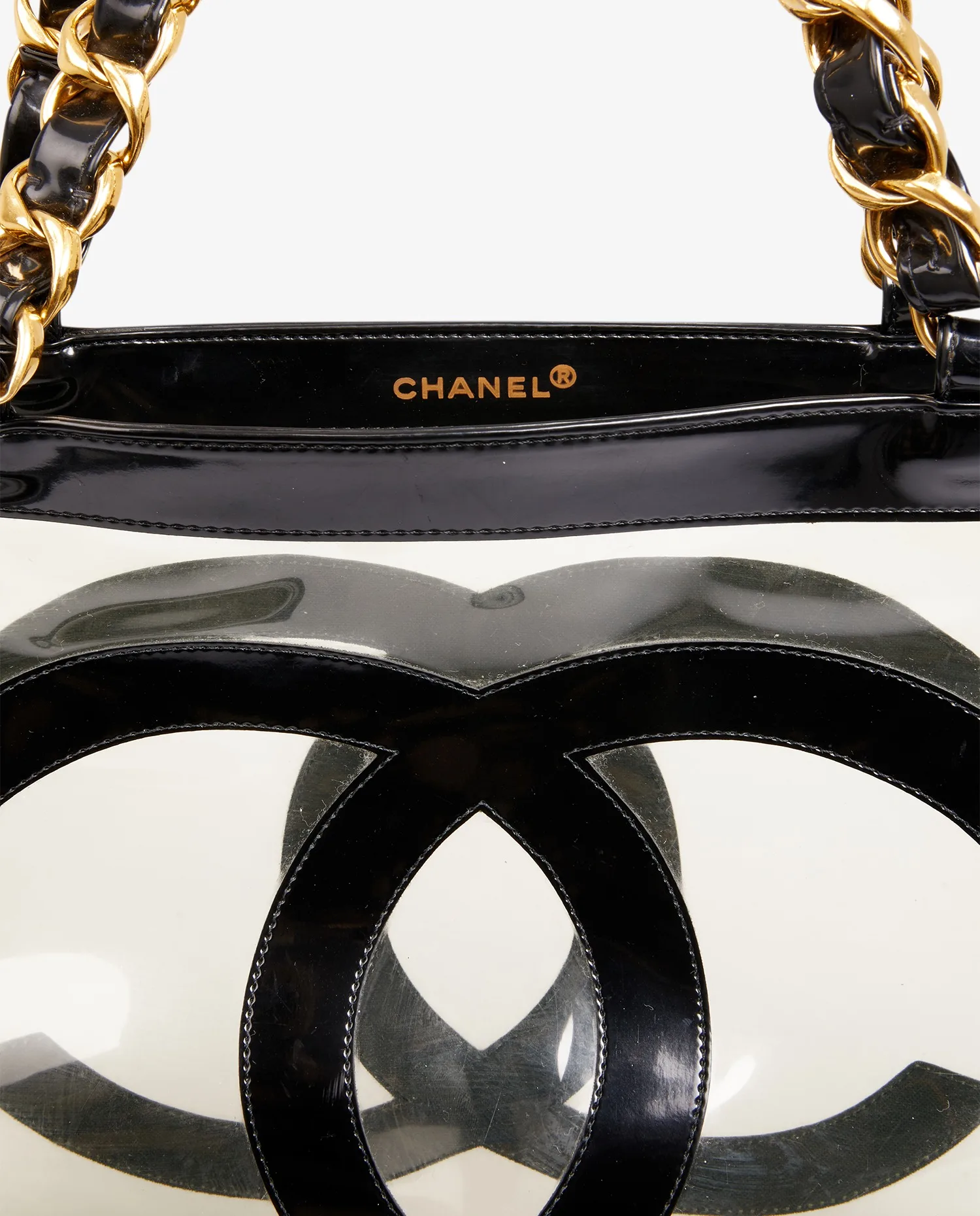 Collector! Chanel tote bag in black and transparent patent leather. Carried on the shoulder with its two gold chain and black leather handles.