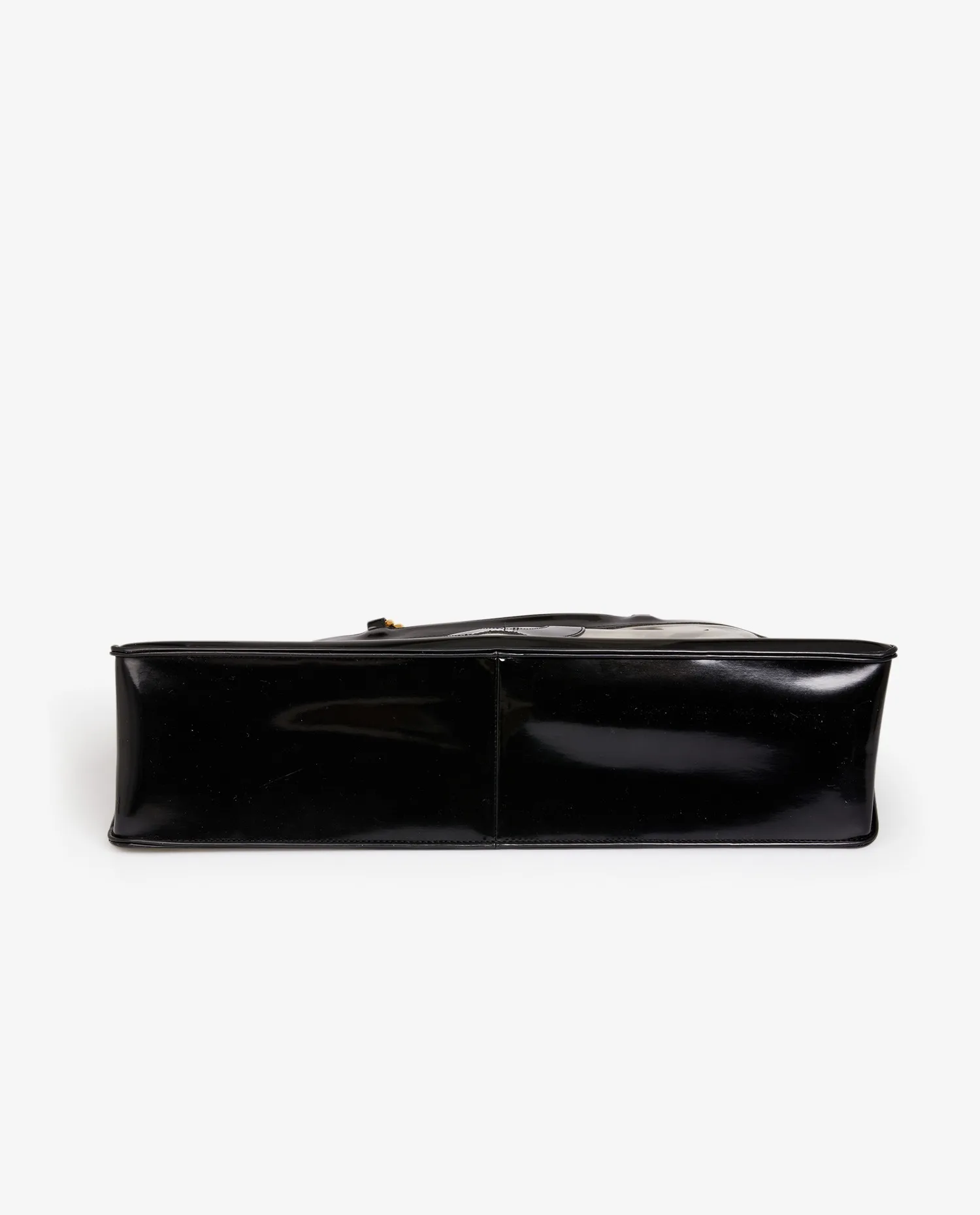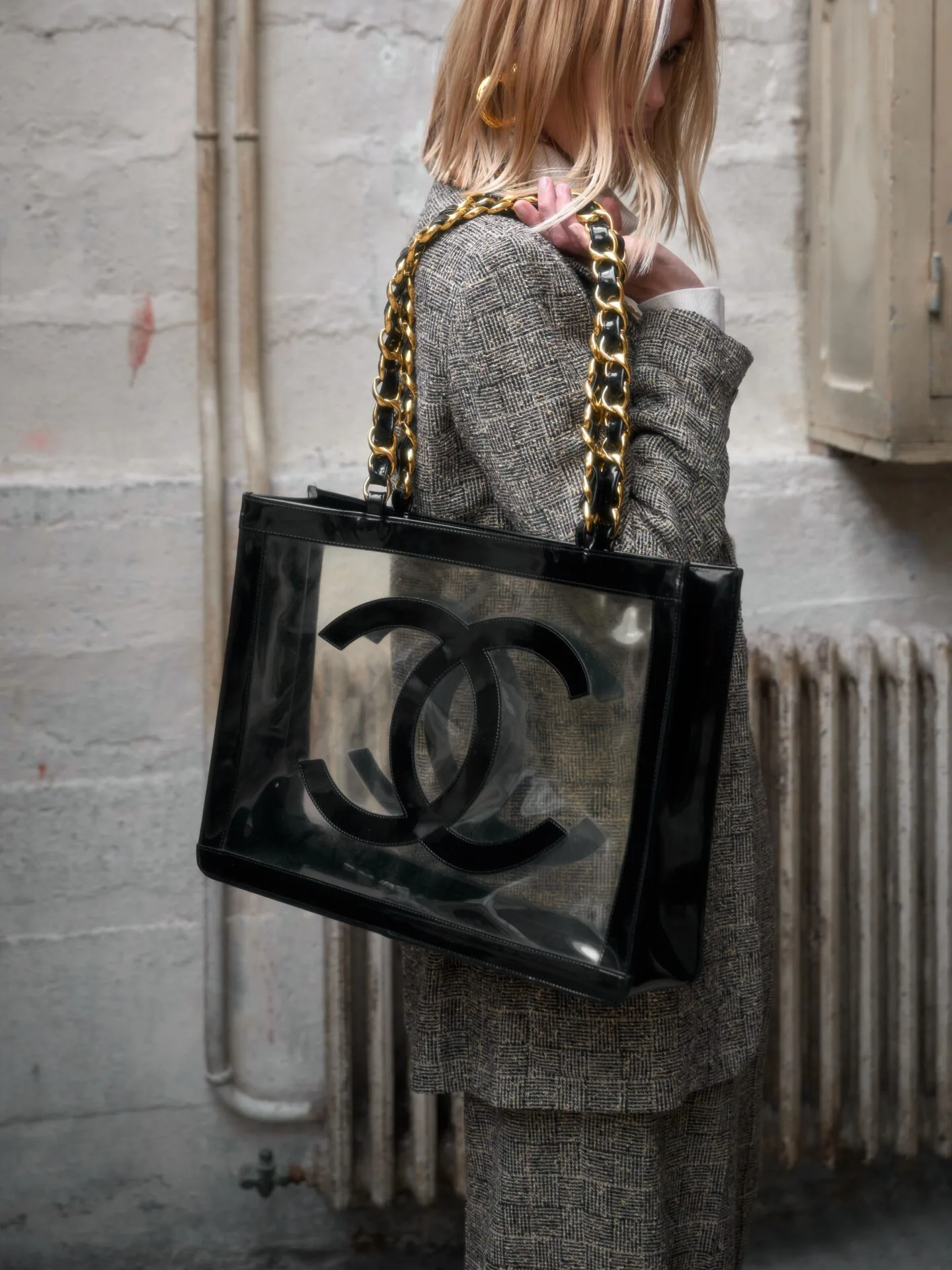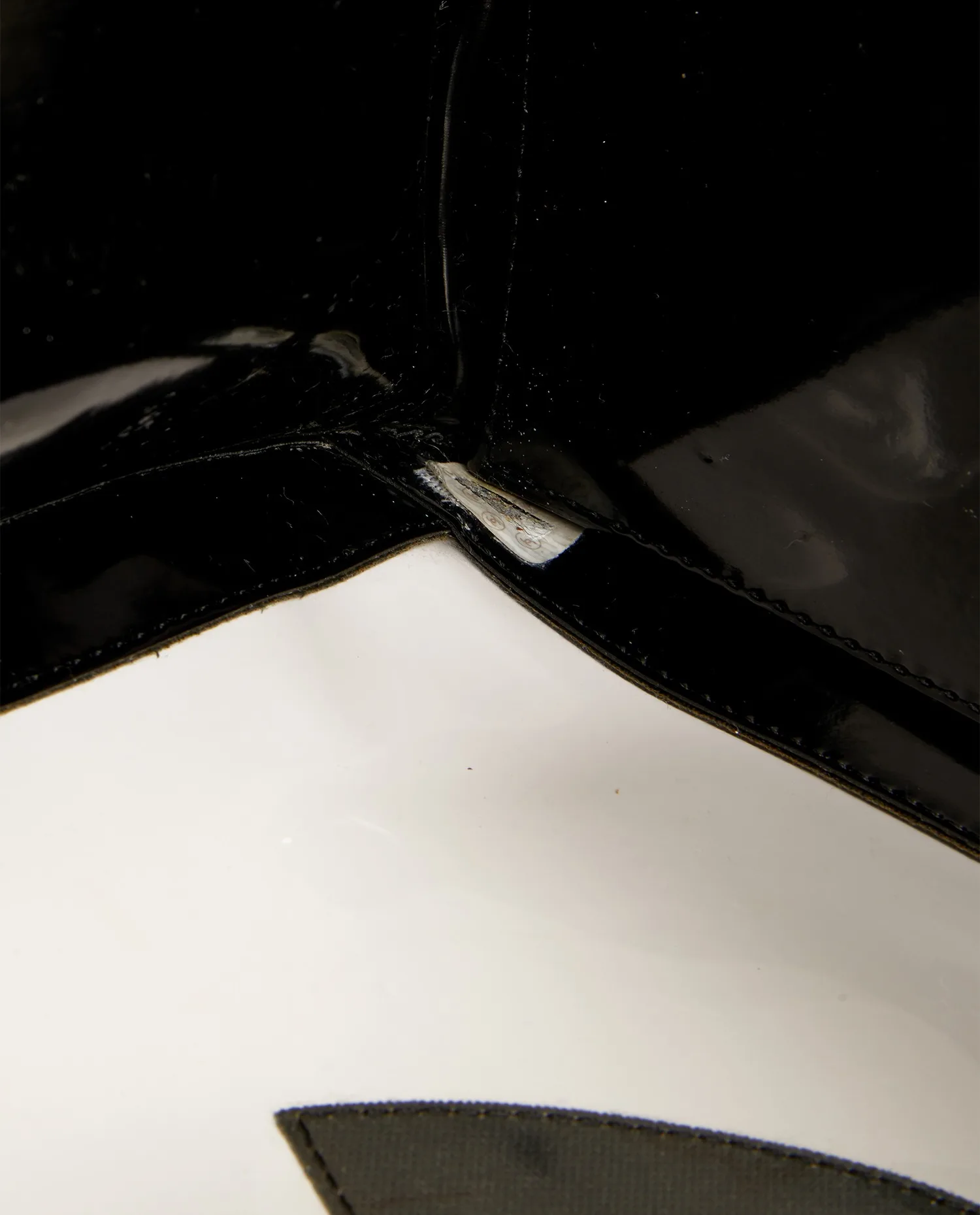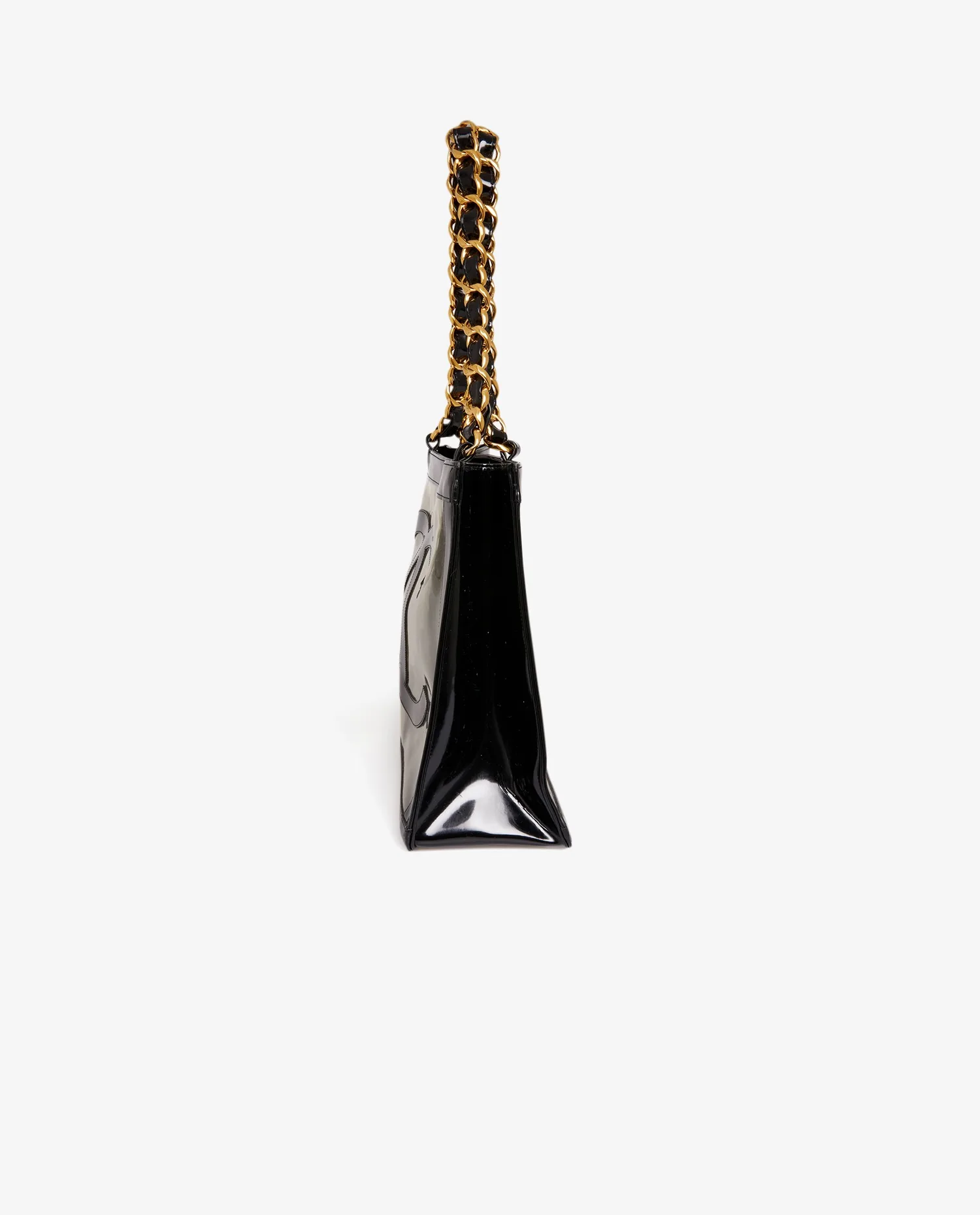Collector! Chanel tote bag in black and transparent patent leather. Carried on the shoulder with its two gold chain and black leather handles.