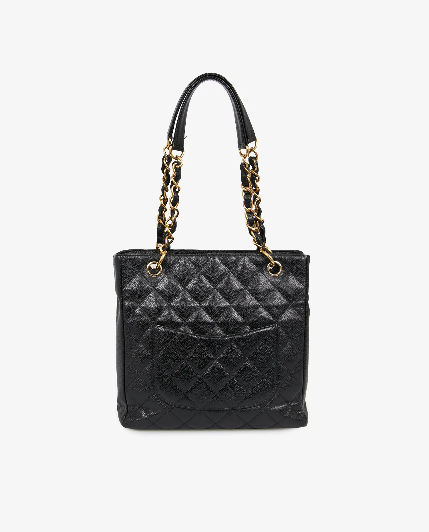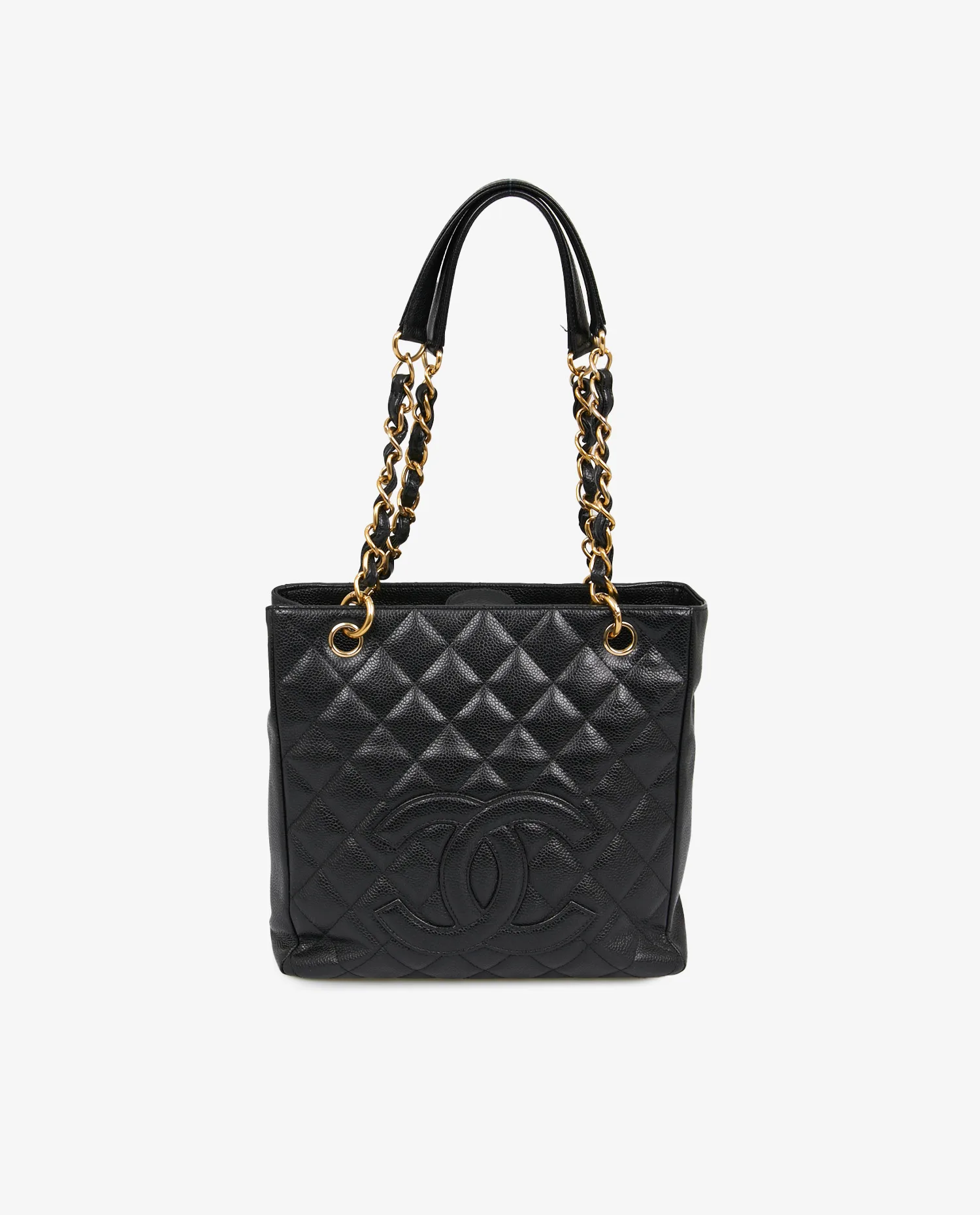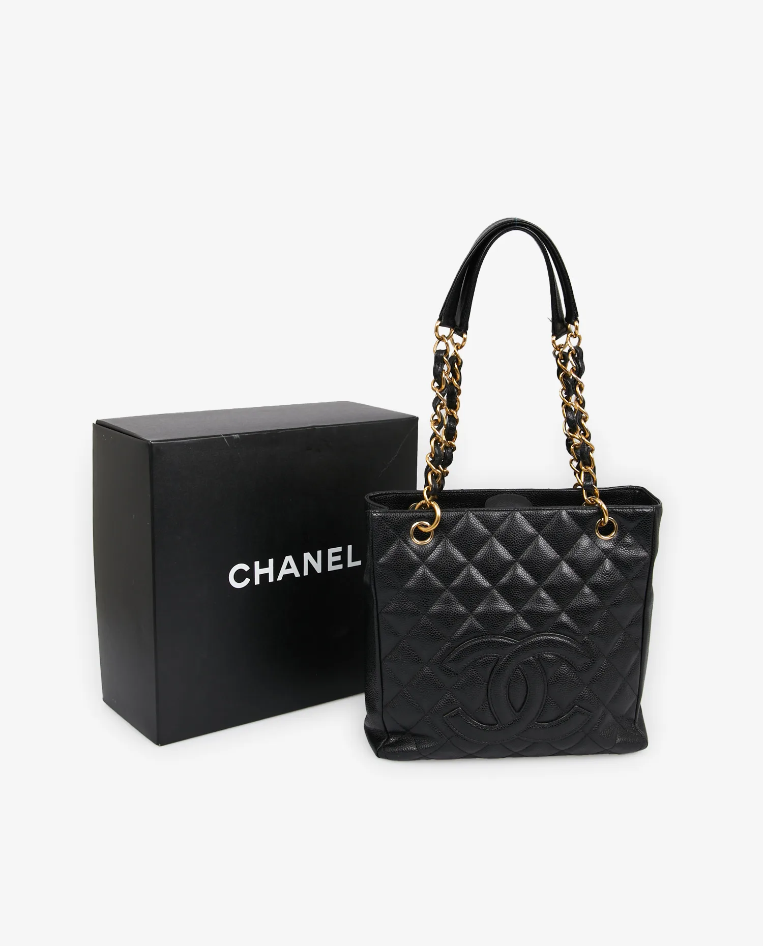 Small vintage Chanel tote bag in black caviar leather. Worn on the arm or shoulder with two gold-chain shoulder straps intertwined with leather. Magnetic button closure. In very good condition. It will be delivered in its original box.