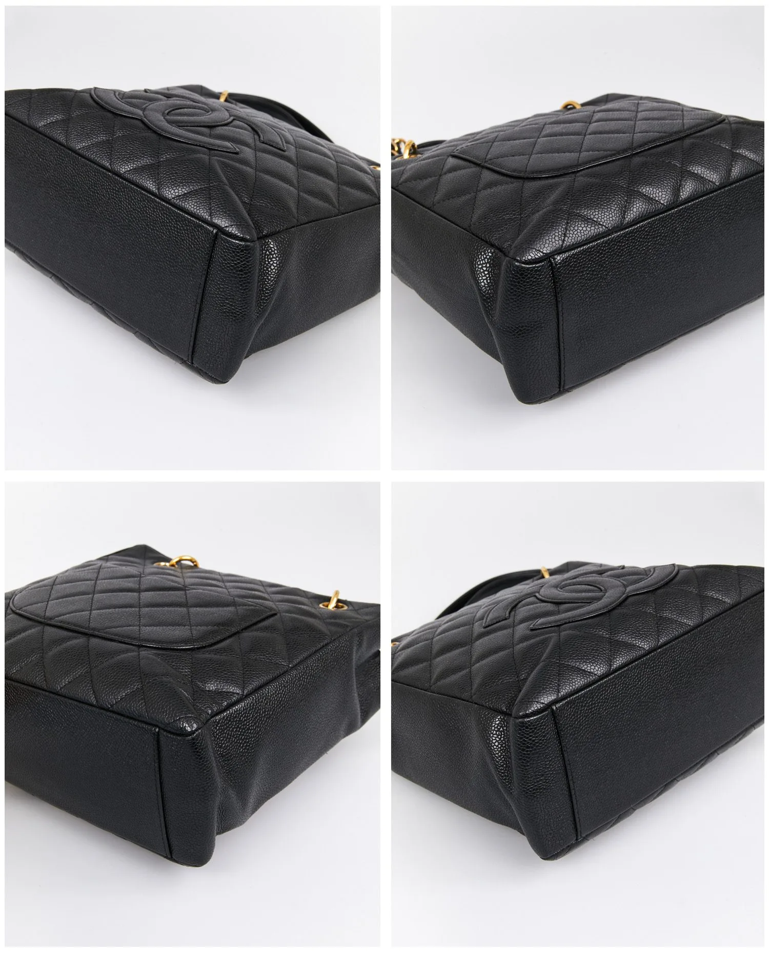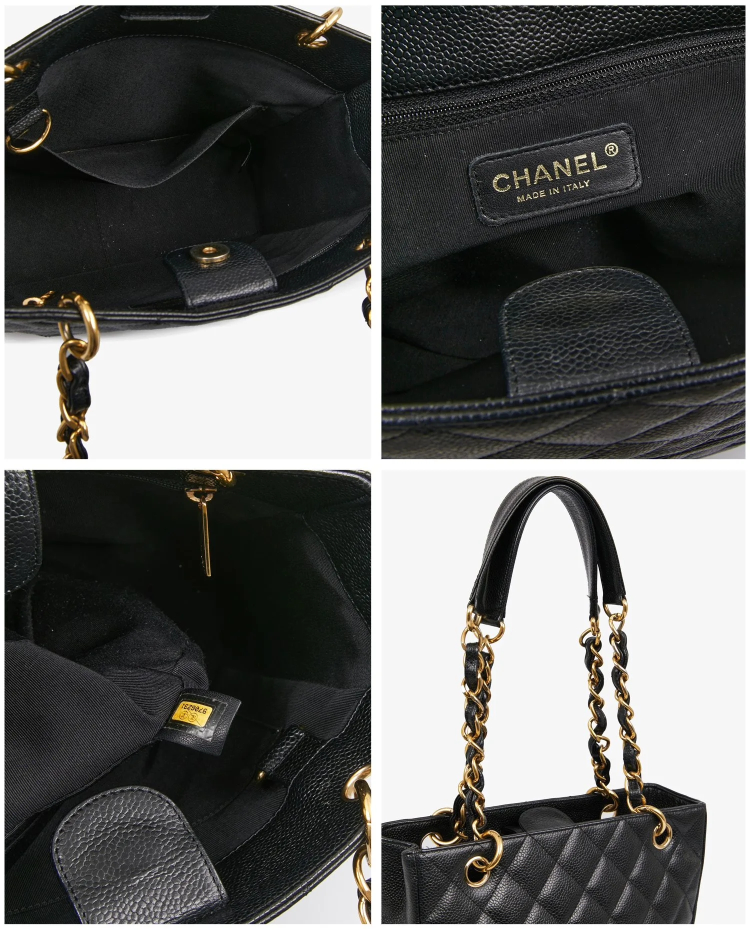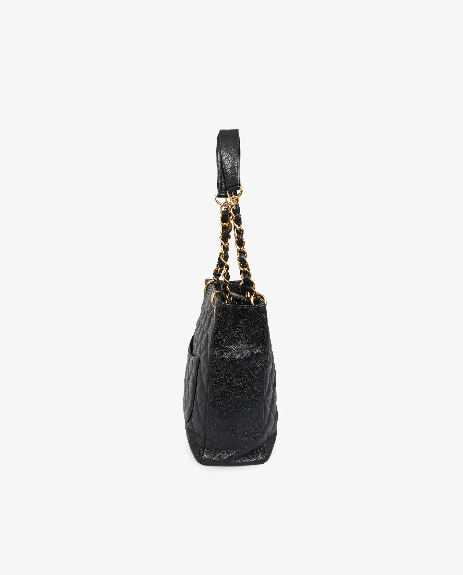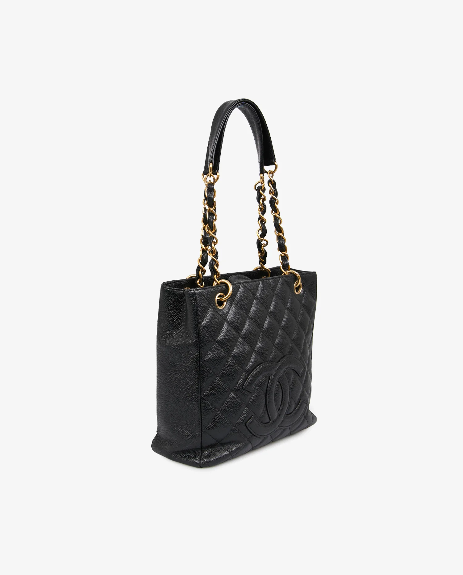 Small vintage Chanel tote bag in black caviar leather. Worn on the arm or shoulder with two gold-chain shoulder straps intertwined with leather. Magnetic button closure. In very good condition. It will be delivered in its original box.