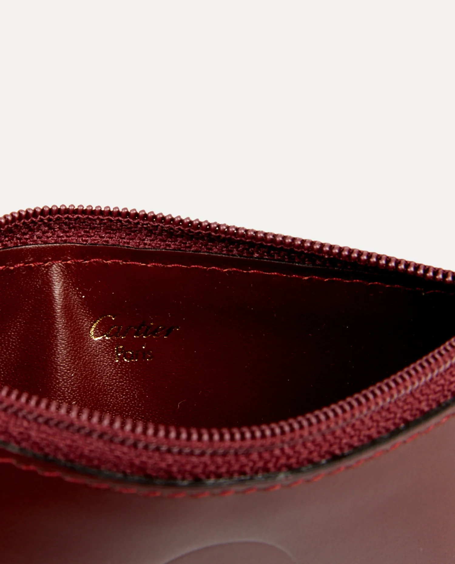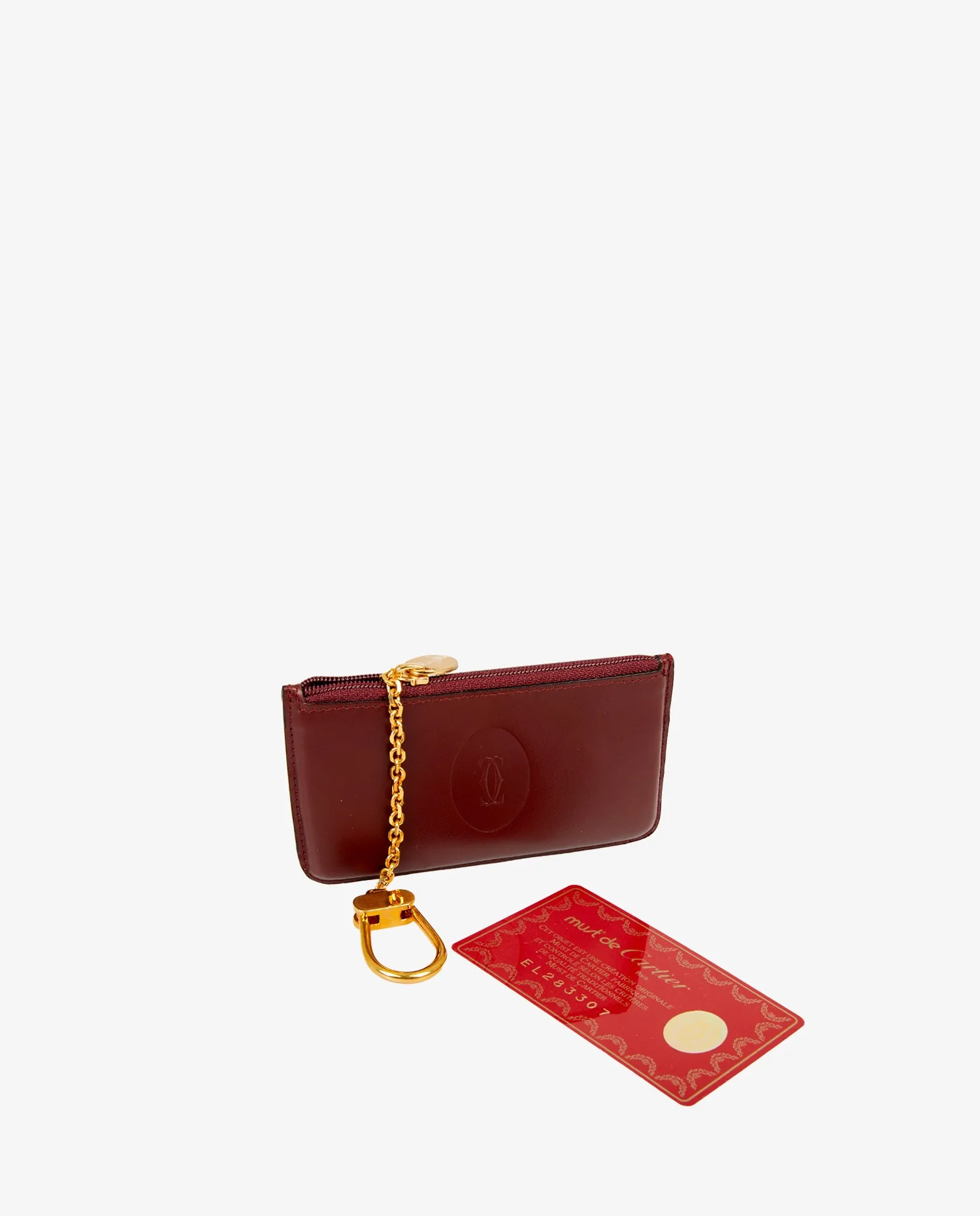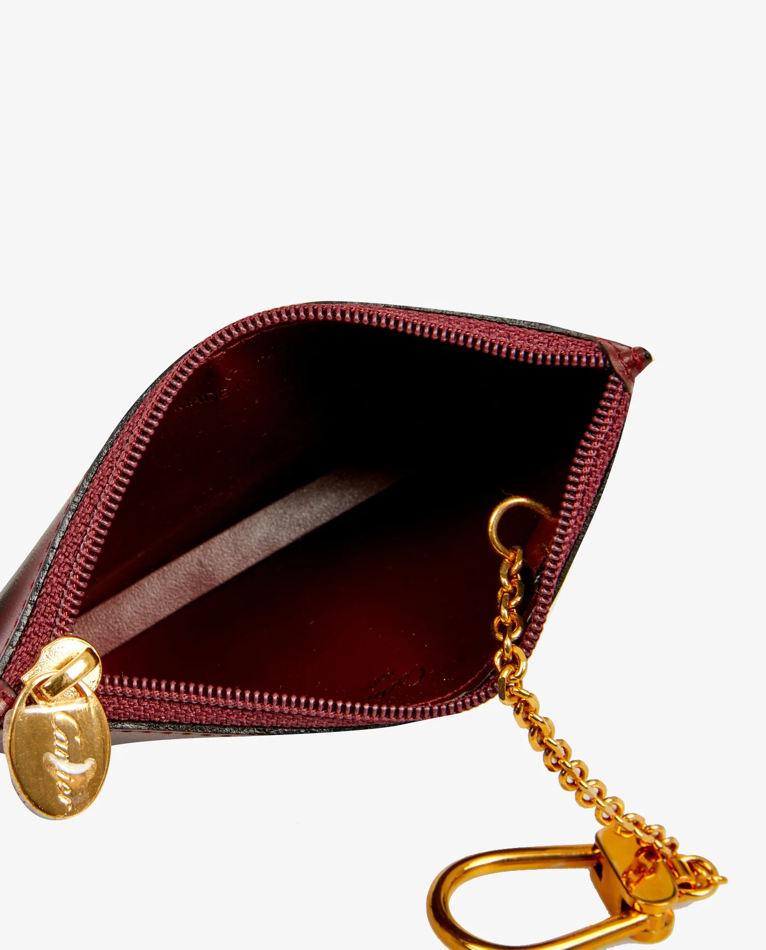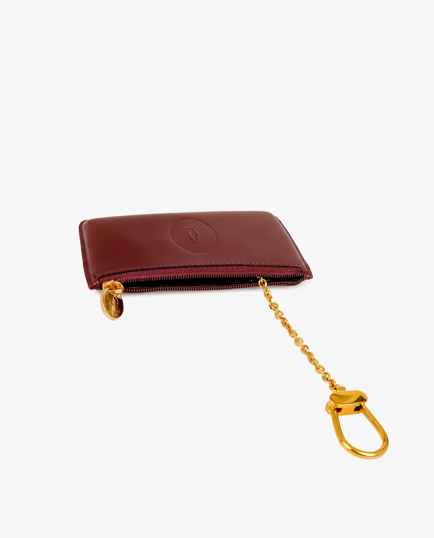Cartier cardholder in burgundy leather. A hook on the inside allows you to attach your keys. In very good condition.
