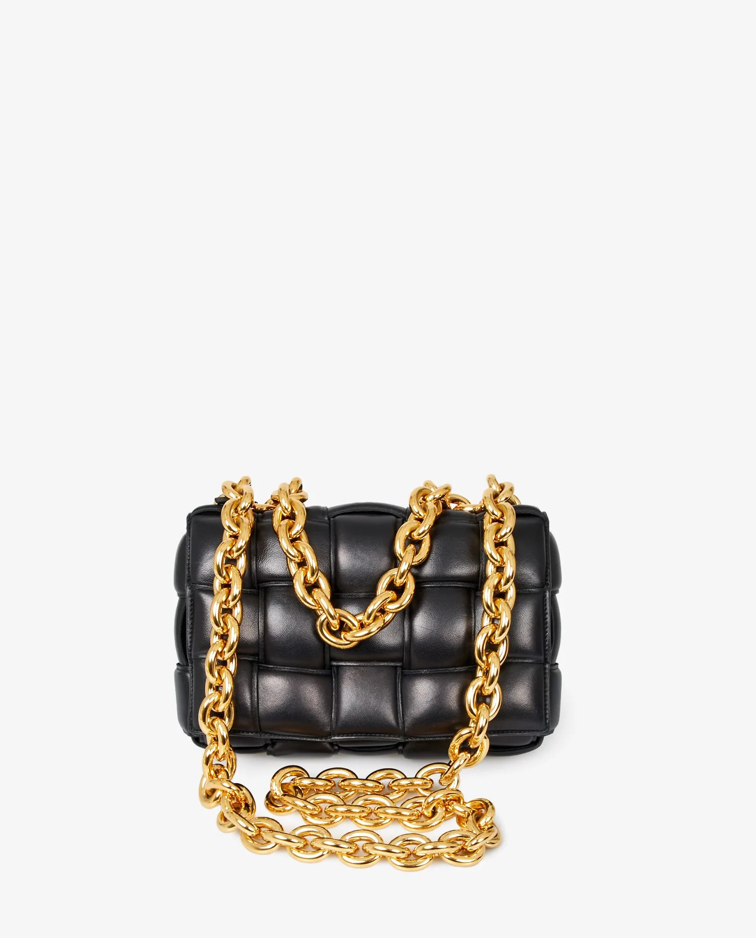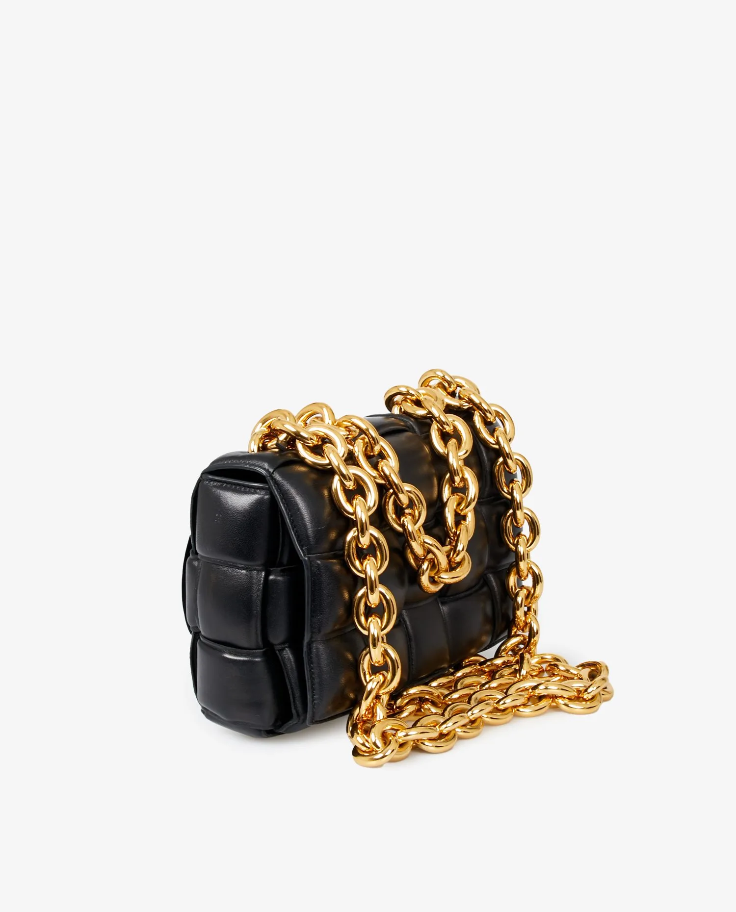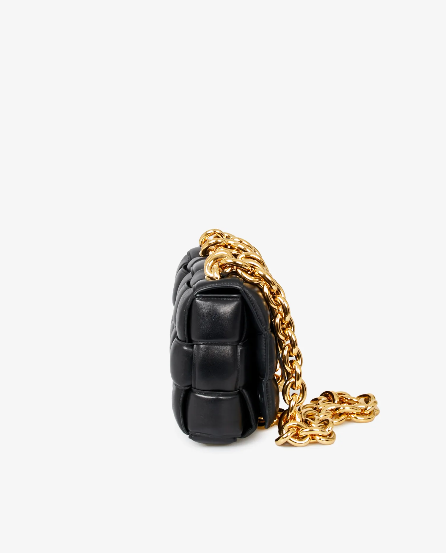 Bottega Veneta Chain Cassette bag in black quilted lambskin leather. Worn on the shoulder or crossbody with a gold chain shoulder strap featuring large links for a very vintage effect. Snap closure. In very good condition. Delivered in its original dustbag.