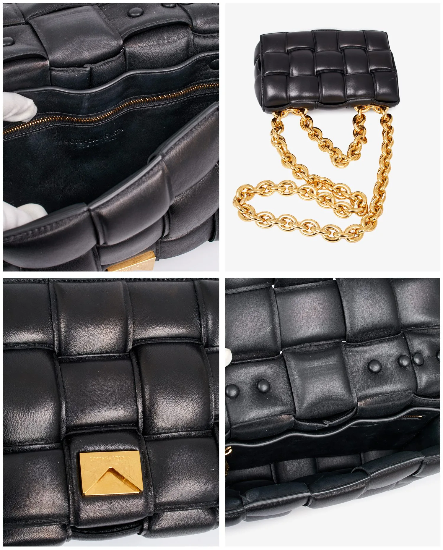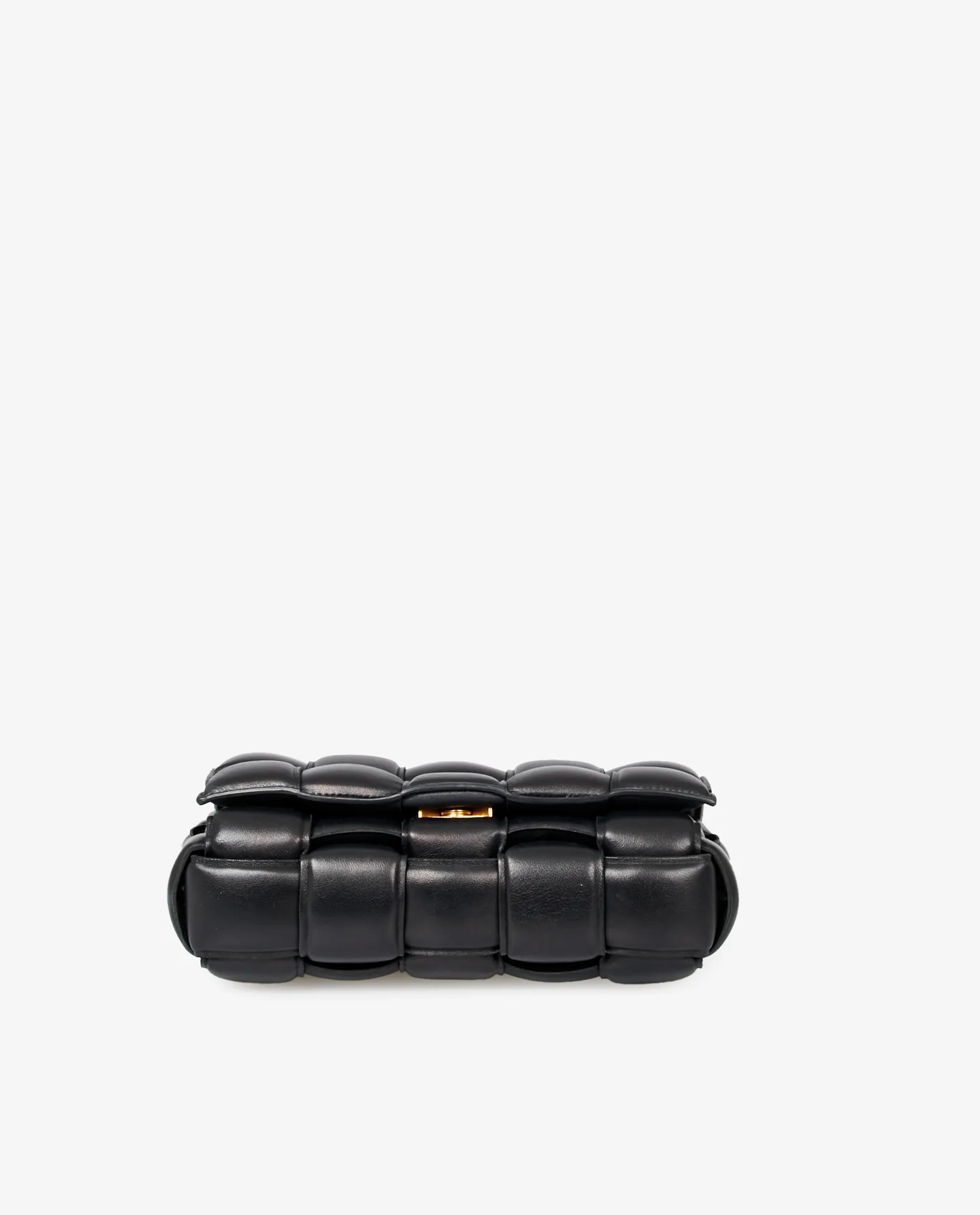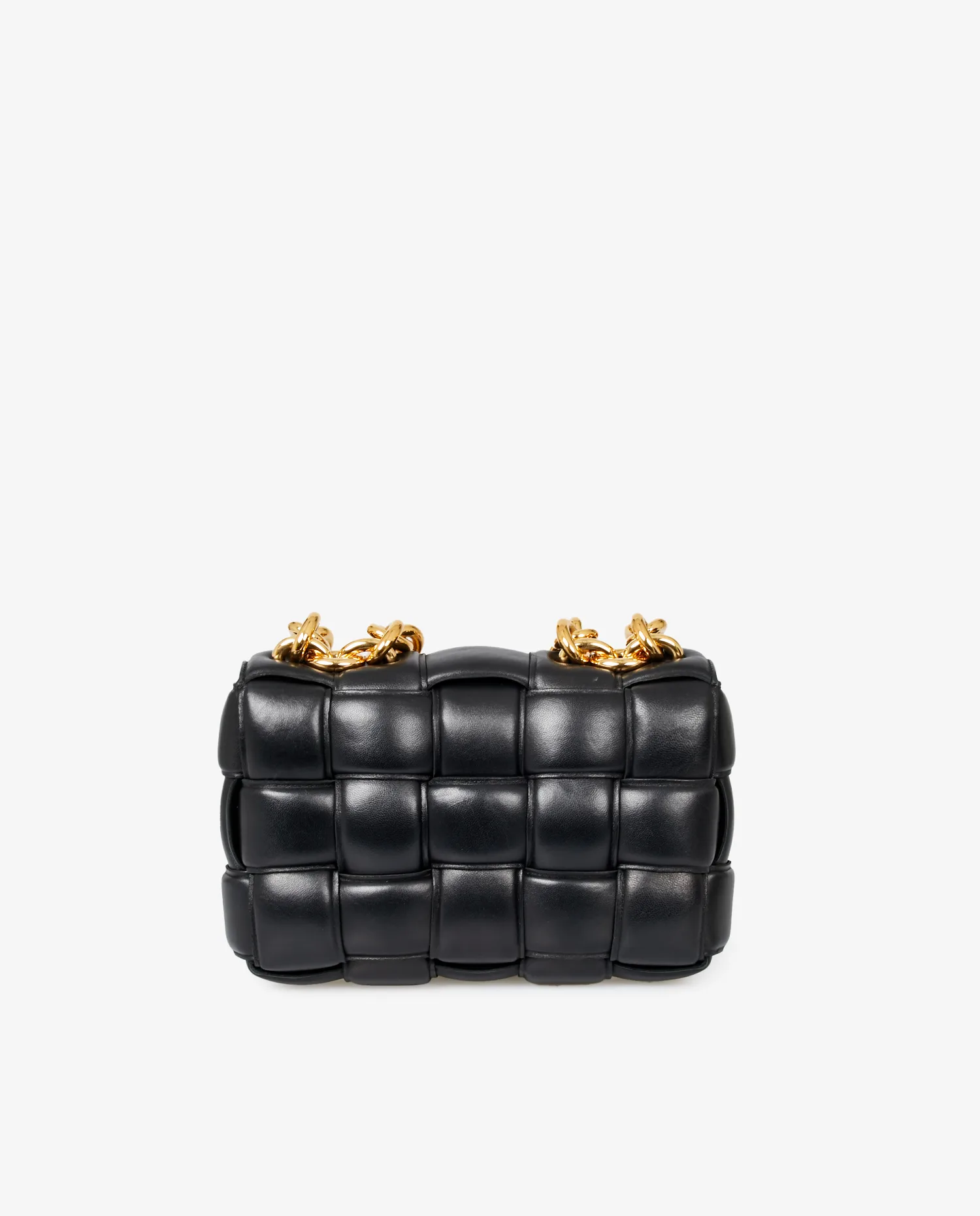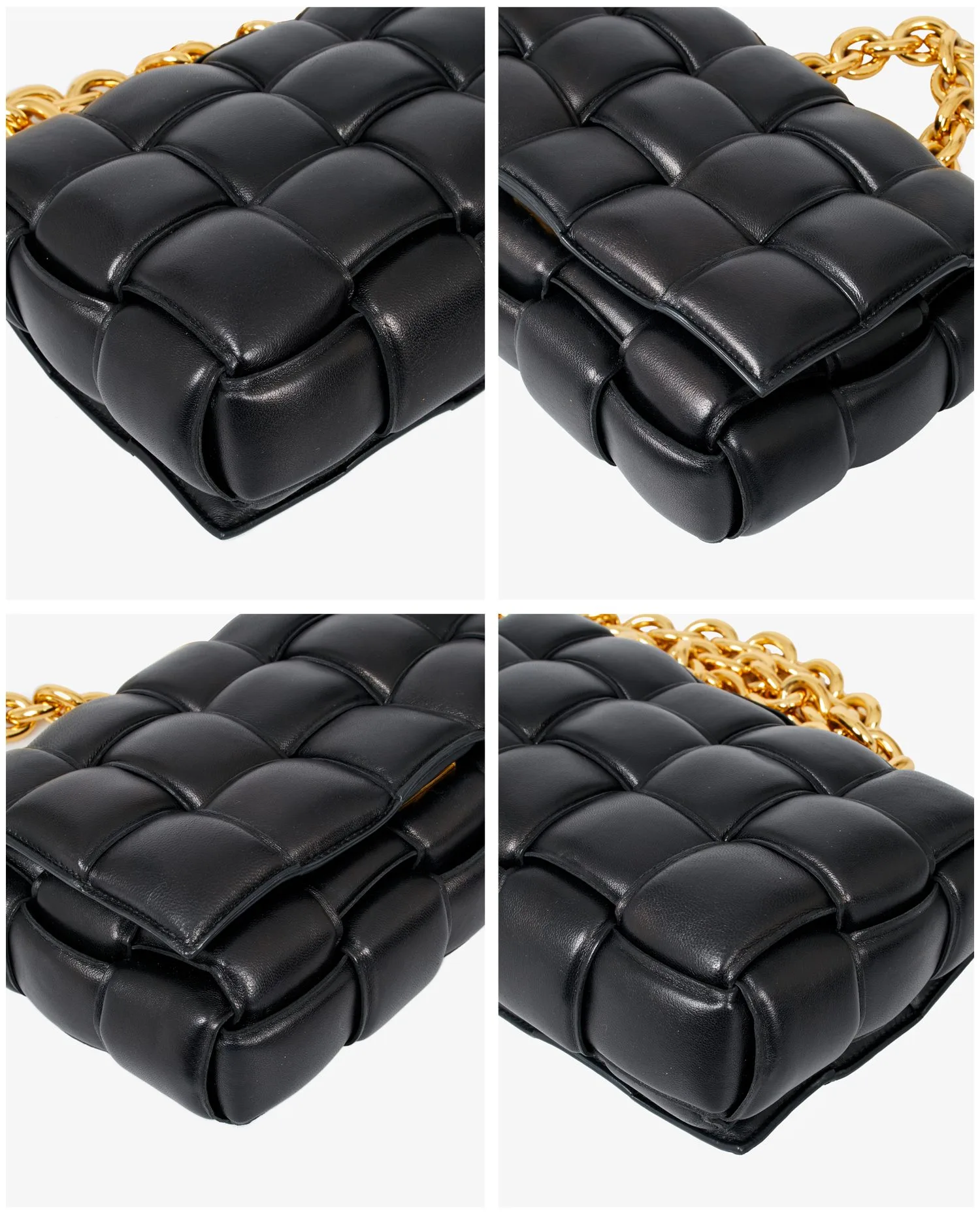 Bottega Veneta Chain Cassette bag in black quilted lambskin leather. Worn on the shoulder or crossbody with a gold chain shoulder strap featuring large links for a very vintage effect. Snap closure. In very good condition. Delivered in its original dustbag.