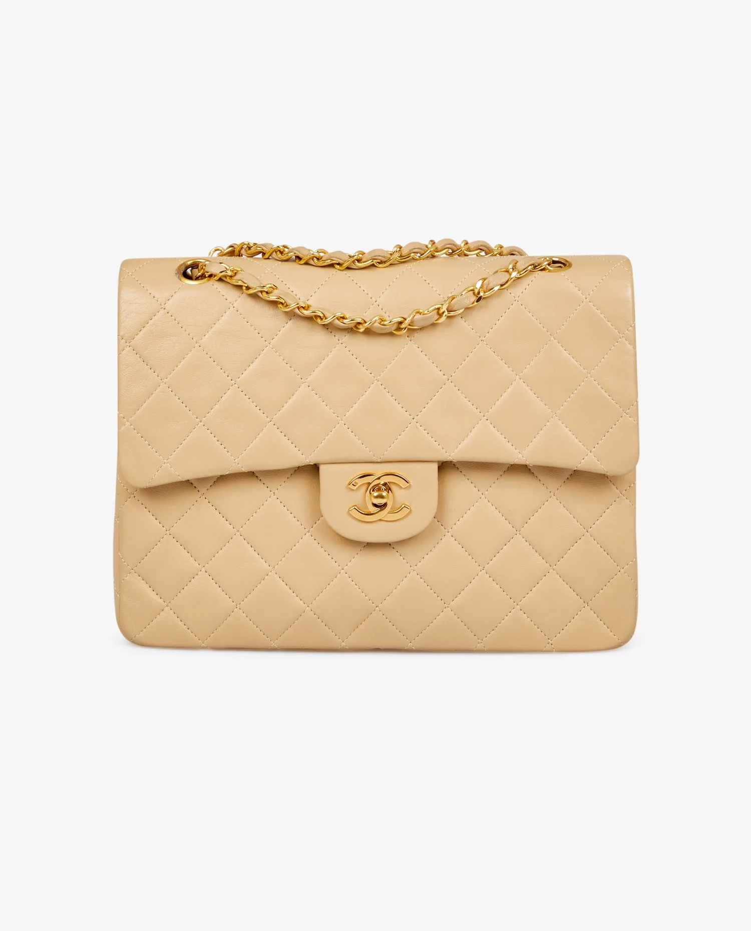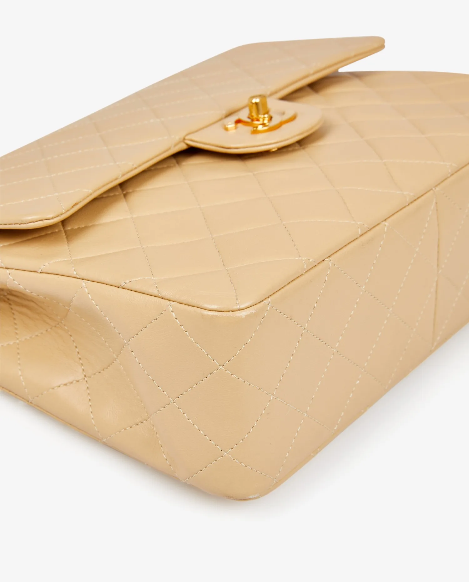 Vintage beige quilted lambskin Chanel bag. Gold jewelry. Double flap. Carried on the shoulder. The shoulder strap measures 87cm. In very good condition. Slight wear to front left ring. It will be delivered in its original Chanel box and dustbag.