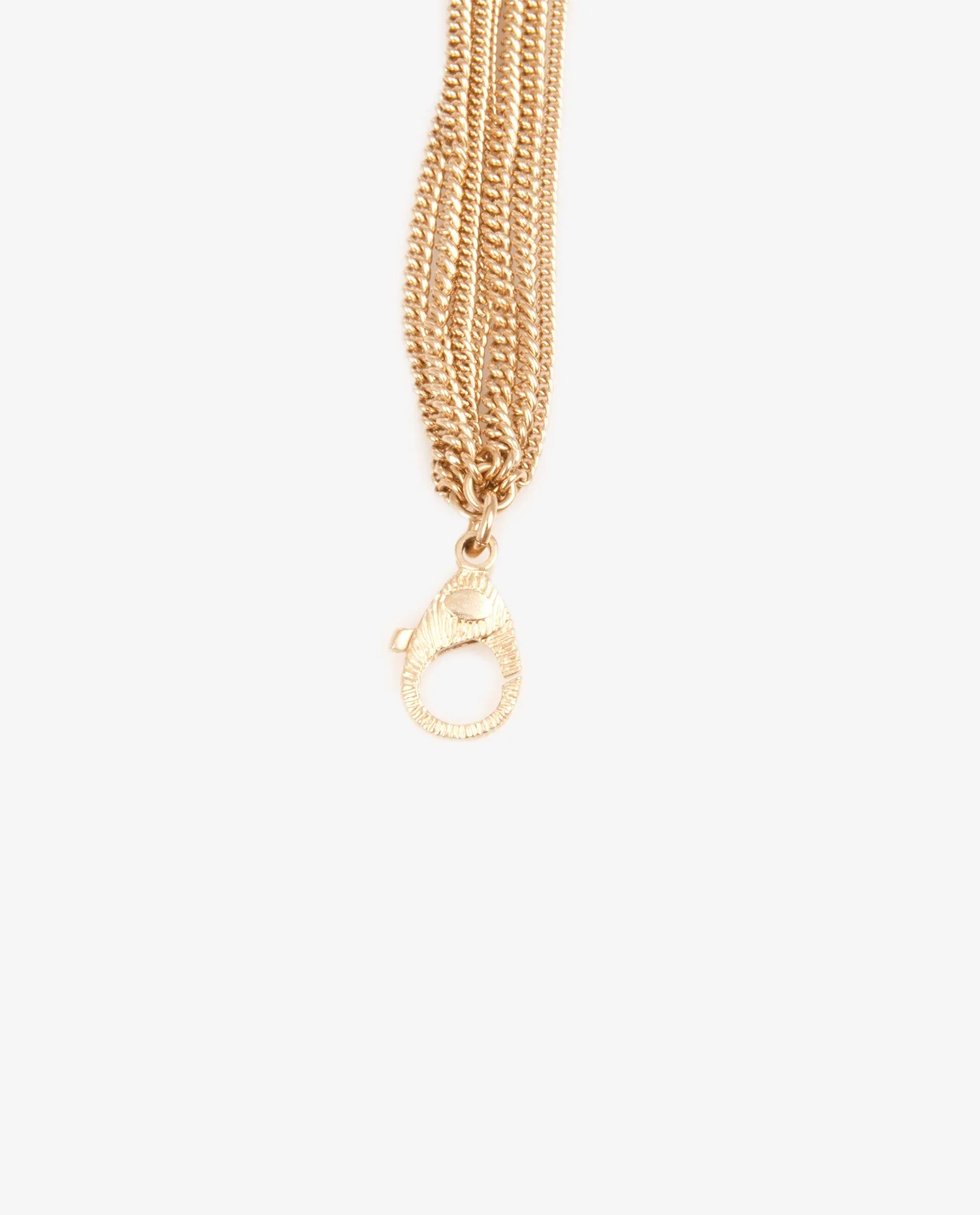 Chanel bracelet set with pearls and rhinestones in the shape of a “CC”. The fastener is made up of several gold chains closed by a snap hook. Fall/Winter 2016 collection.
