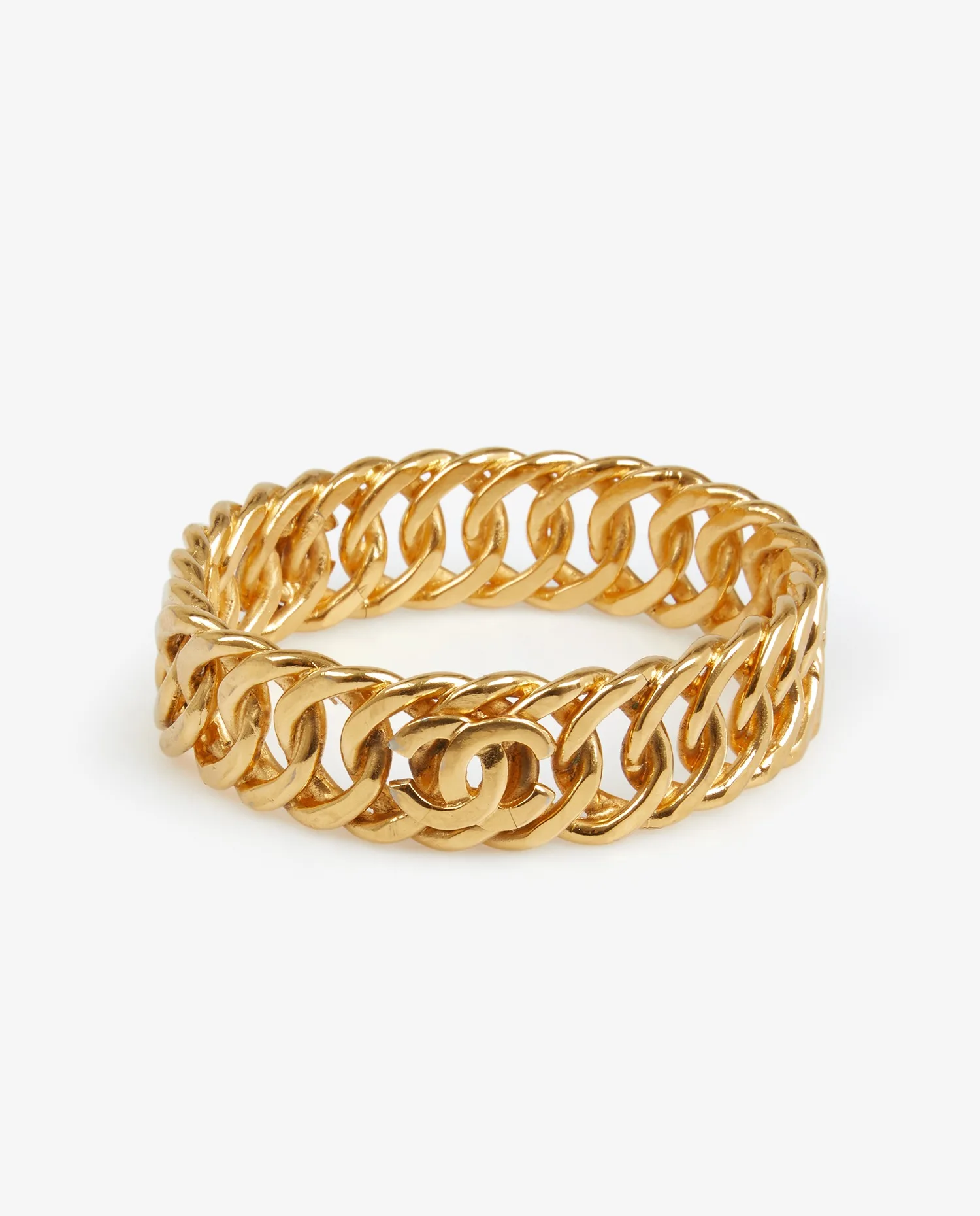 Vintage Chanel cuff in gold-plated metal. In good condition. Some wear marks are visible and some gold is missing.