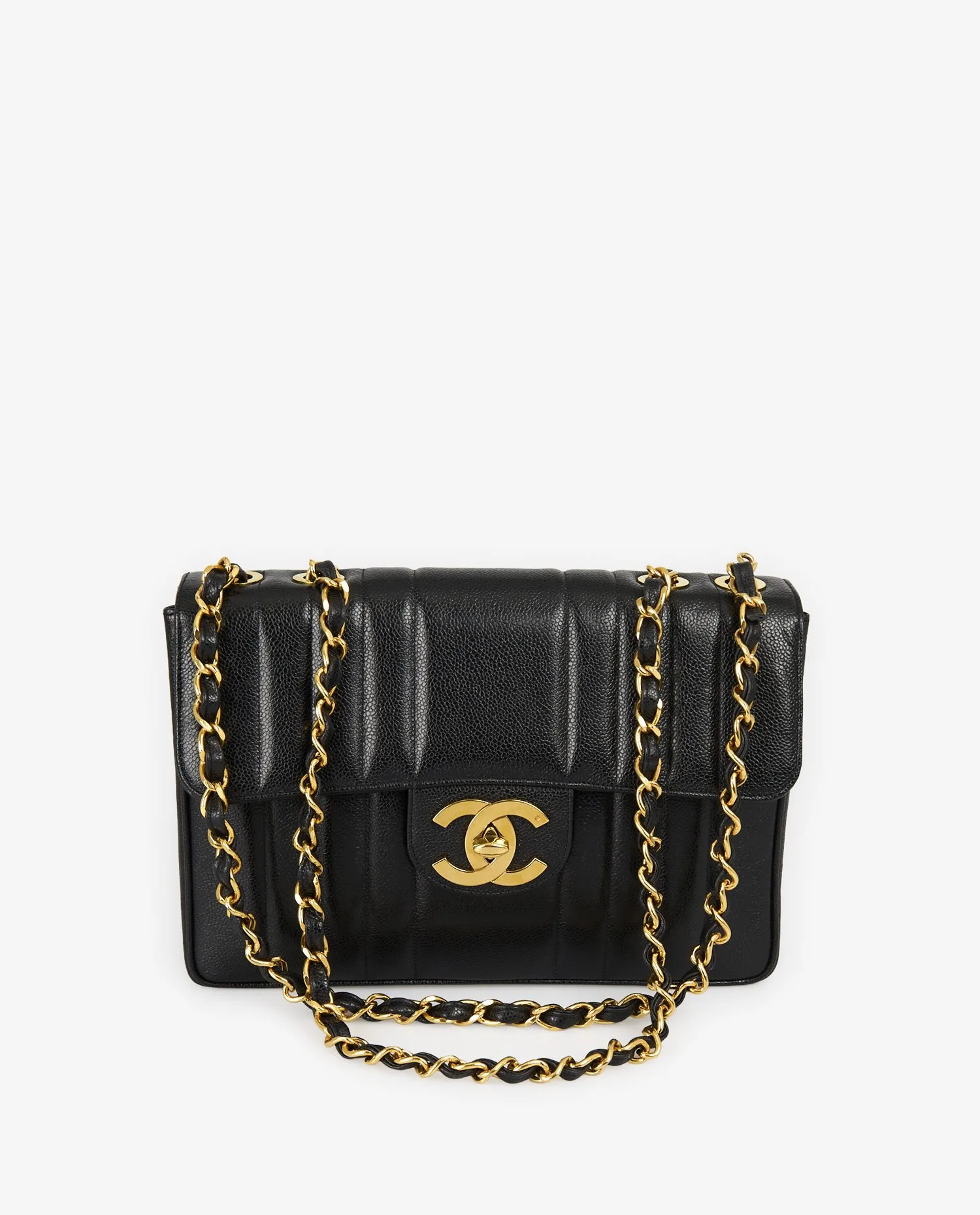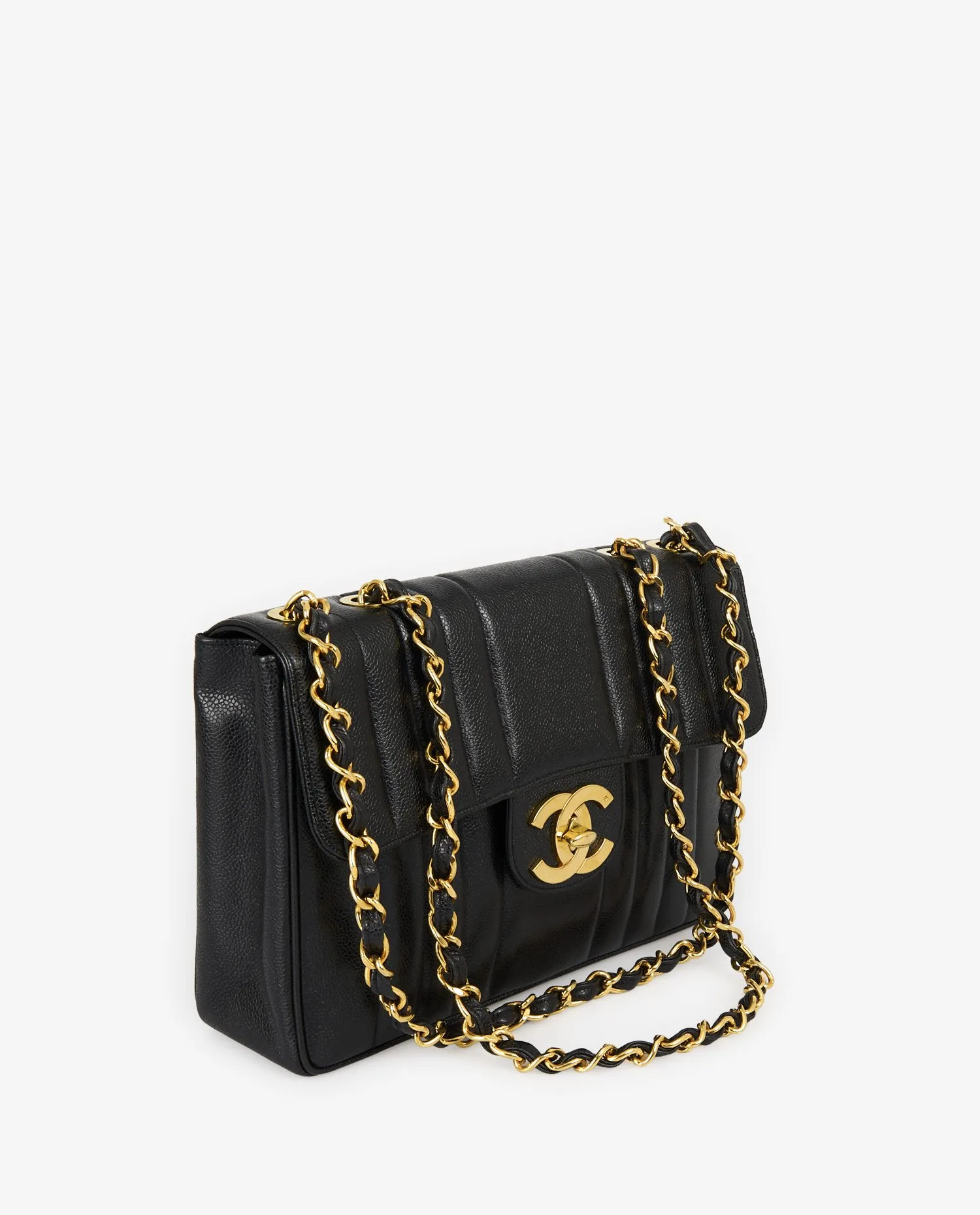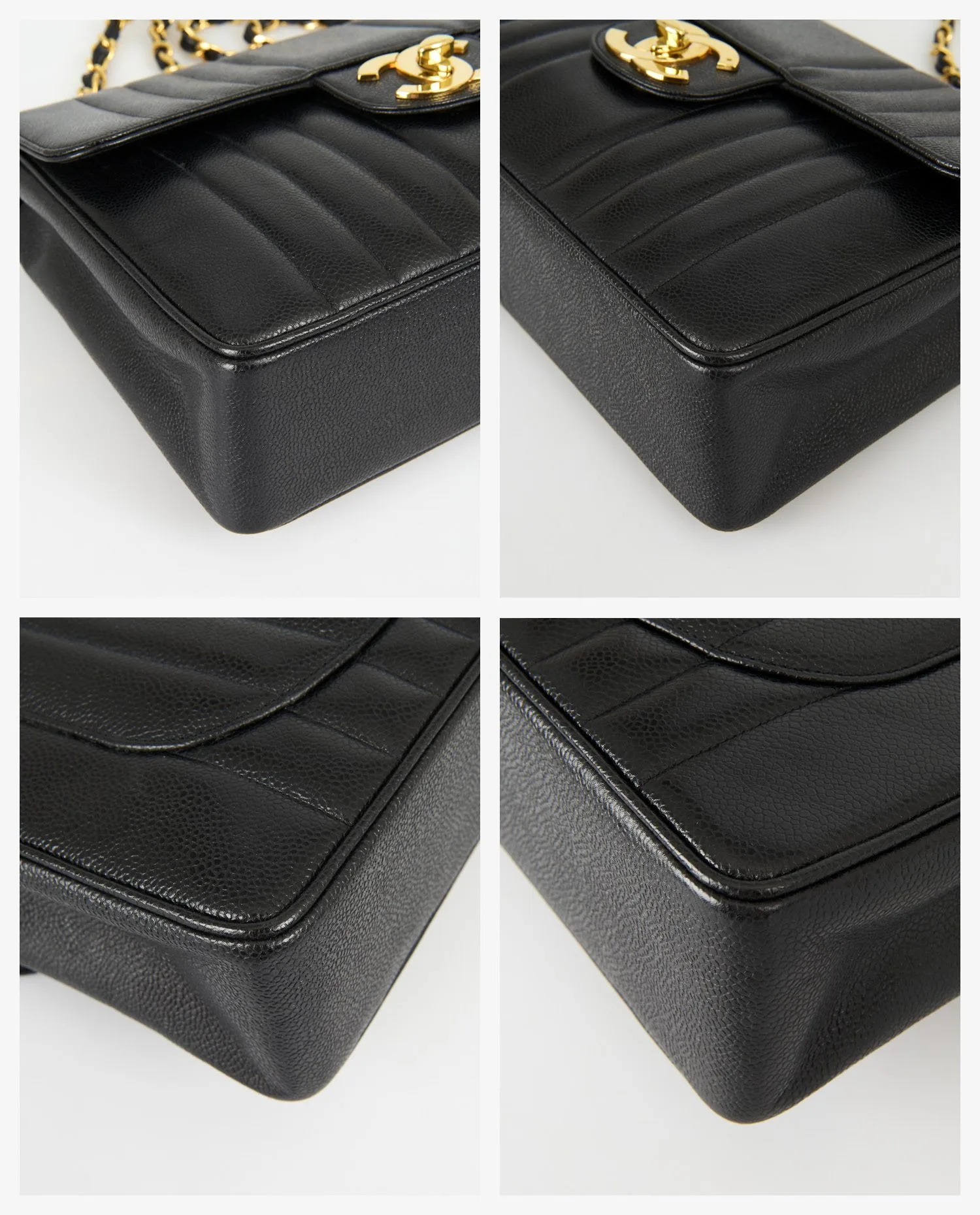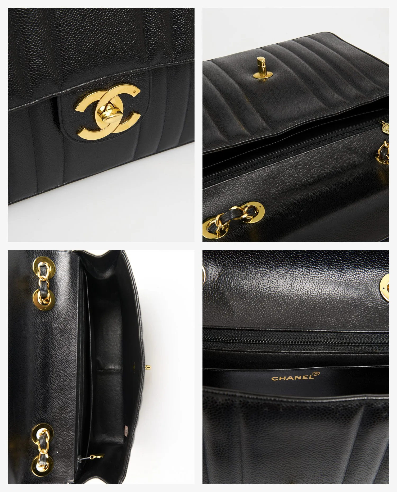 The black caviar leather outer structure features a recognizable grained texture, providing both durability and refinement. The vertical quilting gives a modern, structured look, different from the traditional diamond pattern. The pivoting double-C gold clasp catches the light brilliantly and remains one of the brand’s most identifiable elements. Dimensions are 31 cm wide, 21 cm high and 8 cm deep, offering ample capacity.