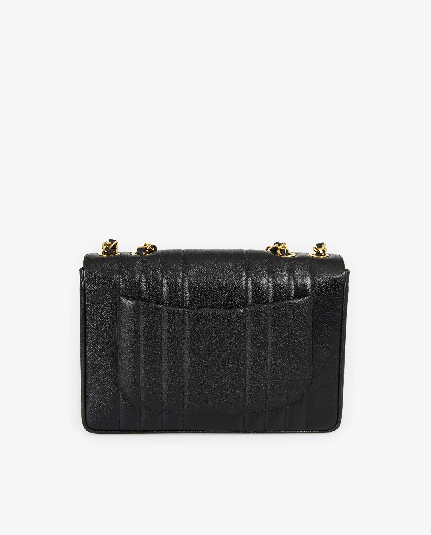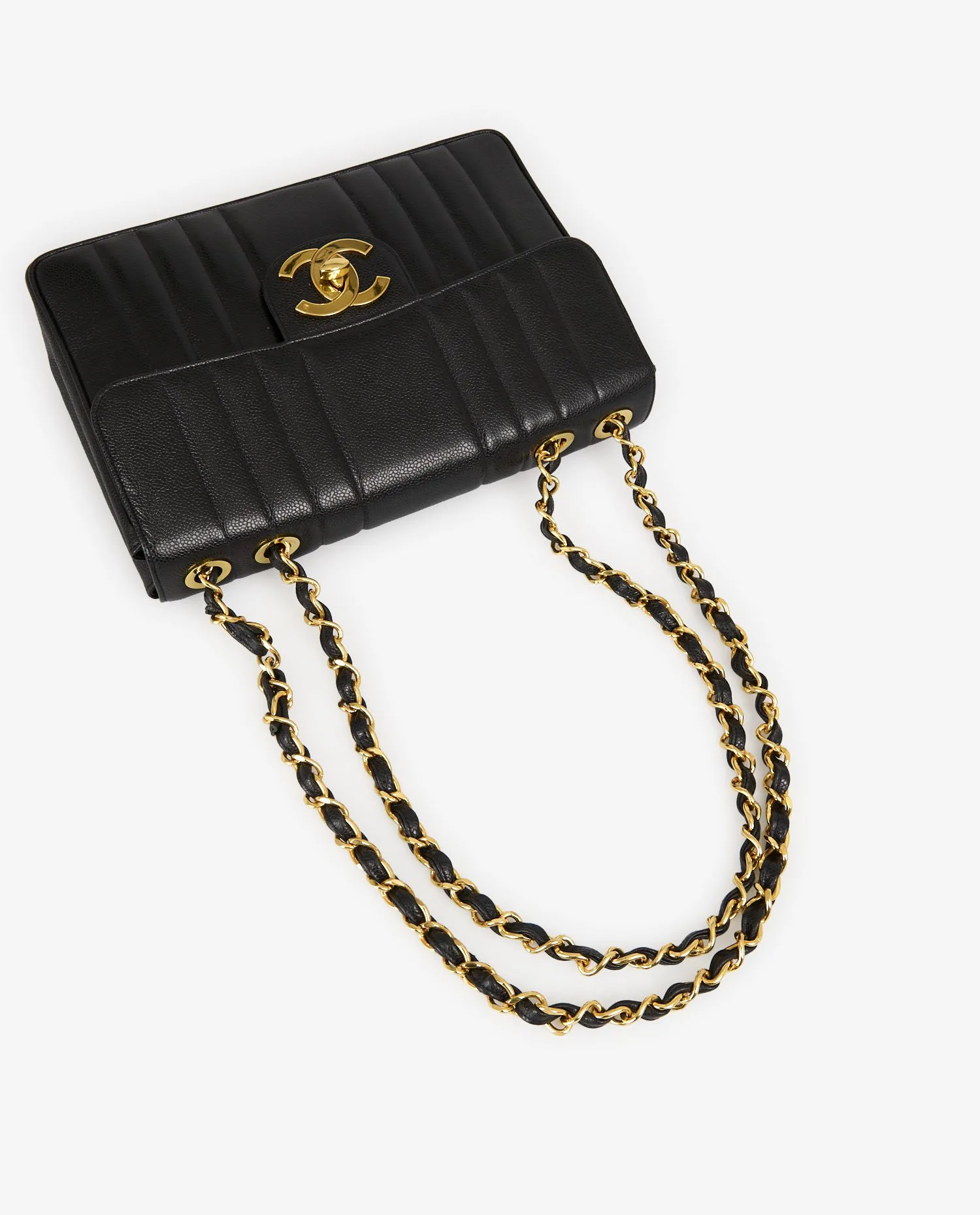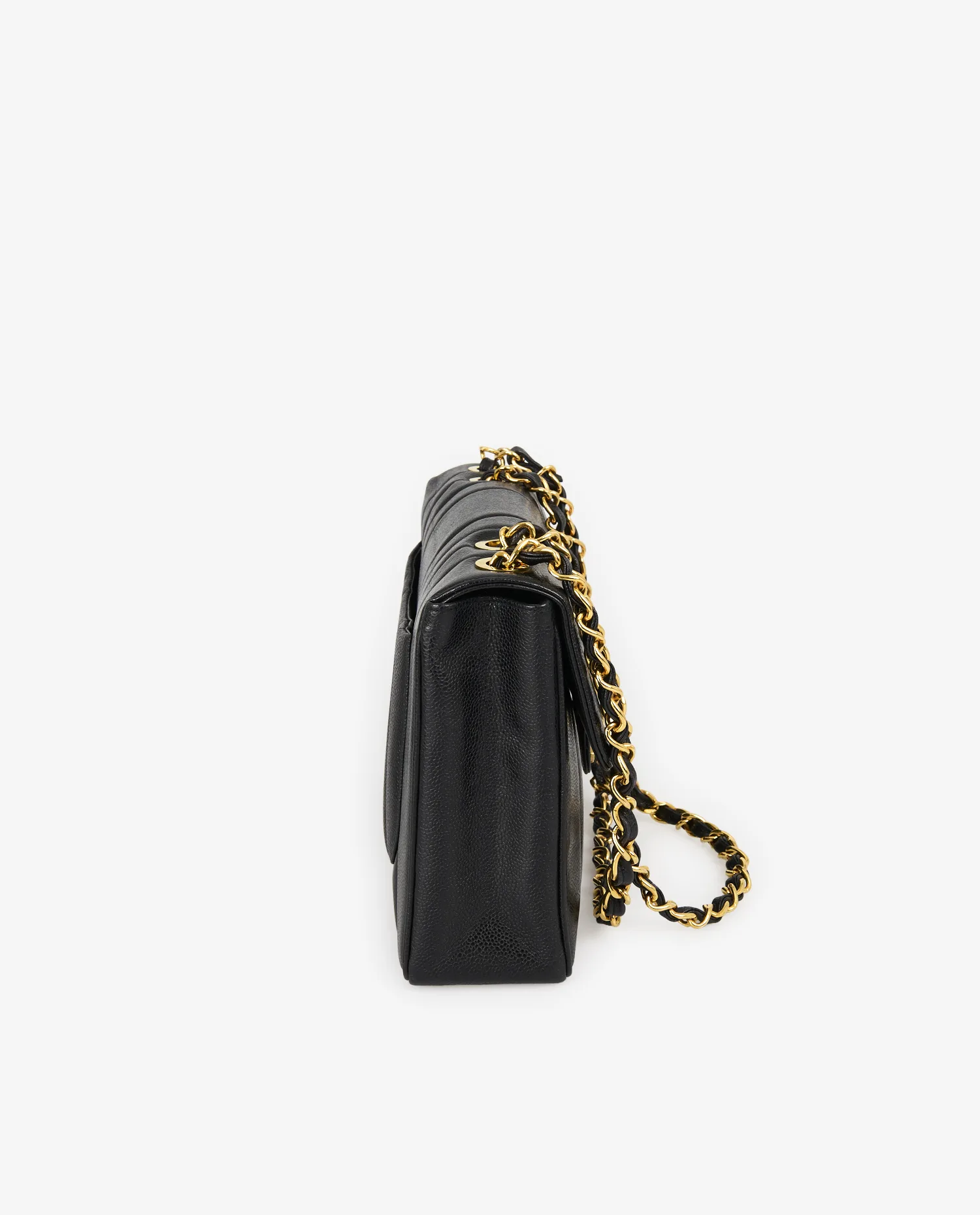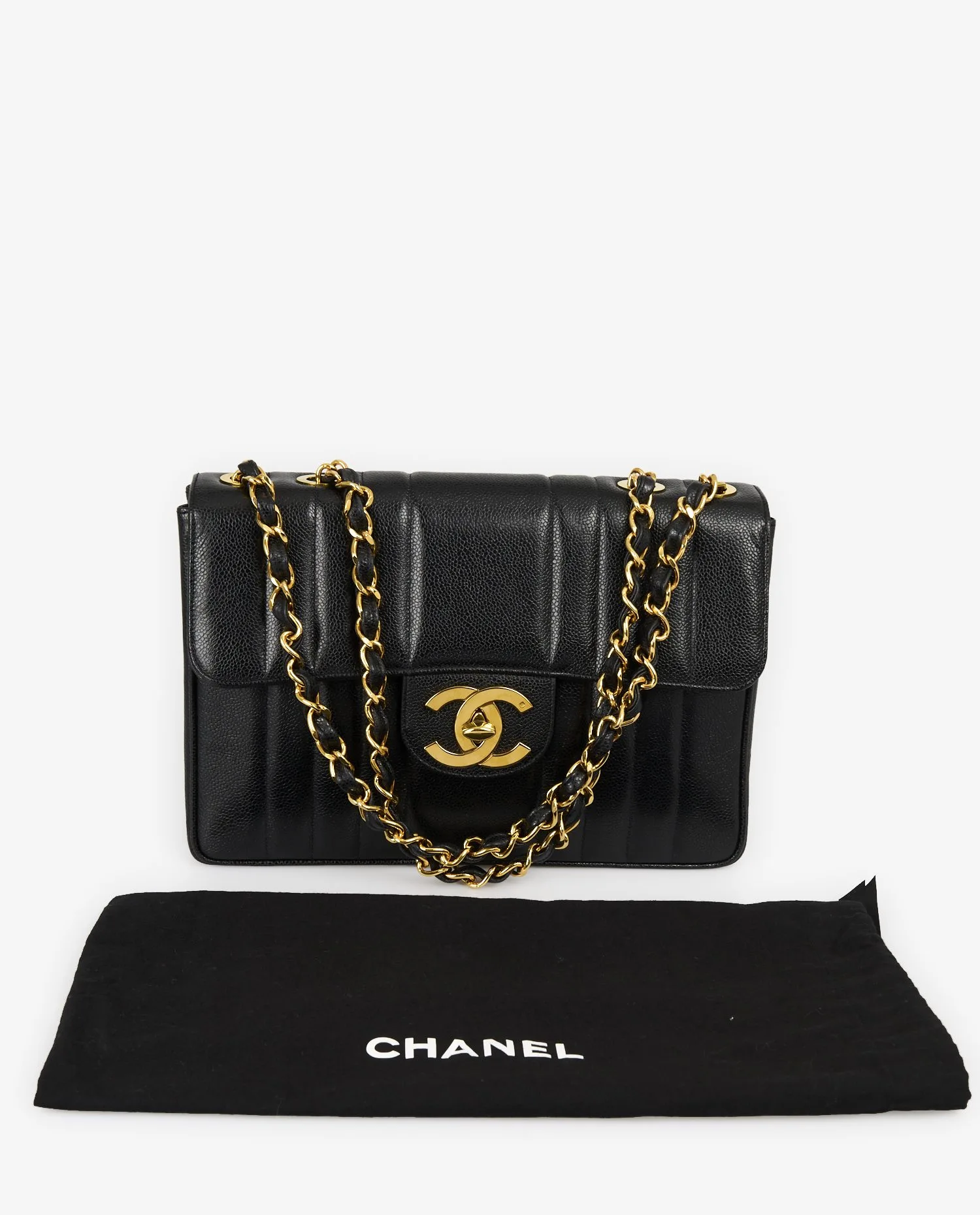 The black caviar leather outer structure features a recognizable grained texture, providing both durability and refinement. The vertical quilting gives a modern, structured look, different from the traditional diamond pattern. The pivoting double-C gold clasp catches the light brilliantly and remains one of the brand’s most identifiable elements. Dimensions are 31 cm wide, 21 cm high and 8 cm deep, offering ample capacity.