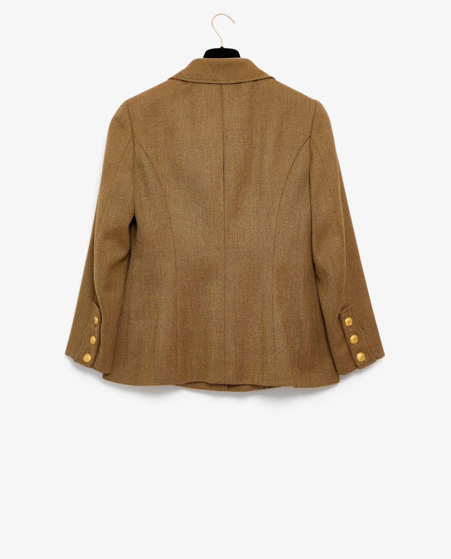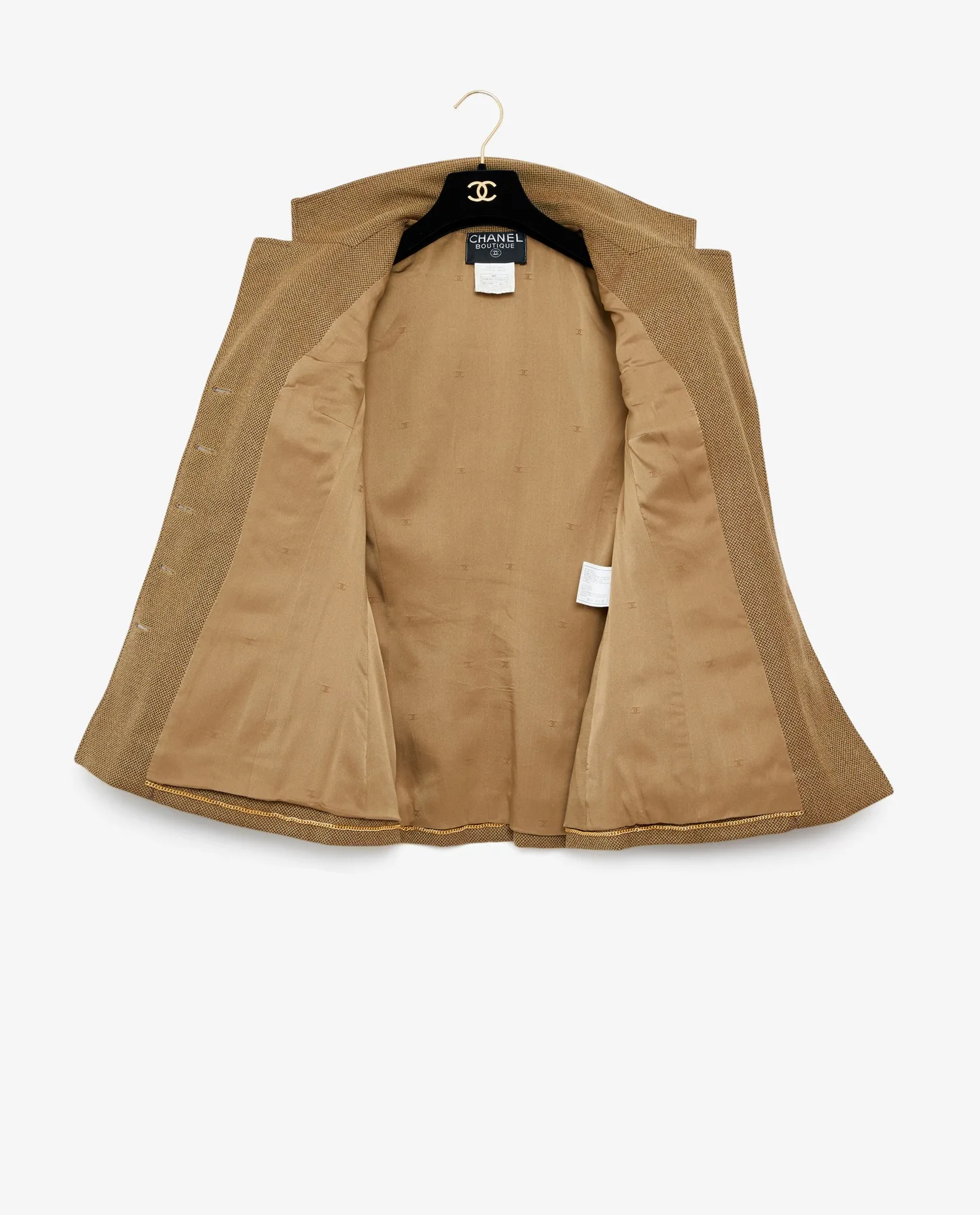 Chanel military-style jacket in khaki. Vintage. Silk lining with “CC” logo. In very good condition.