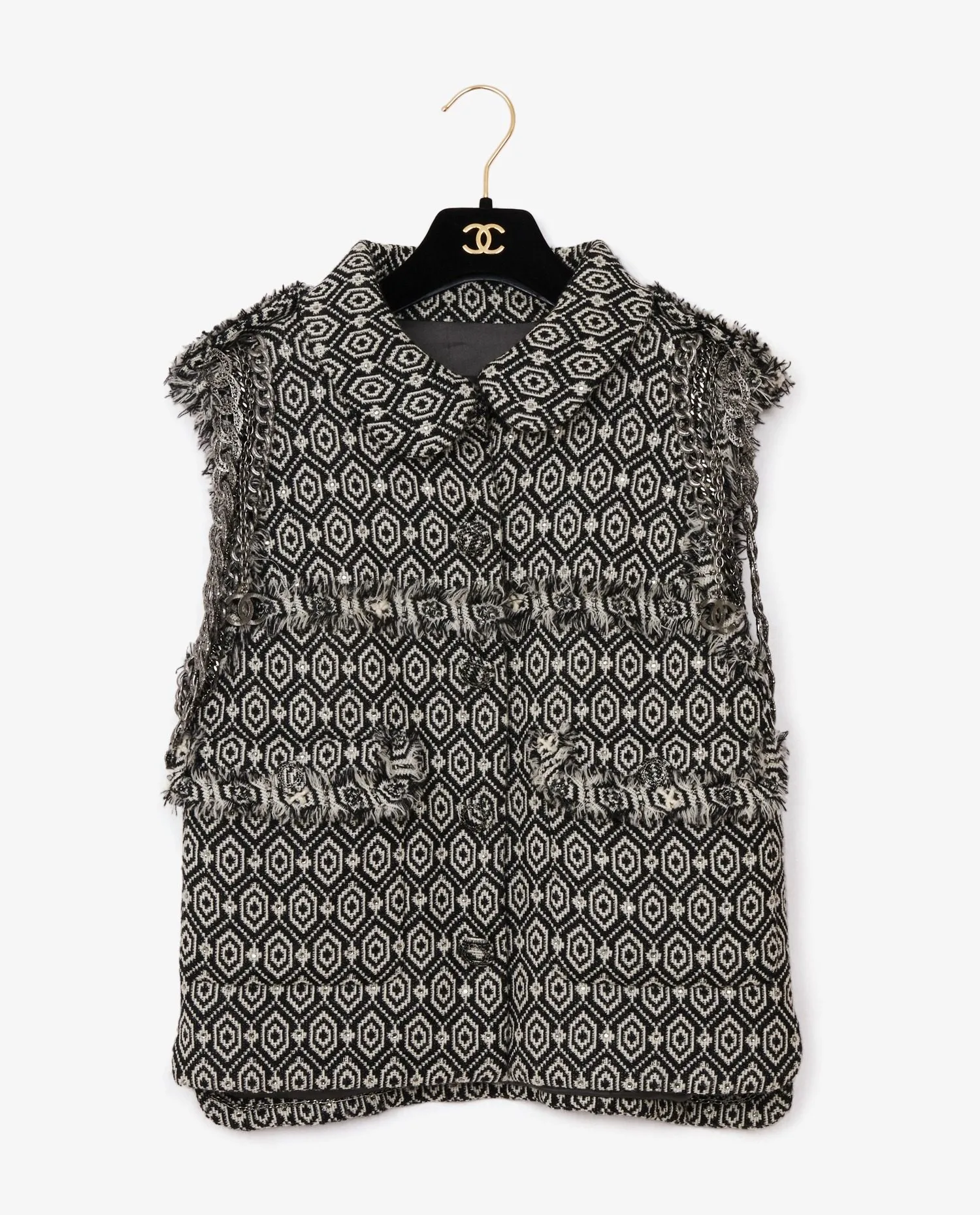 Short-sleeved jacket by Maison Chanel in black and white tweed. Chains on shoulders, London punk-inspired. Two front patch pockets. Snap closure. In very good condition.