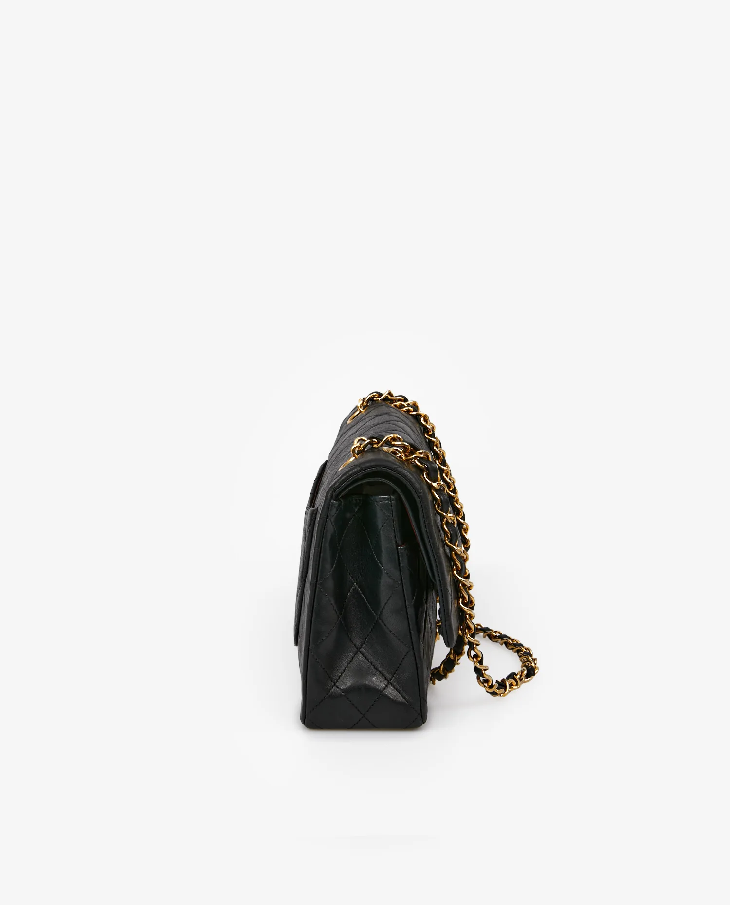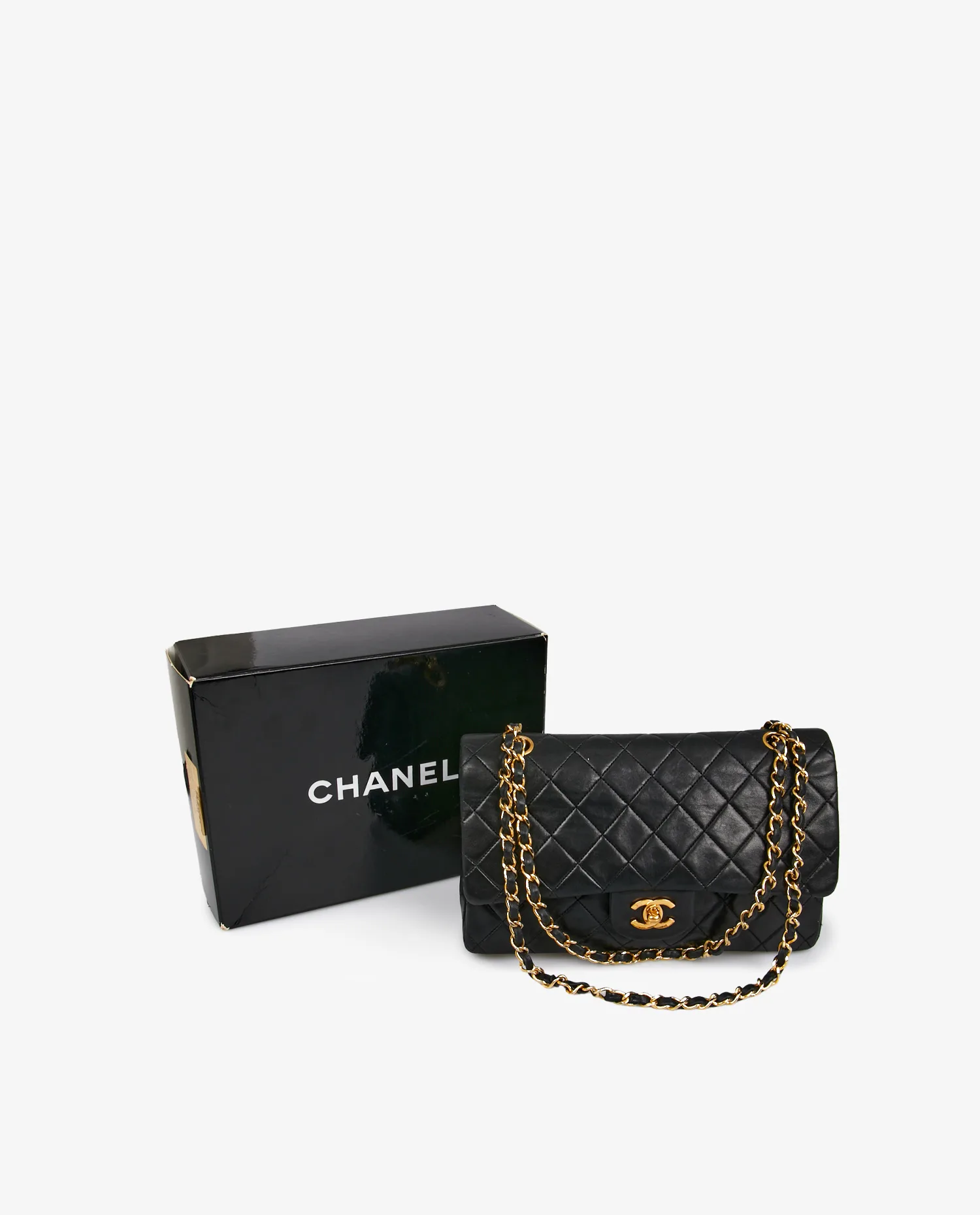 The ultimate symbol of timeless luxury, this Chanel Classic Flap in black lambskin is much more than a bag: it represents a heritage, an era and a savoir-faire. Made before 2000, when 24-carat gold plating was still used, it is highly sought-after by connoisseurs and collectors alike. Its medium format, versatile and well-balanced, is suitable for everyday use while asserting a discreet elegance. This vintage model with its original case embodies the quintessence of Chanel style, a piece to be handed down, worn and cherished.