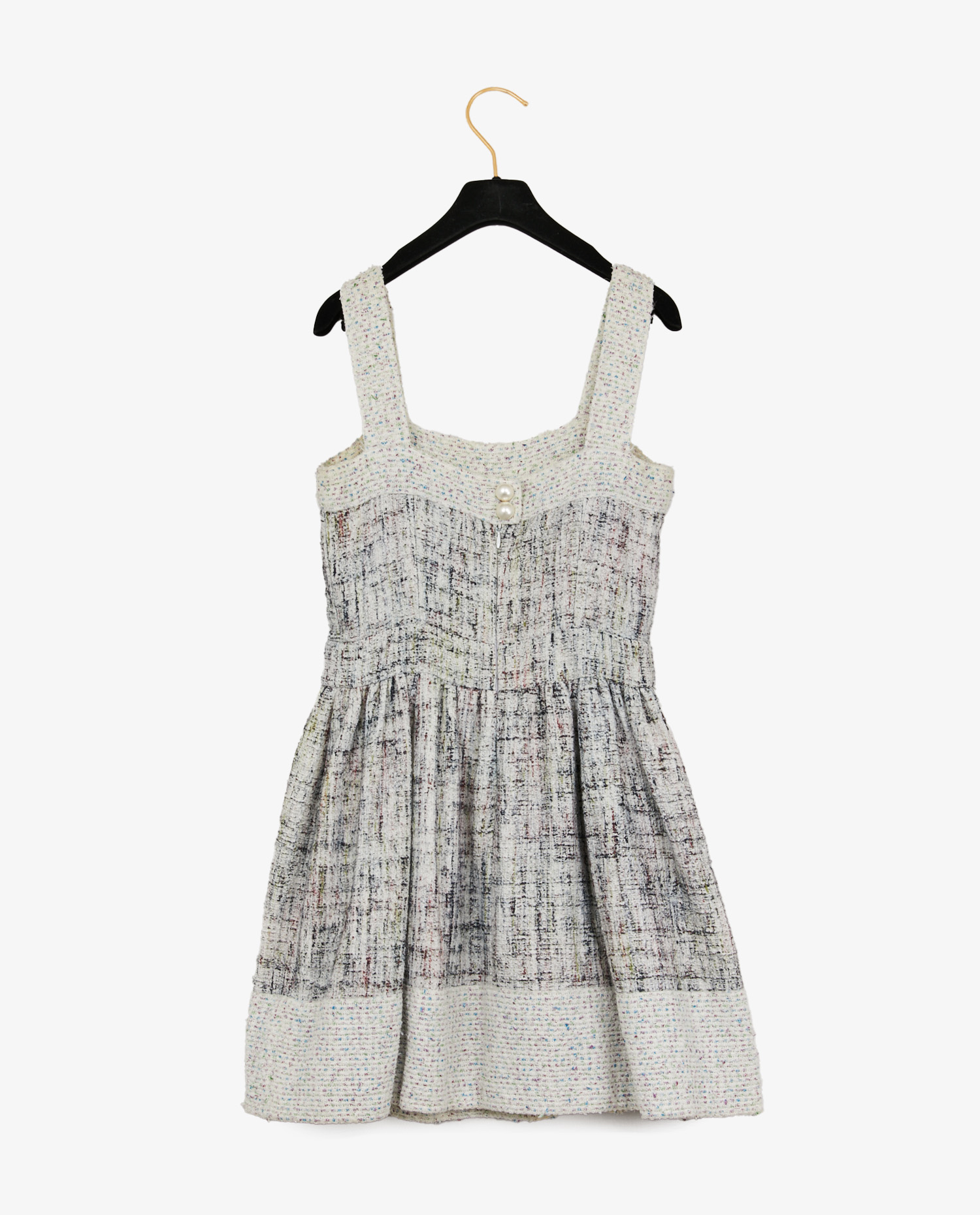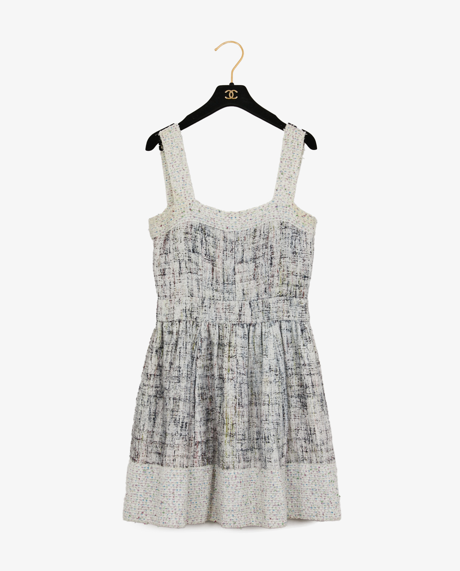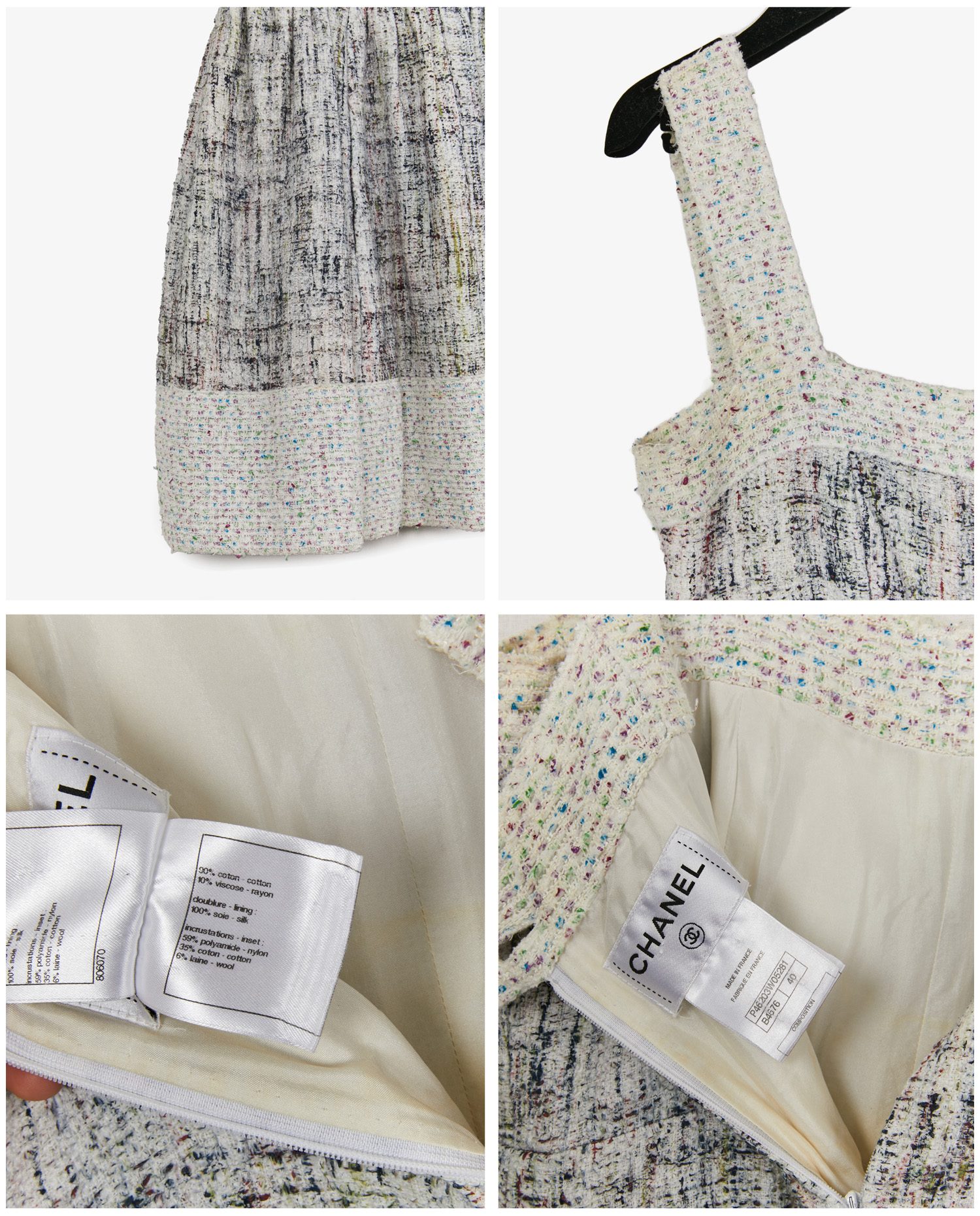 Superb tweed dress by Chanel, from the collection “Renewable Energy” collection Spring-Summer 2013. Made from 90% cotton, it comes in a cream hue, subtly accented with touches of green, blue, pink, violet and red. At the back, a concealed zipper ensures an impeccable fit, complemented by two white pearl semicircle buttons engraved with “Chanel”. Fully lined in cream silk.