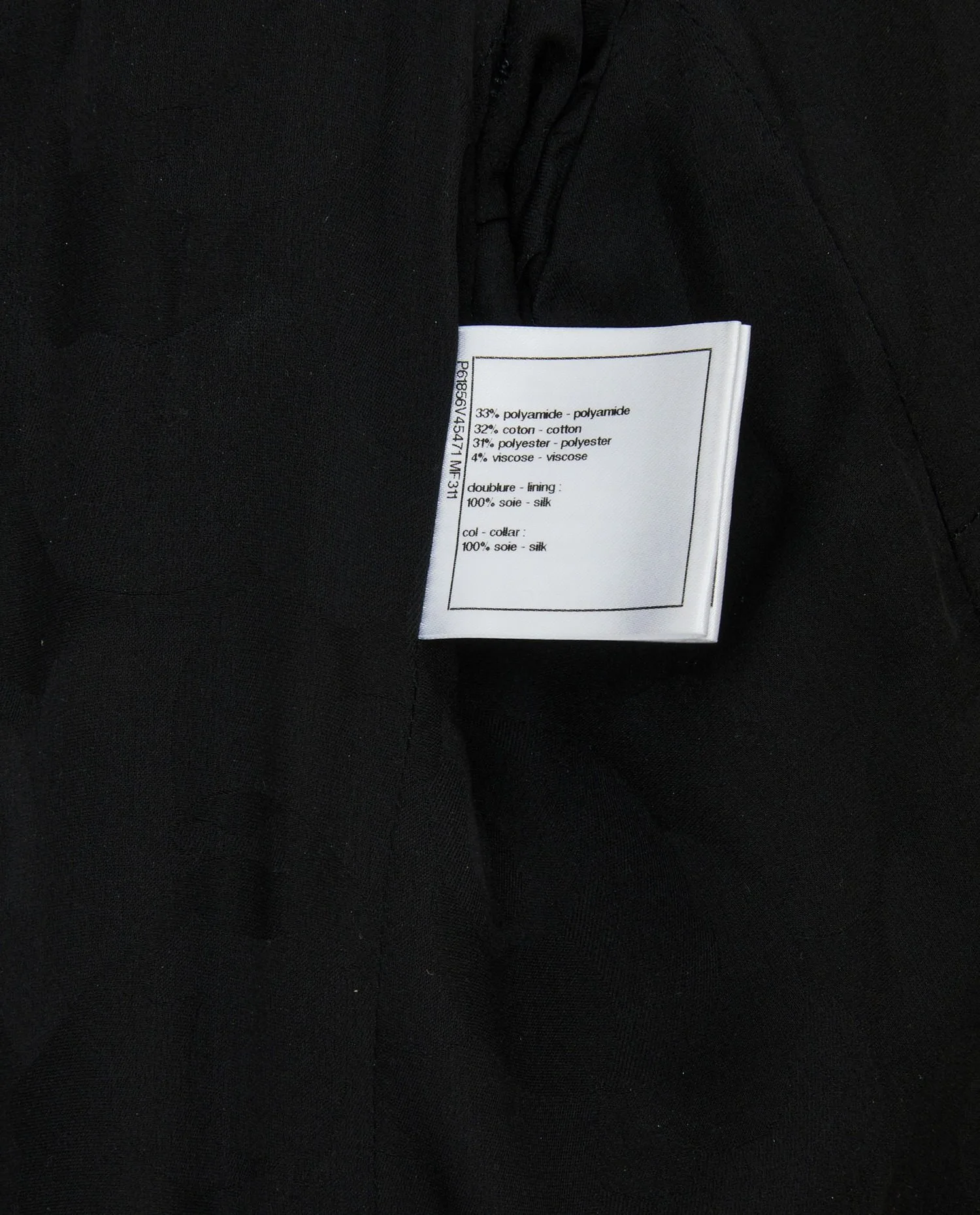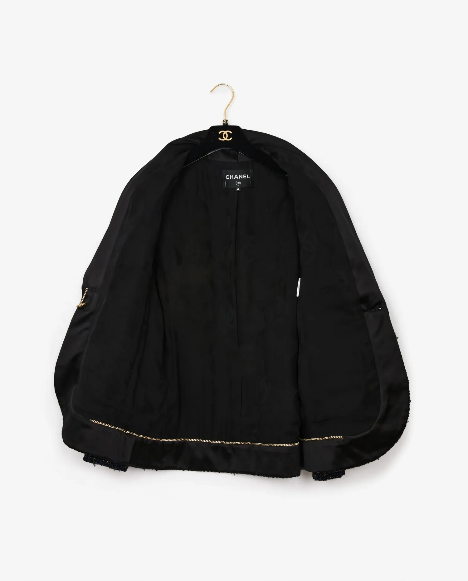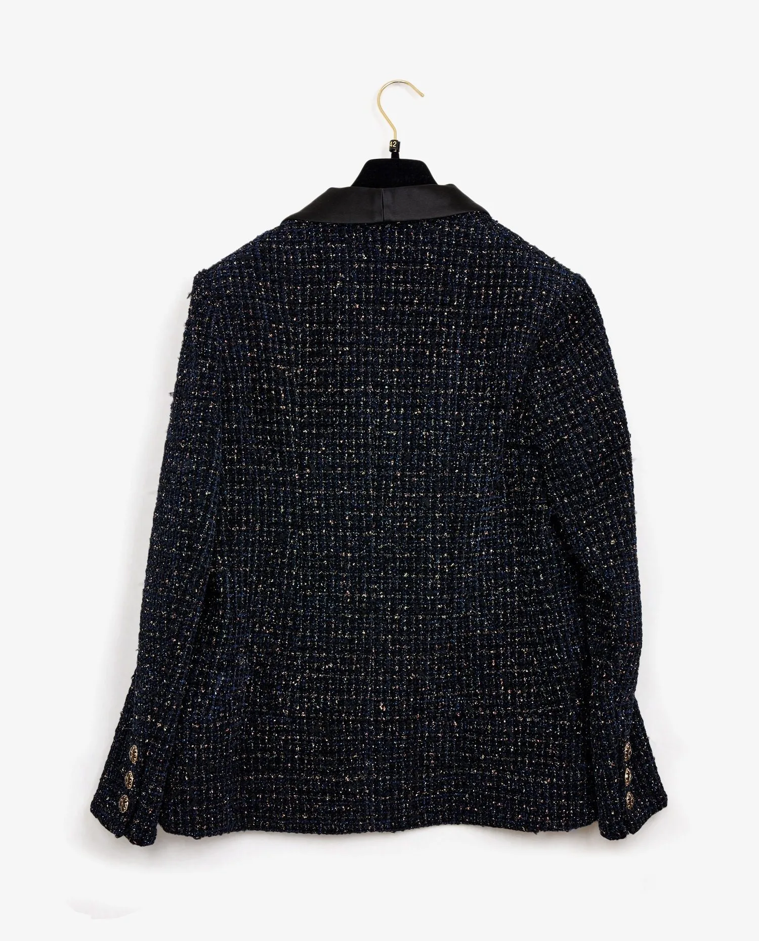 Chanel jacket in navy blue tweed with gold sequins. Size 42. The collar is in black satin. The buttons are made of resin in the shape of flowers with the CC logo. The lining is silk.