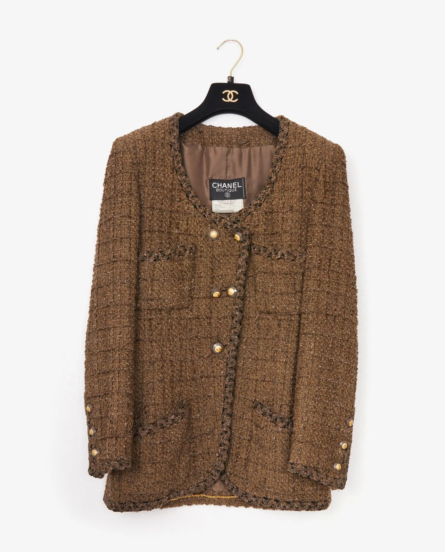 Chanel jacket in vintage brown tweed. Gilded CC buttons. Silk lining. In very good condition.