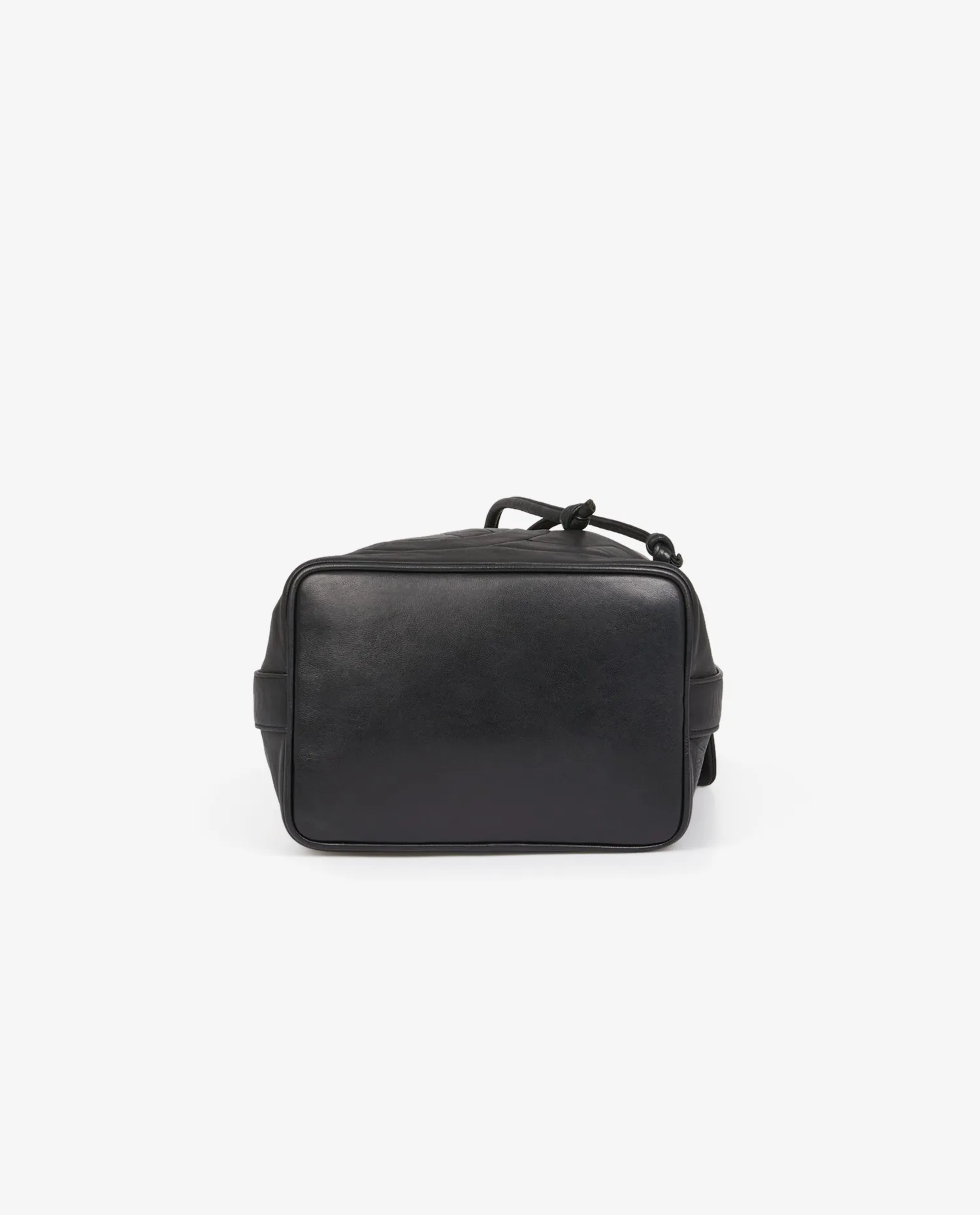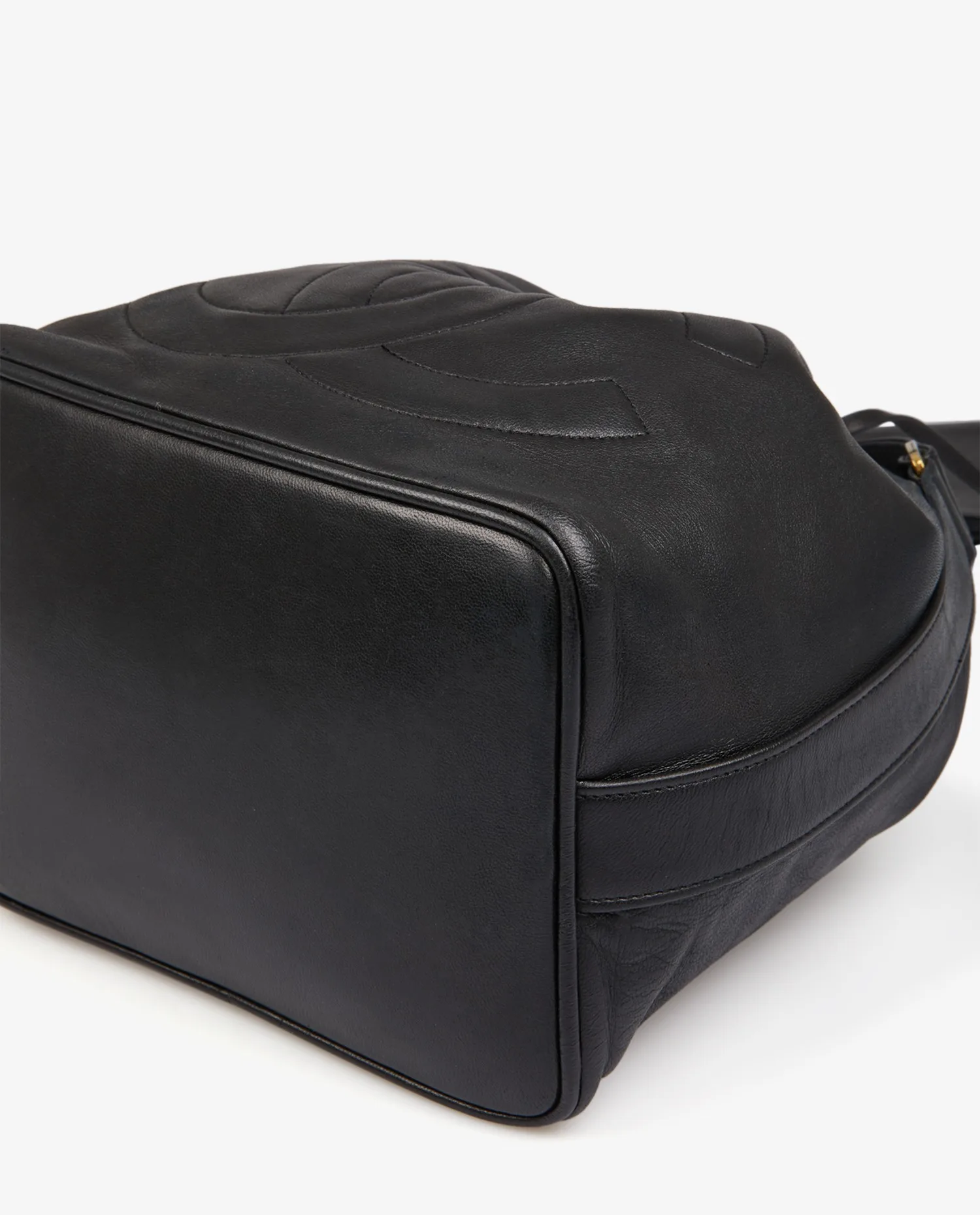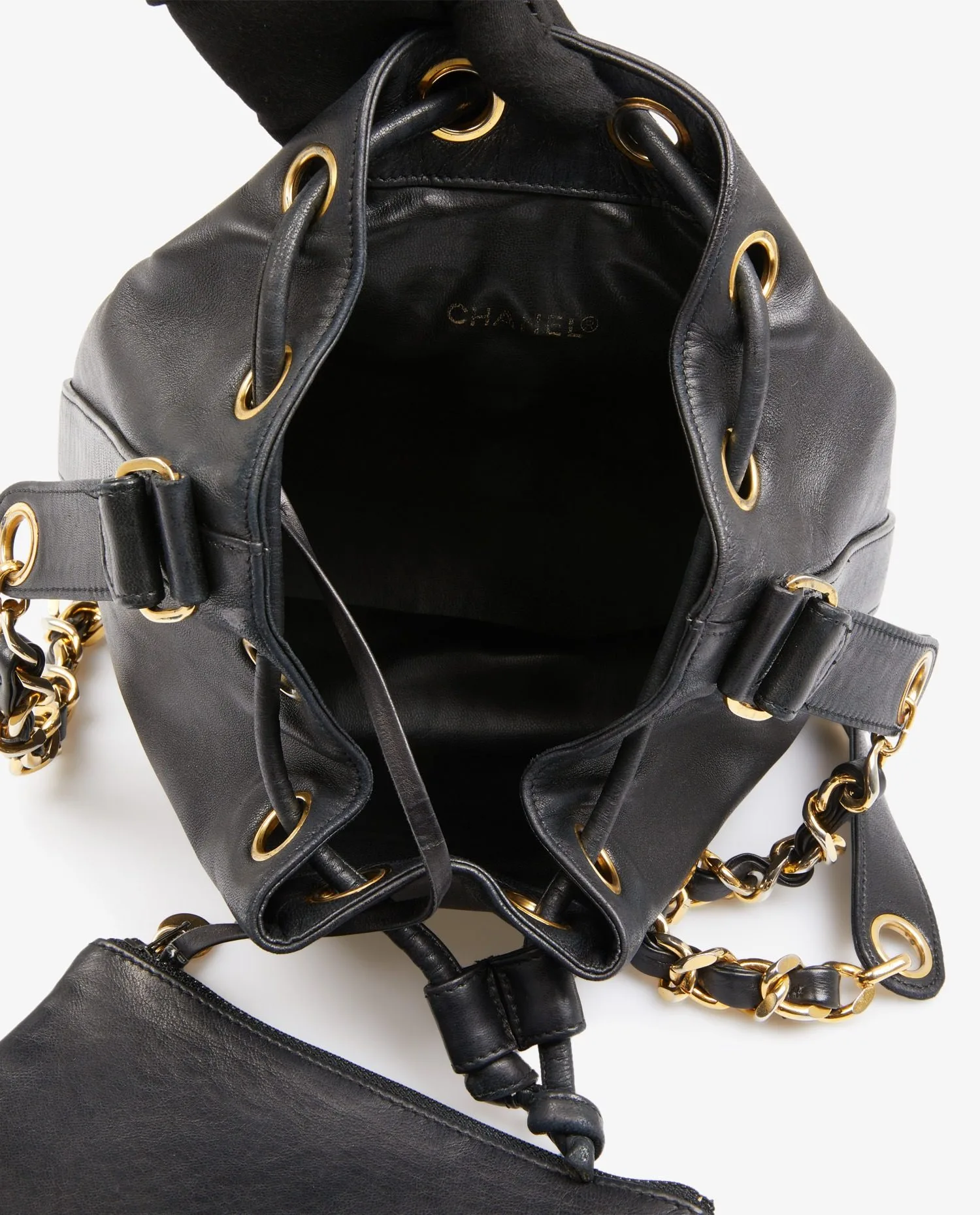 Chanel purse bag in black lambskin. Carried on the shoulder or crossbody (101 cm). Leather tie closure. In very good condition.