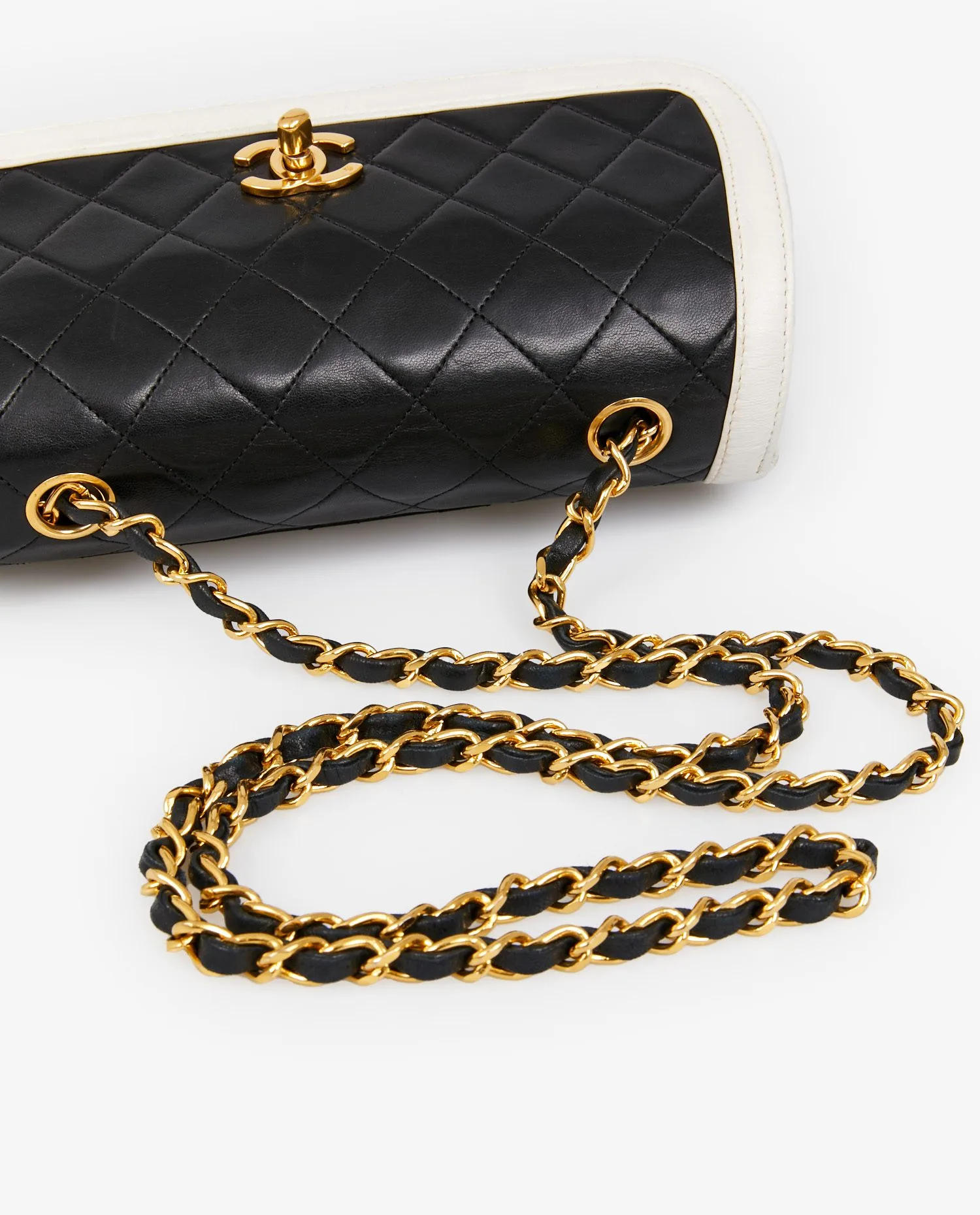 This vintage Chanel bag in two-tone black and white lambskin, dated between 1989 and 1991 (serial number starting with 1), is a rare and precious piece, emblematic of the house’s timeless elegance. Its classic lines are enhanced by a strong, refined chromatic contrast: the bag’s black quilted leather body is framed by smooth white leather trim, creating a clean, graphic visual effect. The intertwined double-C clasp is made of 24-carat gold-plated metal, as are all the metal parts of the bag, a detail exclusive to Chanel models produced before 2008. The intertwined chain of leather and gilded metal can be worn on the shoulder or cross-body, while the compact, structured silhouette retains a precious allure. The bag comes with its original card and Chanel-stamped dustbag, underlining the rarity of this collector’s item.