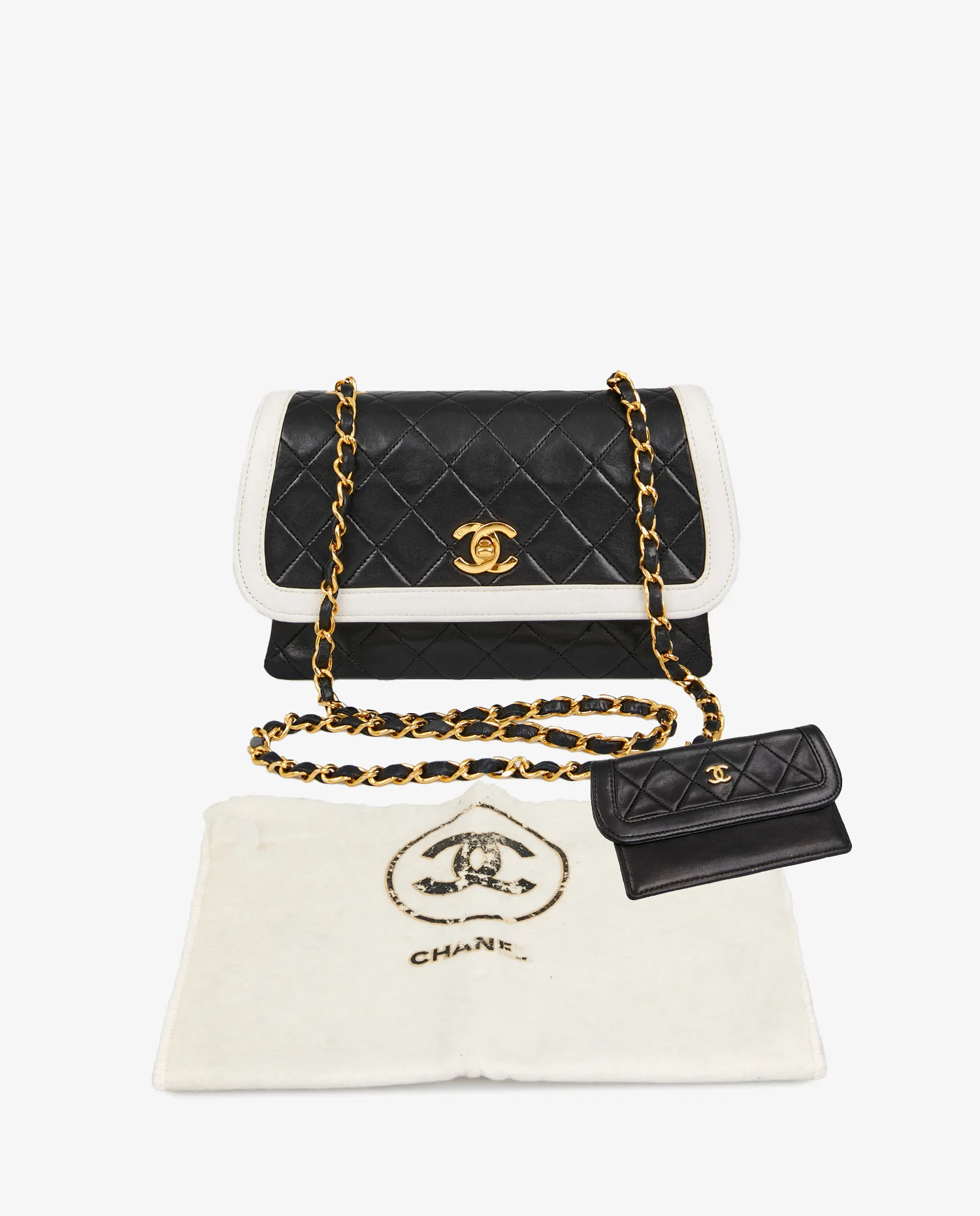 This two-tone black and white vintage Chanel bag, dating from the late 80s, combines all the attributes of an exceptional piece: timeless design, noble materials, 24k gold jewelry, and rarity reinforced by the presence of all its original accessories. It embodies an era when every detail was thought through with exacting care, under the creative direction of Karl Lagerfeld. For Chanel enthusiasts, collectors or lovers of bags with a strong, historic character, this model is a rare and precious choice, at the crossroads of fashion history and contemporary elegance.
