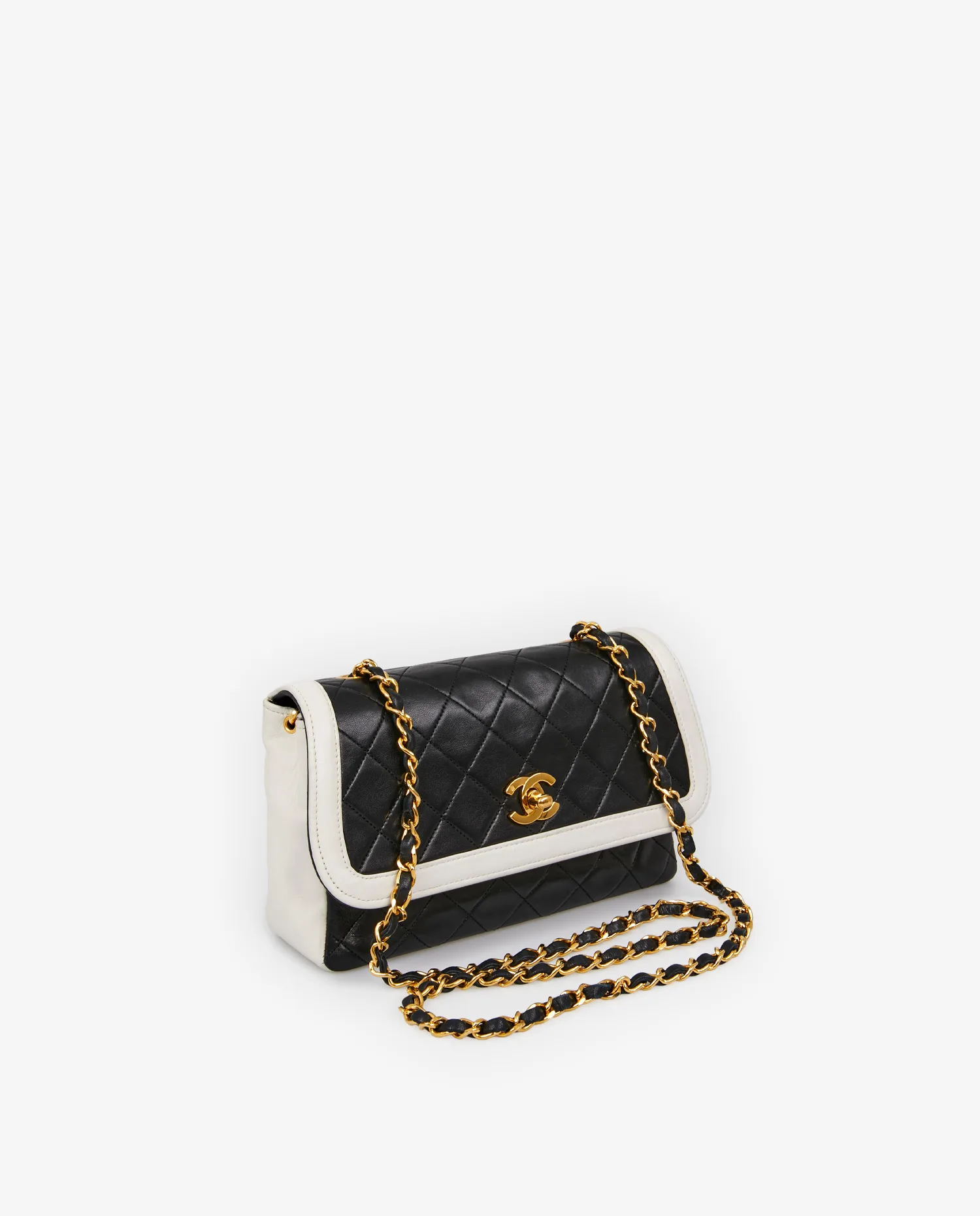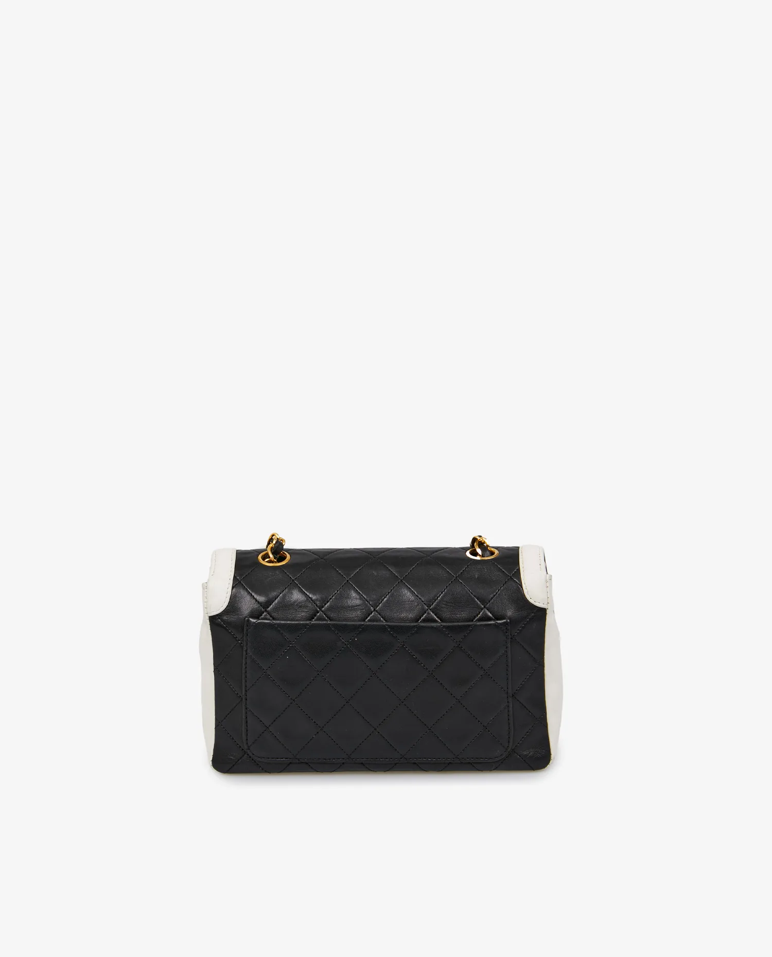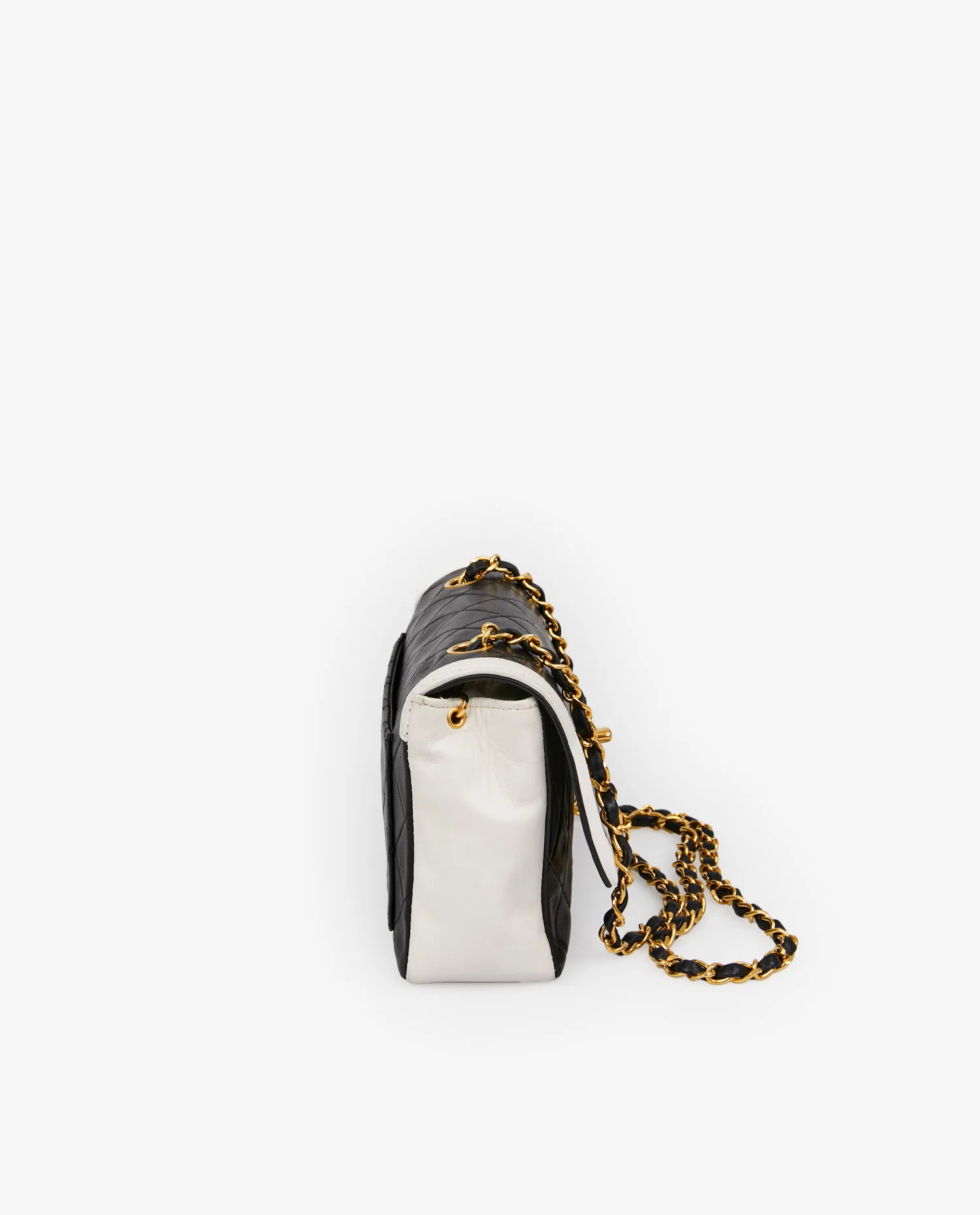 The bag’s structure is rigid, with a black lambskin leather body quilted in the house’s signature diamond pattern. The flap, sides and base are highlighted by a smooth white leather frame, bringing luminosity and graphic tension to the whole. The gold-plated clasp features the emblematic double C, plated in 24k gold with a shiny finish. The chain is in gold metal interwoven with supple yet solid black leather, allowing for adjustable shoulder carrying. On the back, a flat outside pocket offers additional functional space. Seams, corners and quilting are perfectly preserved, testifying to meticulous care.