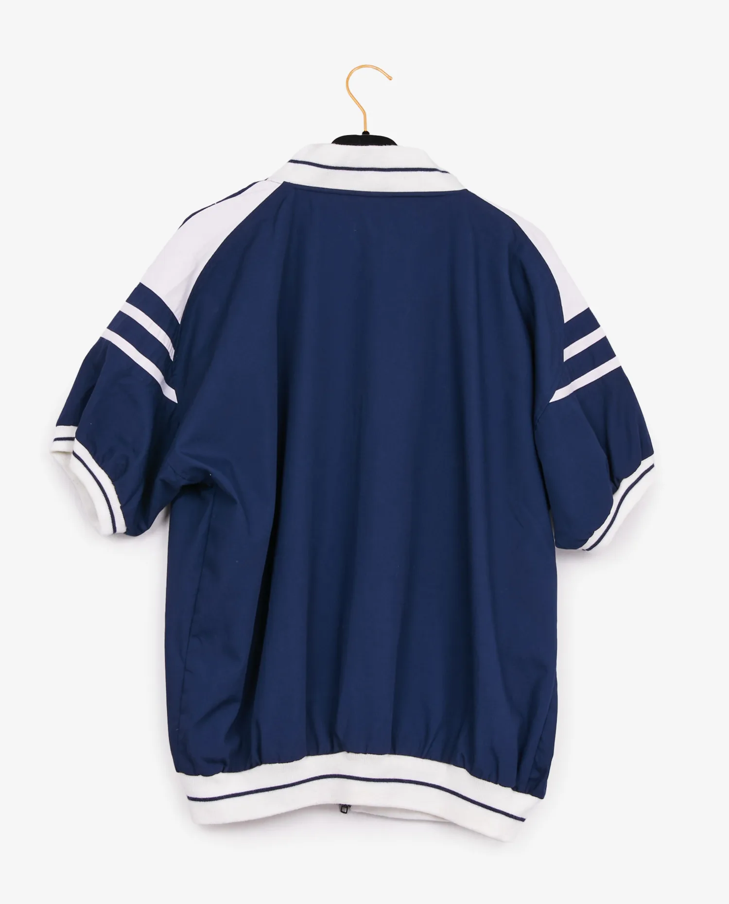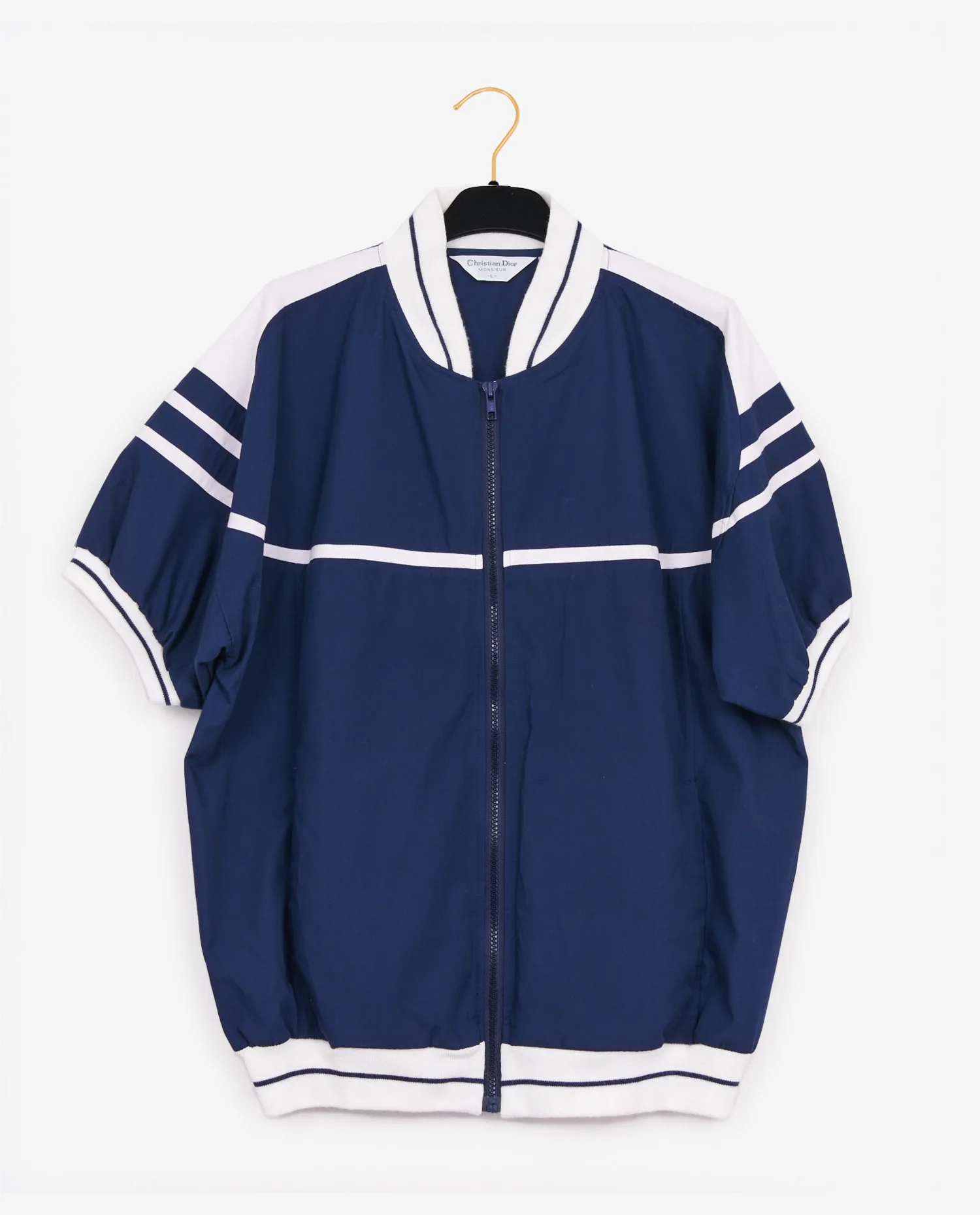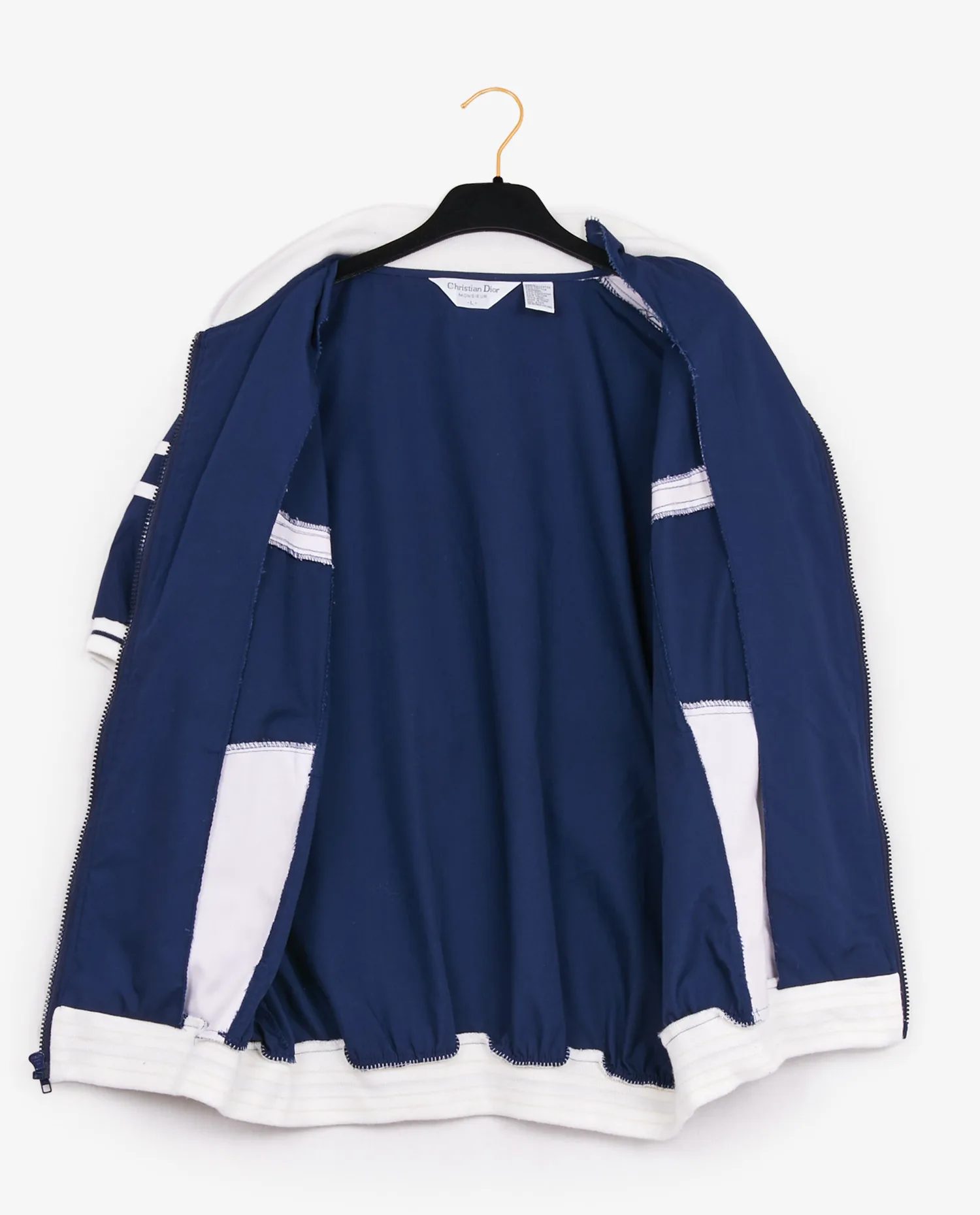 The exterior is dominated by a deep navy blue hue, punctuated by white stripes on the raglan sleeves and bust, providing a balanced visual structure. The stand collar, cuffs and hem are in white ribbed knit with blue piping, ensuring a snug fit while evoking the retro codes of luxury sportswear. The tonal zip fastening is discreet, and the integrated side pockets add a practical dimension to the ensemble.