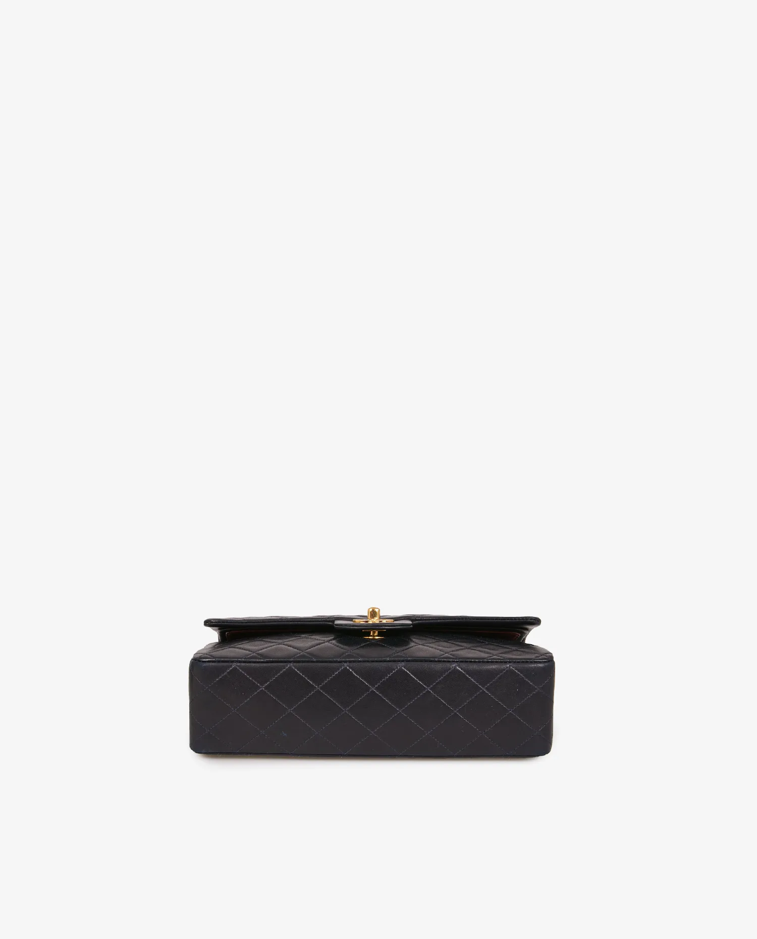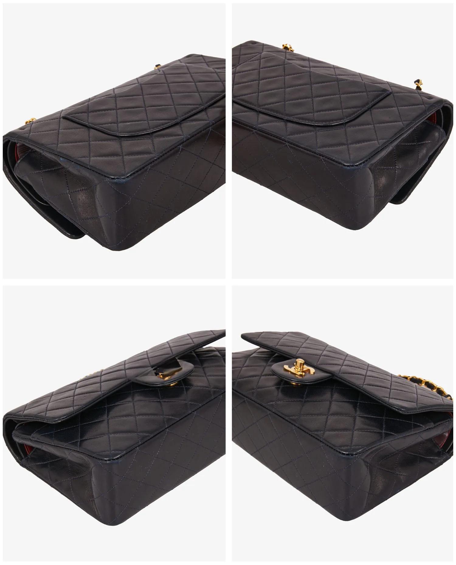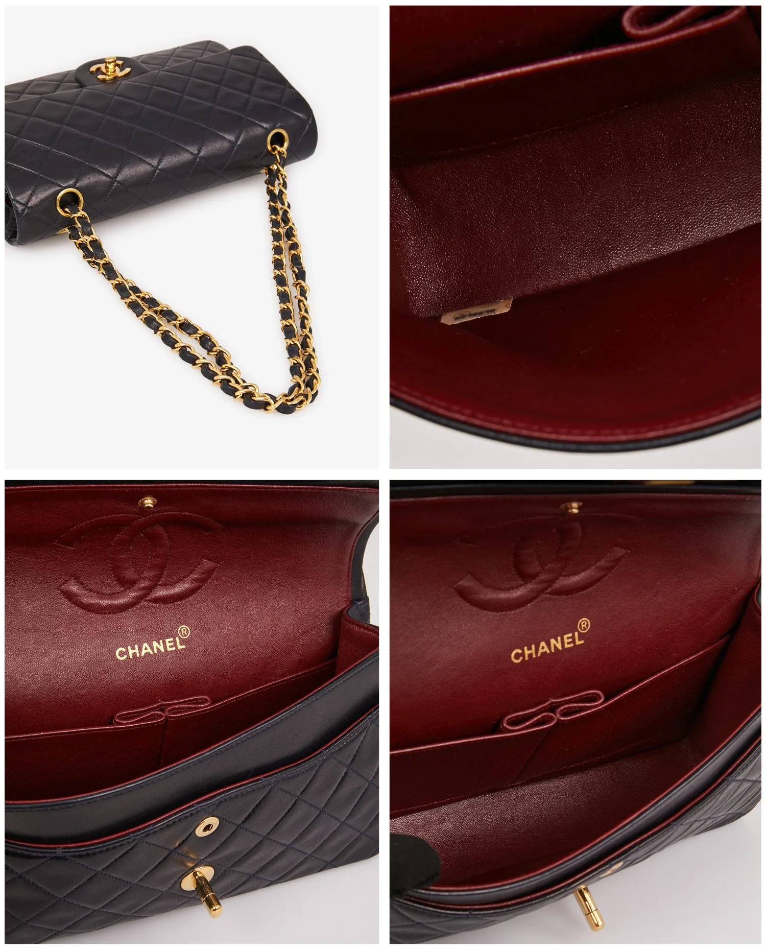 Vintage Chanel Classique 25cm bag in navy blue quilted lambskin. The jewelry is in 24K gold-plated metal. It is worn on the shoulder with a gold metal chain interwoven with black lambskin leather. The interior is in burgundy leather. In very good condition. It will be delivered in its original box, dustbag and authenticity card.