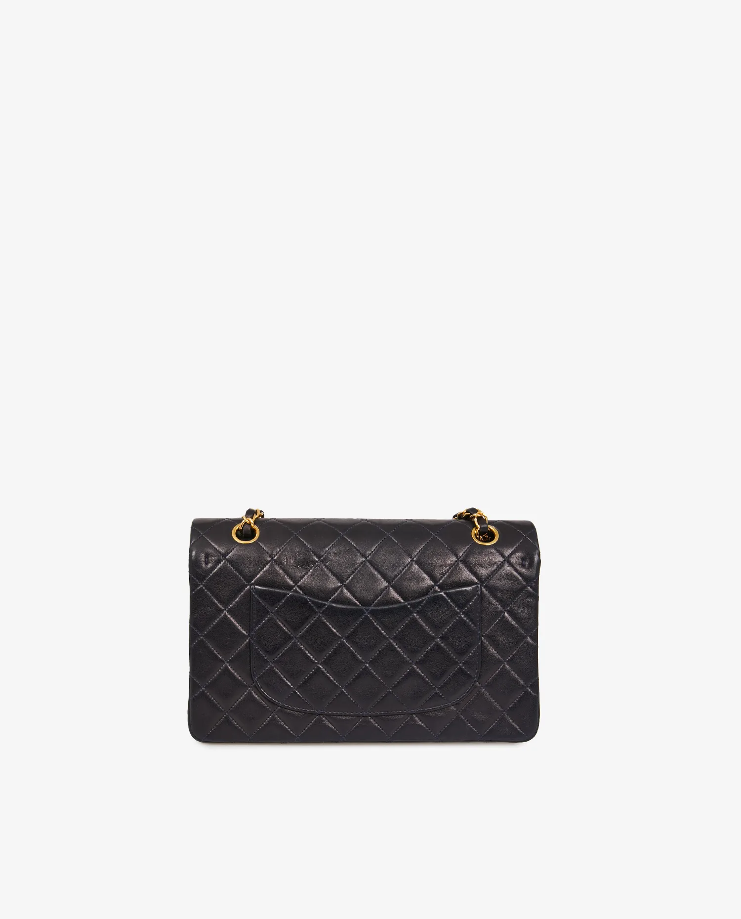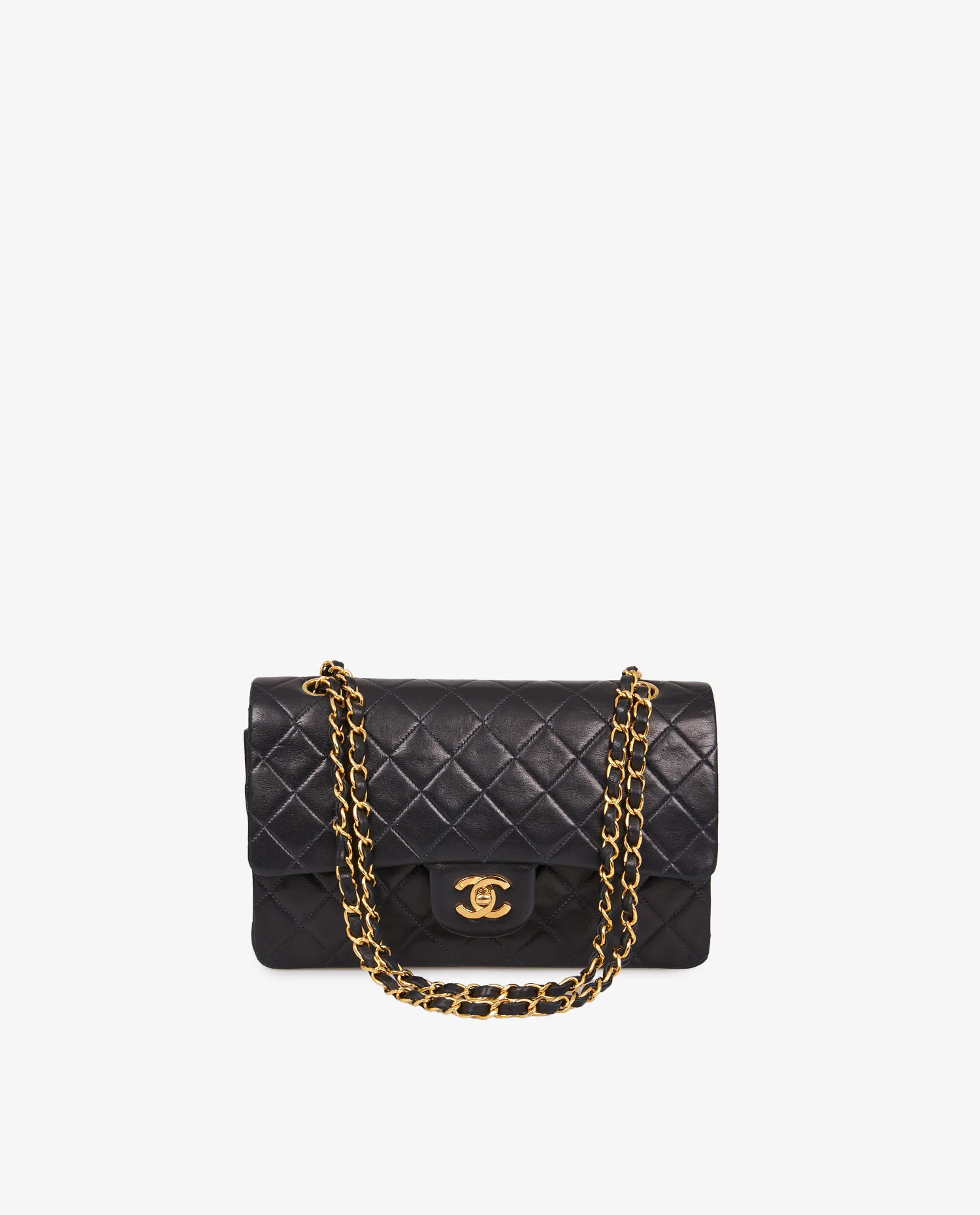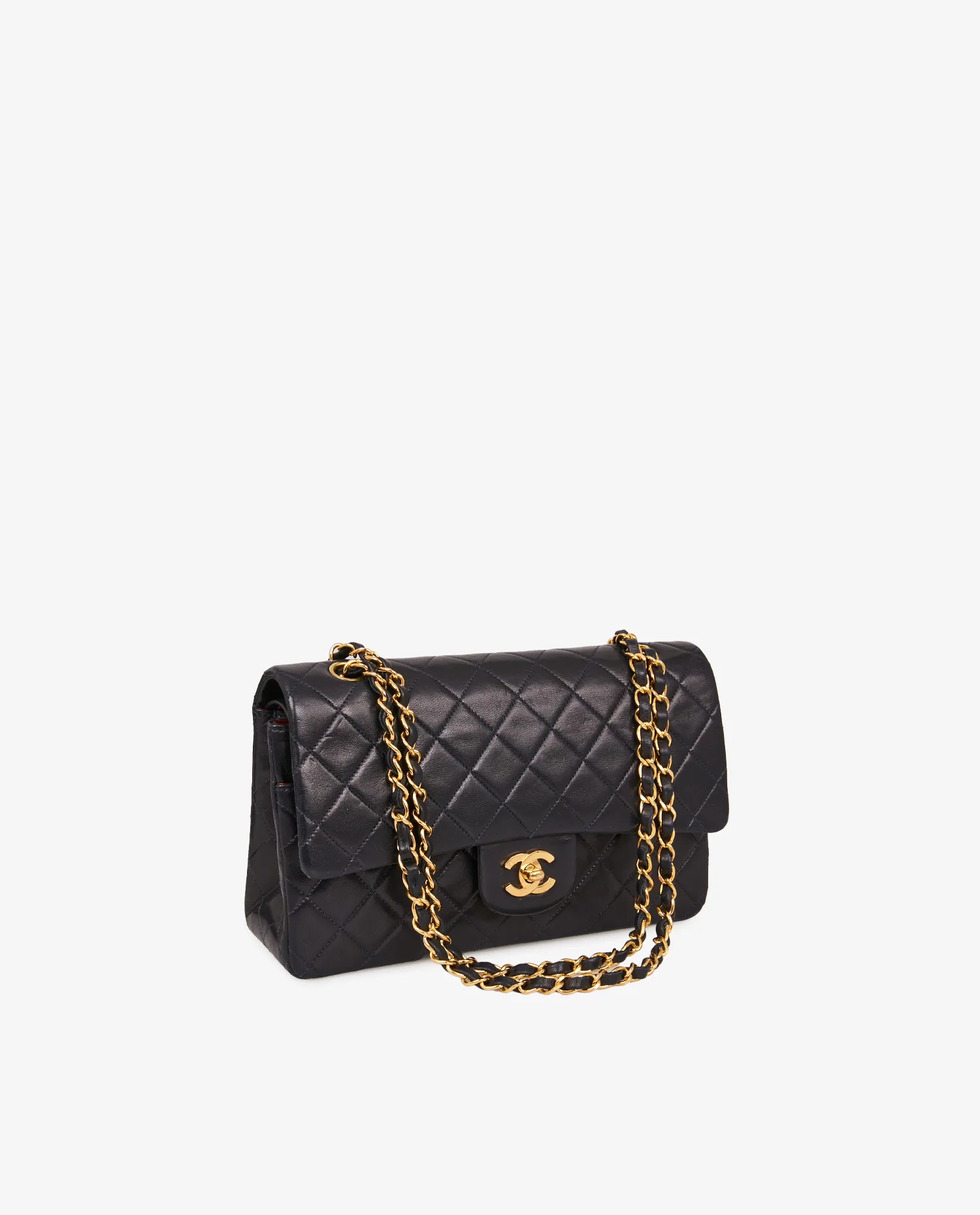 Vintage Chanel Classique 25cm bag in navy blue quilted lambskin. The jewelry is in 24K gold-plated metal. It is worn on the shoulder with a gold metal chain interwoven with black lambskin leather. The interior is in burgundy leather. In very good condition. It will be delivered in its original box, dustbag and authenticity card.