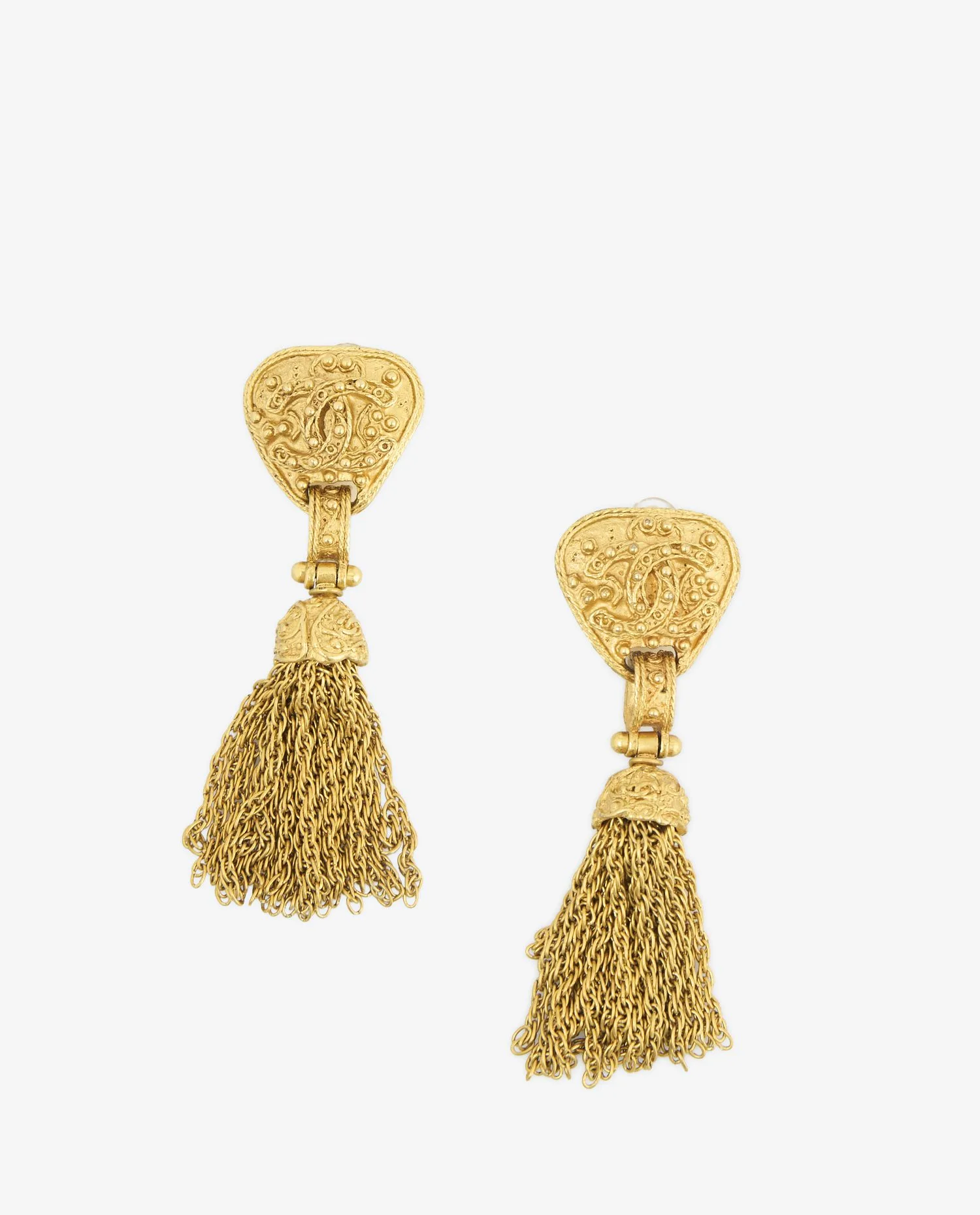 Le métal doré présente un fini mat légèrement texturé, soulignant les détails en relief tels que les volutes et le logo Chanel sur la partie supérieure. Les chaînettes pendantes, nombreuses et souples, apportent du volume et du dynamisme à la pièce. Les clips mesurent environ 8 cm de long, offrant une présence visuelle affirmée sans excès. Le revers du clip est gravé du poinçon CHANEL® 94 A MADE IN FRANCE, garantissant l’authenticité et la datation de la pièce.