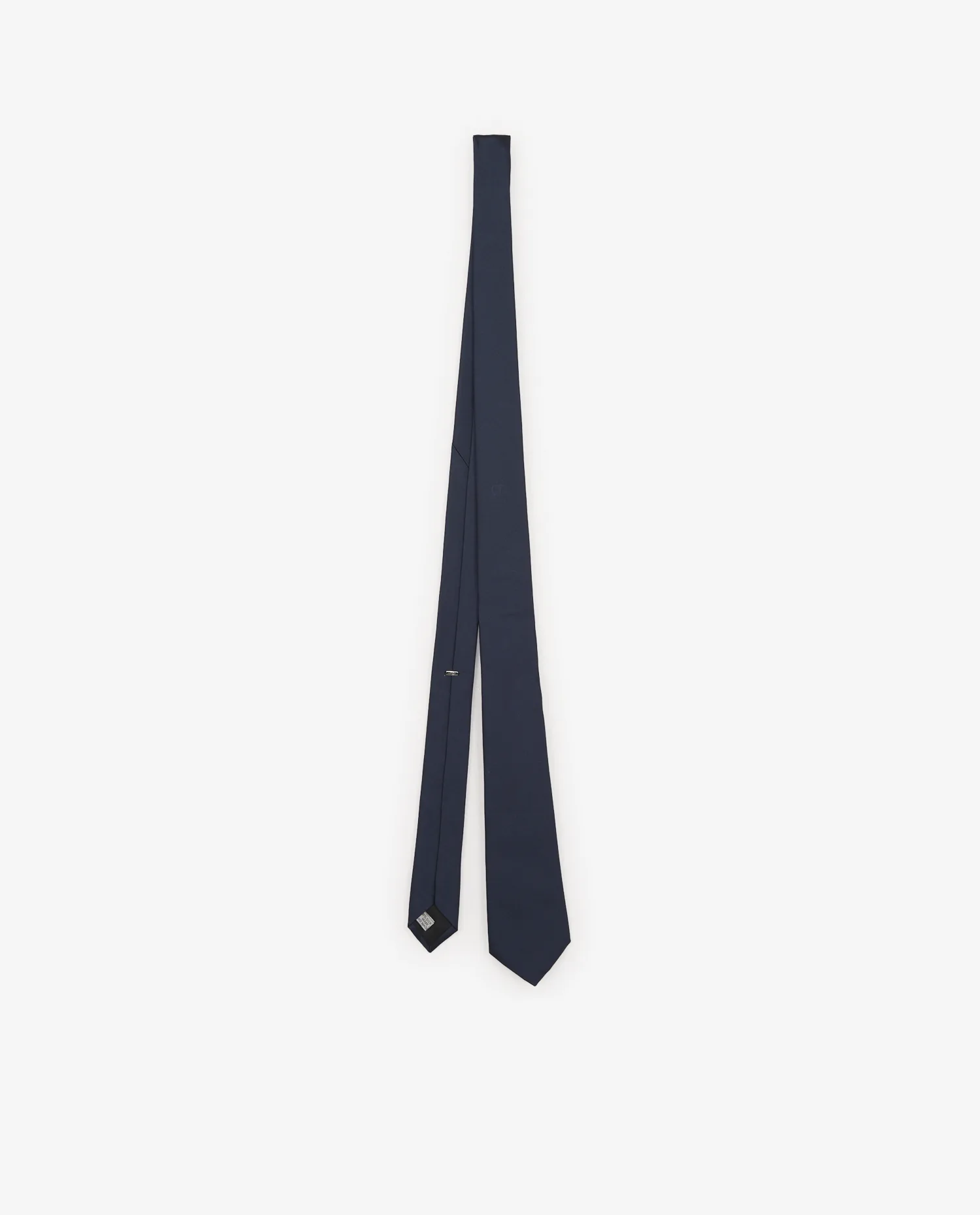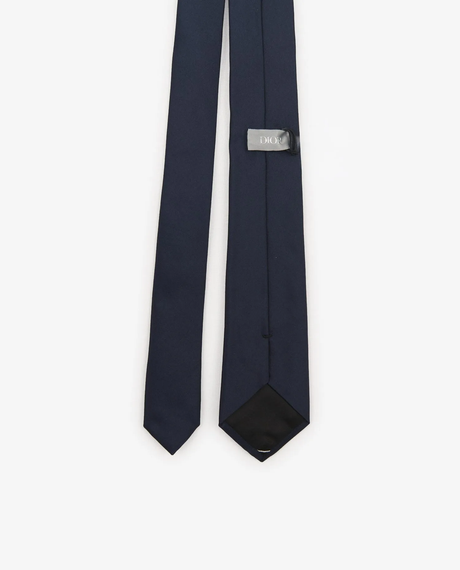 La soie bleu marine présente un tissage serré à l’aspect légèrement satiné, offrant une brillance maîtrisée. Le logo « CD » brodé ton sur ton se situe à l’endroit exact où le nœud se forme, assurant un positionnement impeccable à chaque port. La coupe, fine mais équilibrée, mesure environ 6 cm de largeur à la base, convenant à une variété de cols modernes. La pointe est finie par un empiècement intérieur noir, renforçant la structure.