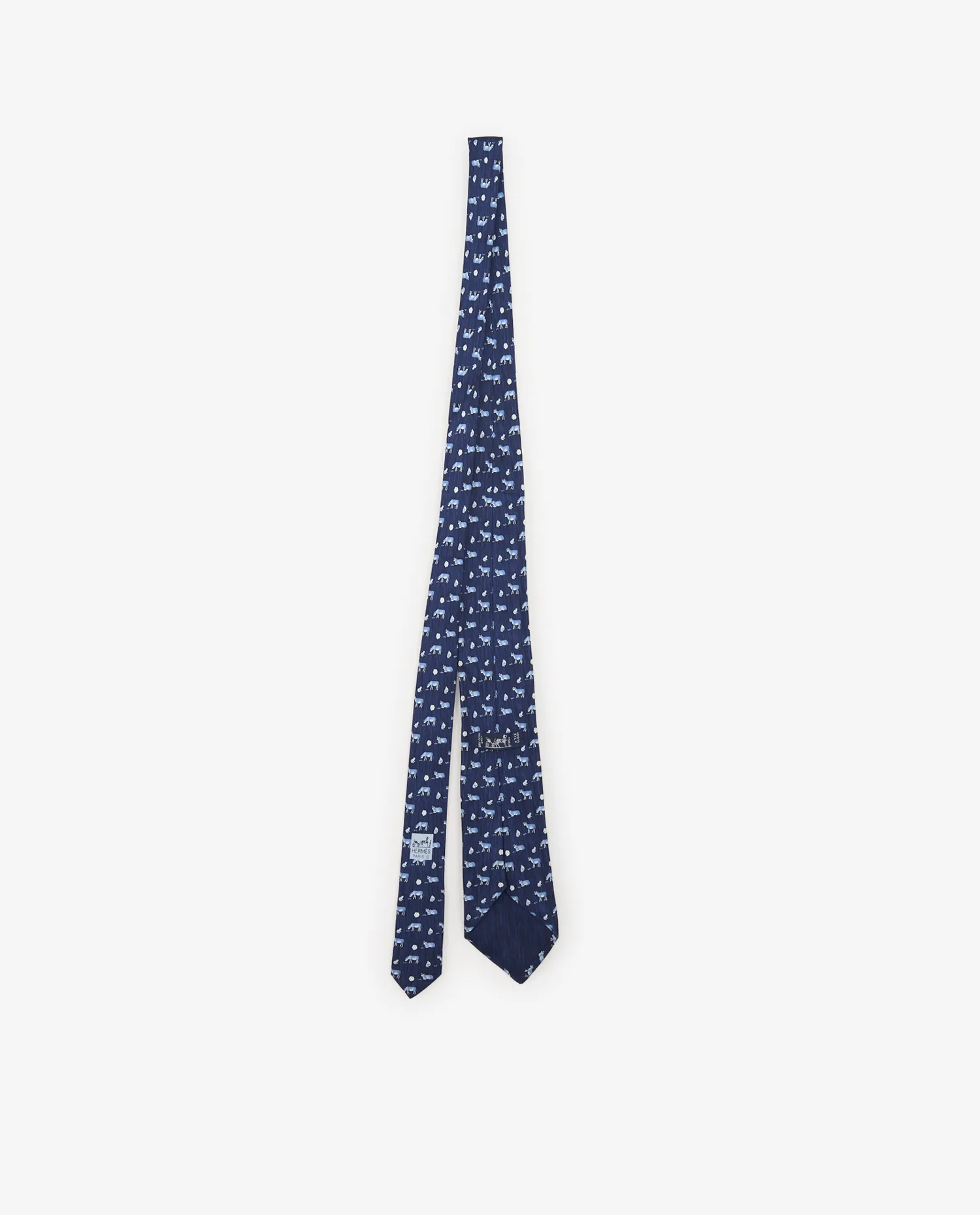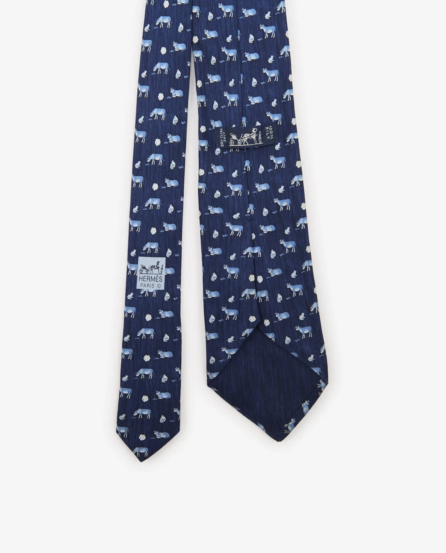 History of the Model: Hermès has been recognized since the 1940s for its silk ties with original patterns, often inspired by the animal world, the equestrian world or nature. The motif represented here – a set of cows and frogs – is part of this humorous and graphic tradition specific to the house. These patterns were often designed by in-house artists like Philippe Ledoux or Henri d’Origny, and produced in limited series, which makes them sought after today by collectors and vintage enthusiasts. External Details: The tie is cut from quality heavy silk, characteristic of Hermès productions of past decades. The navy blue background serves as a canvas for a repeating pattern of cows and frogs in gradient blue and white tones. The regularity of the printing testifies to the artisanal know-how of the Lyon workshops used by the brand. The finishes are neat, with hand stitching on the back and a tone-on-tone navy blue interior lining. Interior Details: The interior is lined with a stiffer silk which helps maintain the shape of the knot and ensures a beautiful drape. The Hermès Paris logo as well as the composition and manufacturing label are visible on the back of the main blade, reinforcing the authenticity of the piece. The absence of fraying or internal folds indicates good conservation. Product Condition: This tie is in very good vintage condition. No noticeable rips, stains or discoloration are visible. Silk retains all its fluidity and shine, with perfect support. The stitching is intact, and the tips show no signs of wear. Care Instructions: It is recommended to have this tie dry cleaned by a professional specializing in delicate textiles, in order to preserve the silk fibers and the colors of the pattern. Avoid tying it too tightly to maintain its original shape, and store it flat or hanging to avoid wrinkles. Why Choose this Product: This vintage Hermès tie with a cow and frog motif perfectly illustrates the iconic approach of the house: combining subtle humor and textile excellence. It is an original piece that stands out in a classic outfit, ideal for vintage lovers looking for a distinctive touch without ostentation. Its rarity, its remarkable condition and the richness of its pattern make it a collector’s accessory as well as a lasting style element.