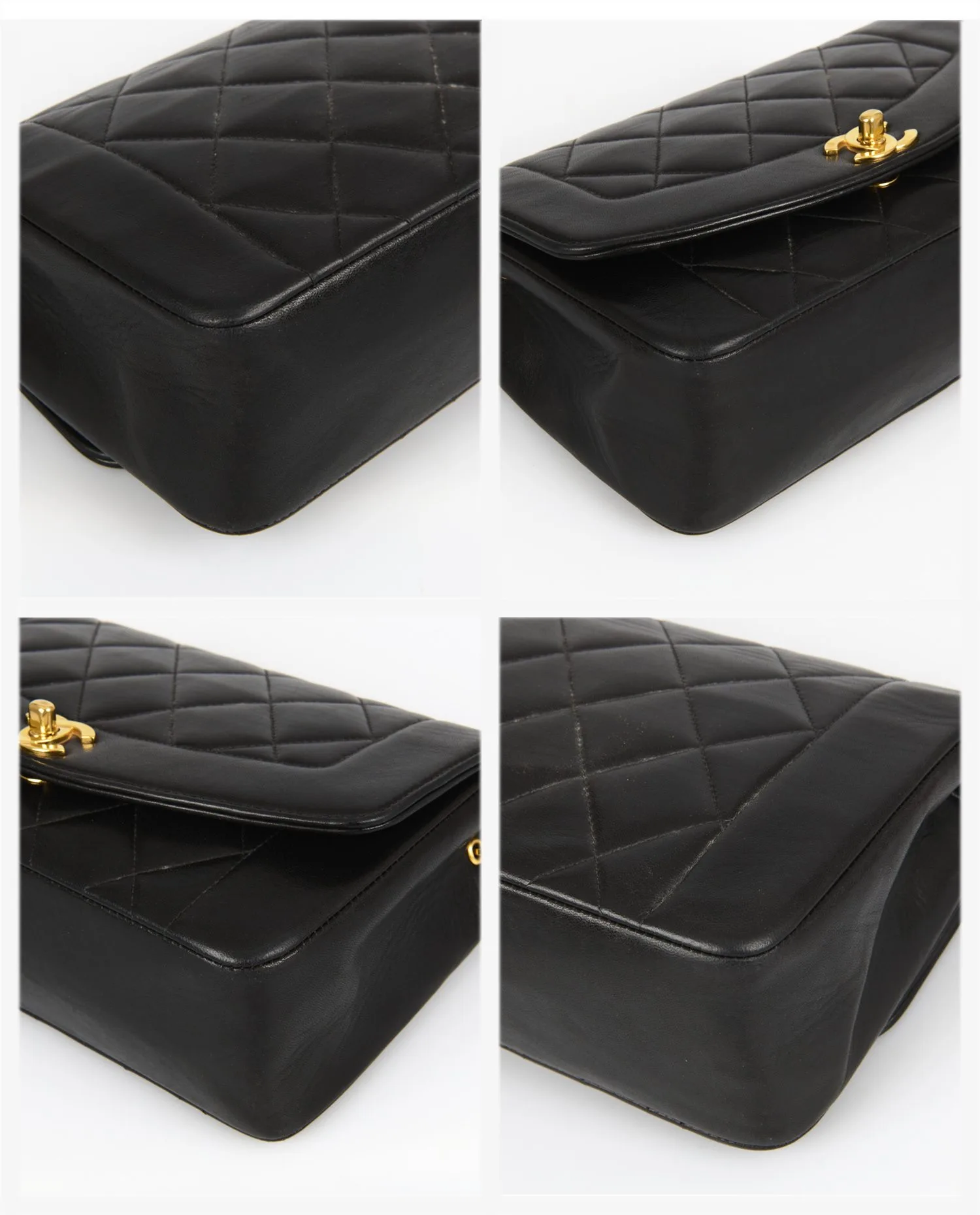 This Diana bag is in very good vintage condition. The leather retains its suppleness and shine, despite some fine superficial marks on the flap. The corners have a slight patina but are not rubbed. The chain is shiny, with no noticeable loss of gilding. The closure works perfectly and the overall structure is well maintained.