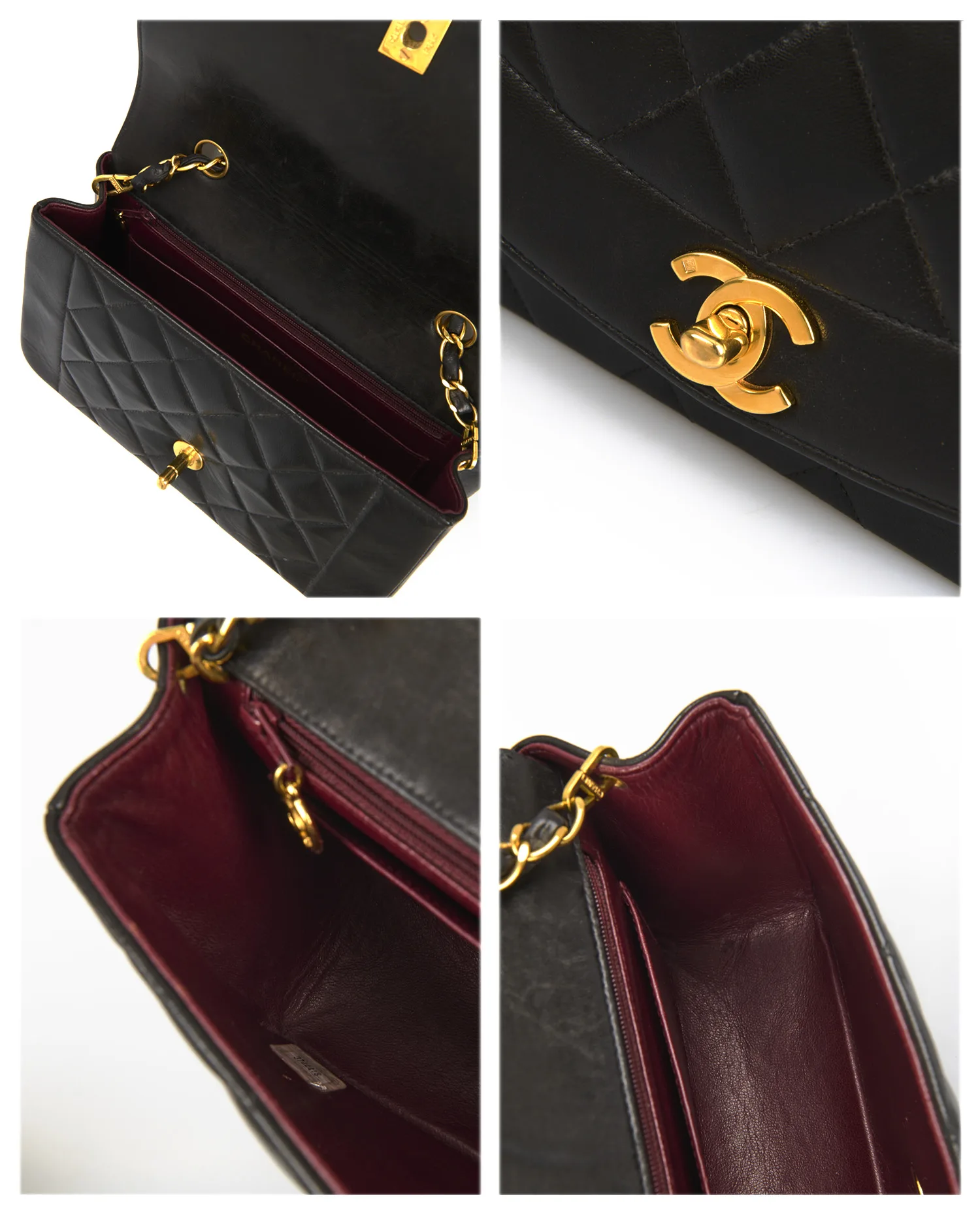 Brown lambskin leather has a smooth, glossy finish, with a supple, luxurious texture characteristic of Chanel bags from this period. The structured flap is framed by a stitched bead that gives the Diana its distinctive silhouette. The 24K gold-plated jewelry, including the CC clasp and intertwined chain, retains its original brilliance. The bag measures 22 cm in length, 14 cm in height and 6.5 cm in depth, a discreet but sufficient size for everyday essentials.