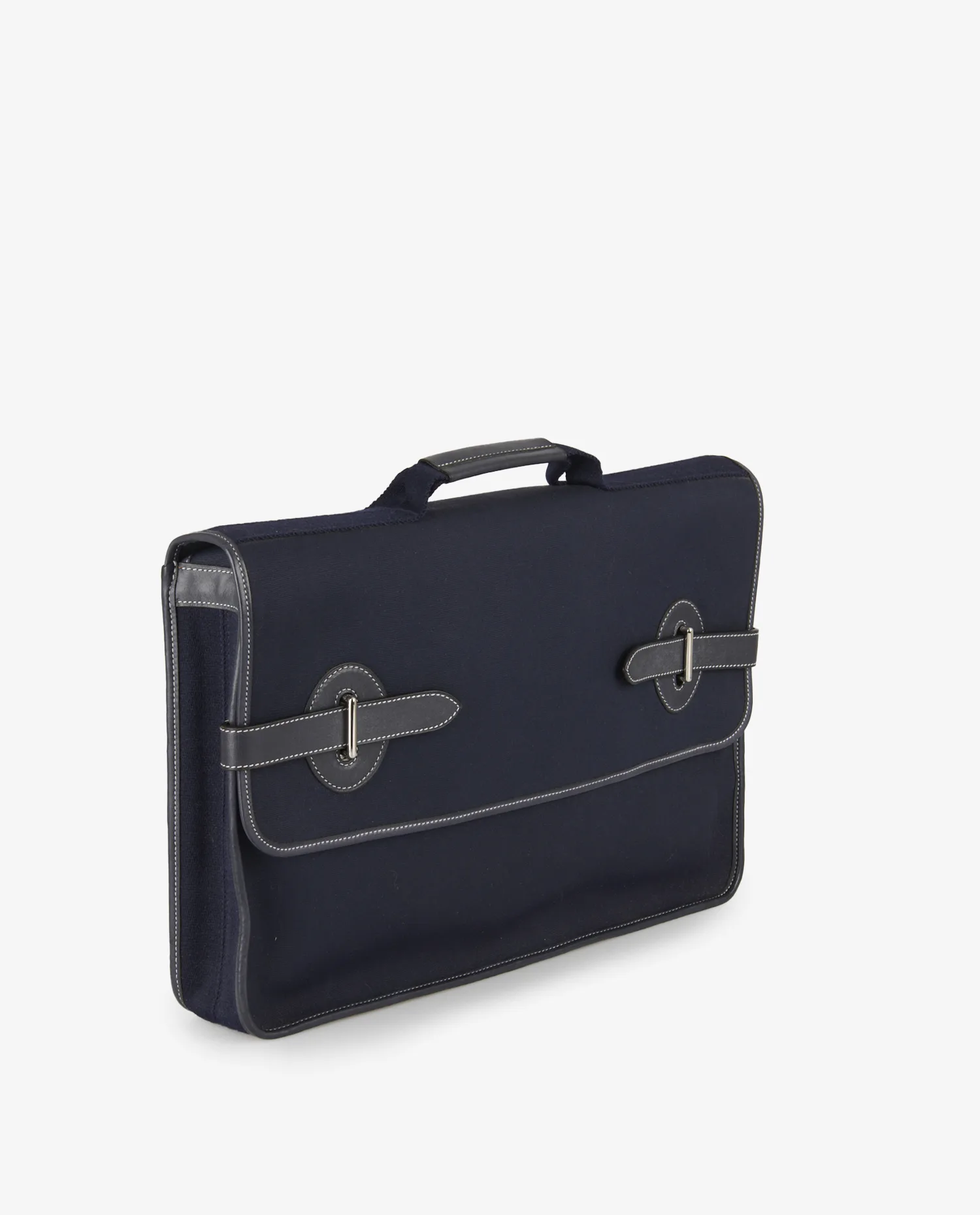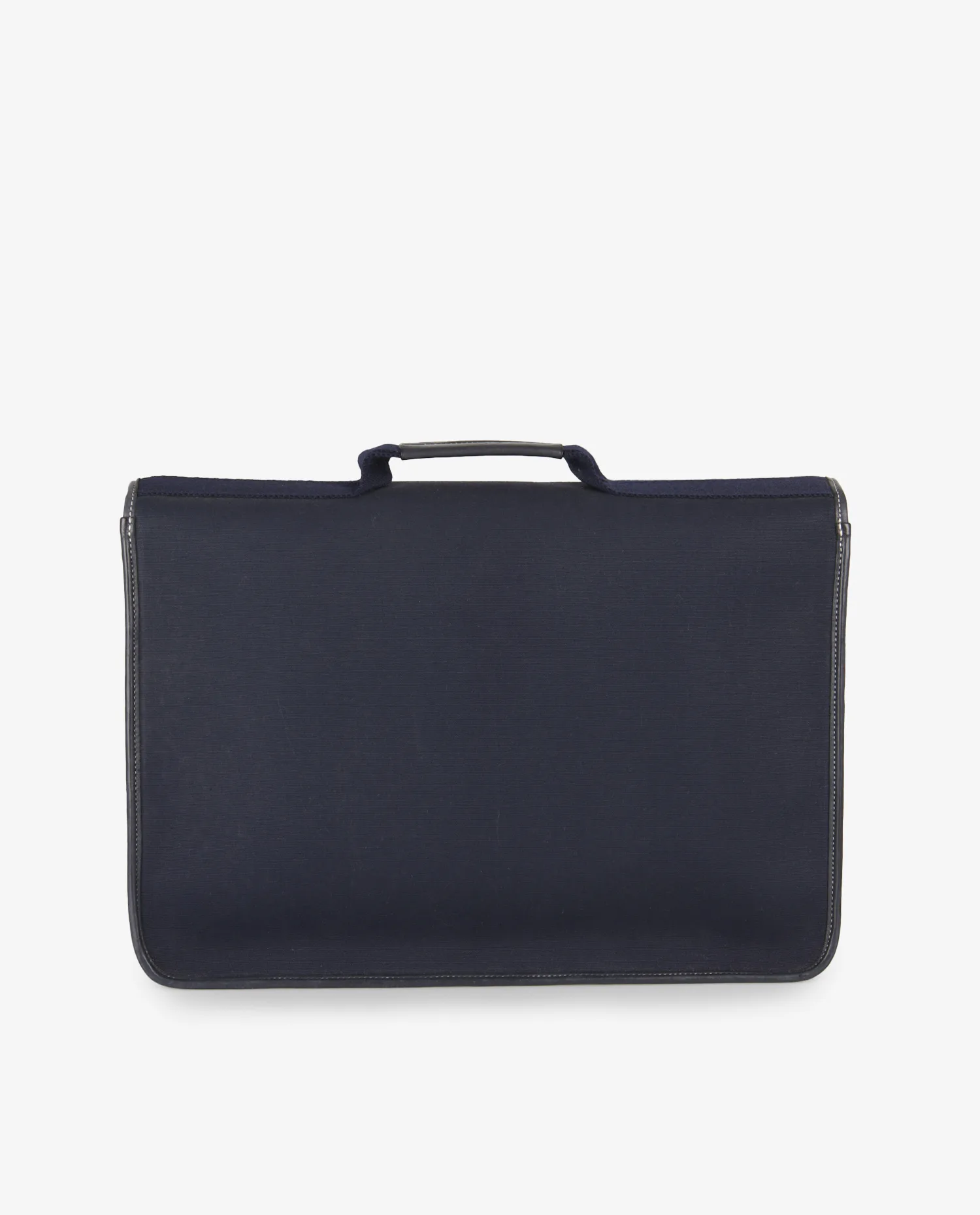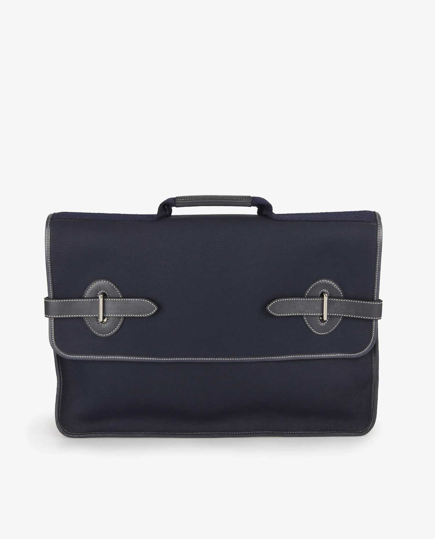 Dense, hard-wearing navy-blue canvas is trimmed in smooth leather of the same tone, stitched with thick white thread to emphasize the piece’s contours. Rounded corners reinforce the structure, while the two leather straps at the front ensure closure with a system of silver-tone metal loops. The matching rigid leather handle is discreetly and ergonomically integrated. The flat rectangular silhouette lends a classic, compact look to everyday professional use.