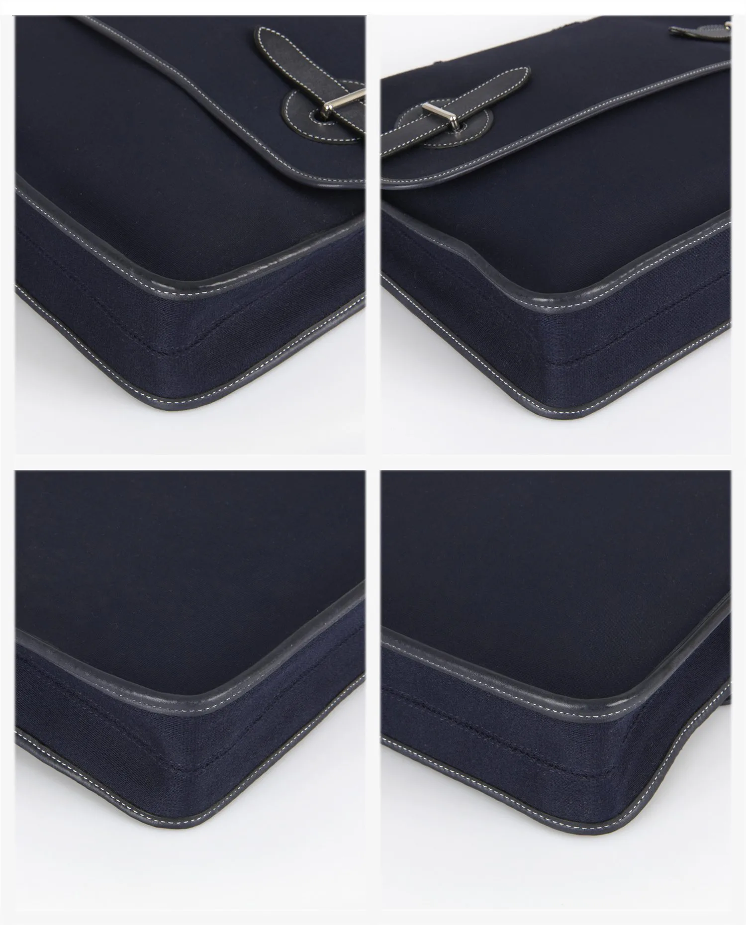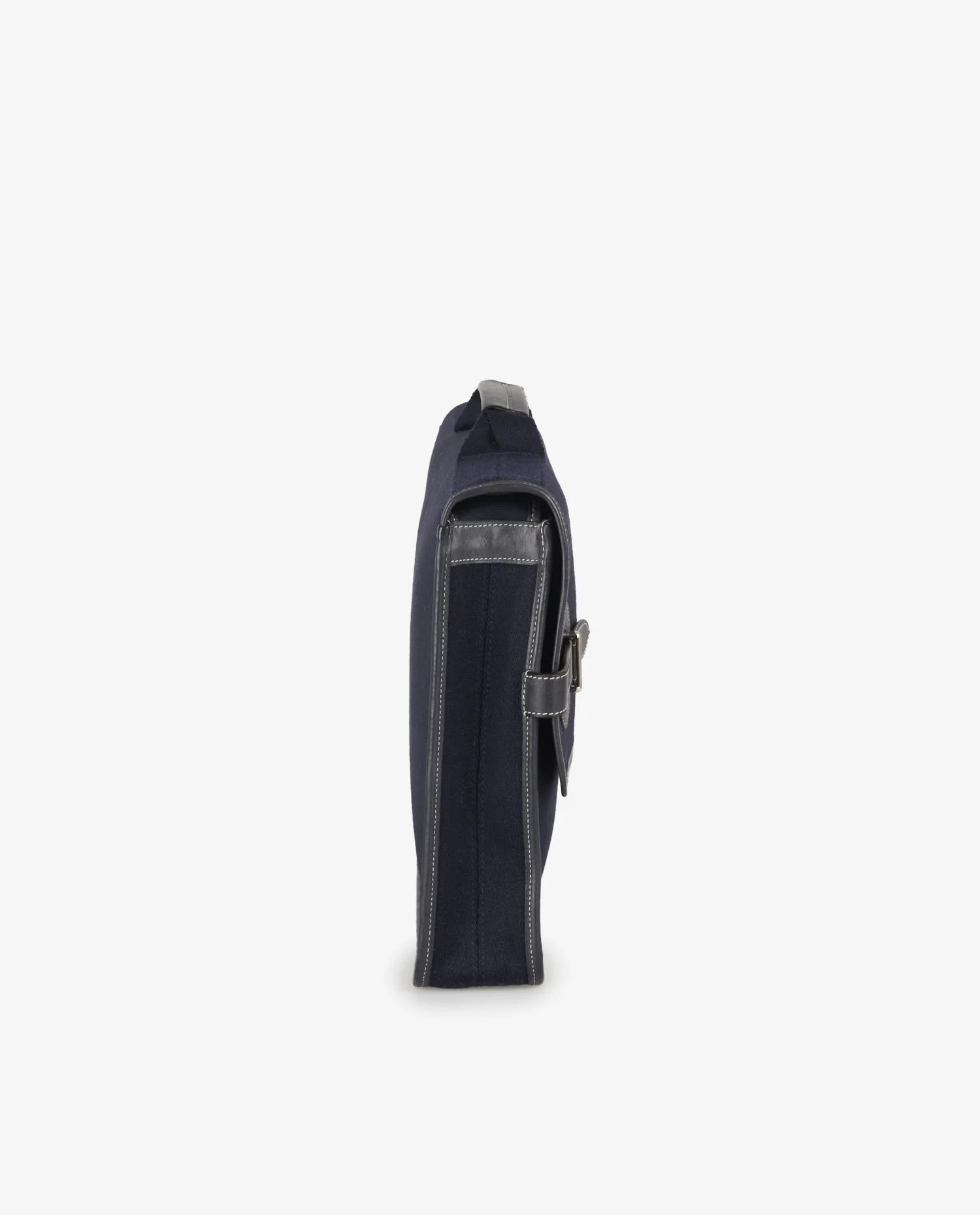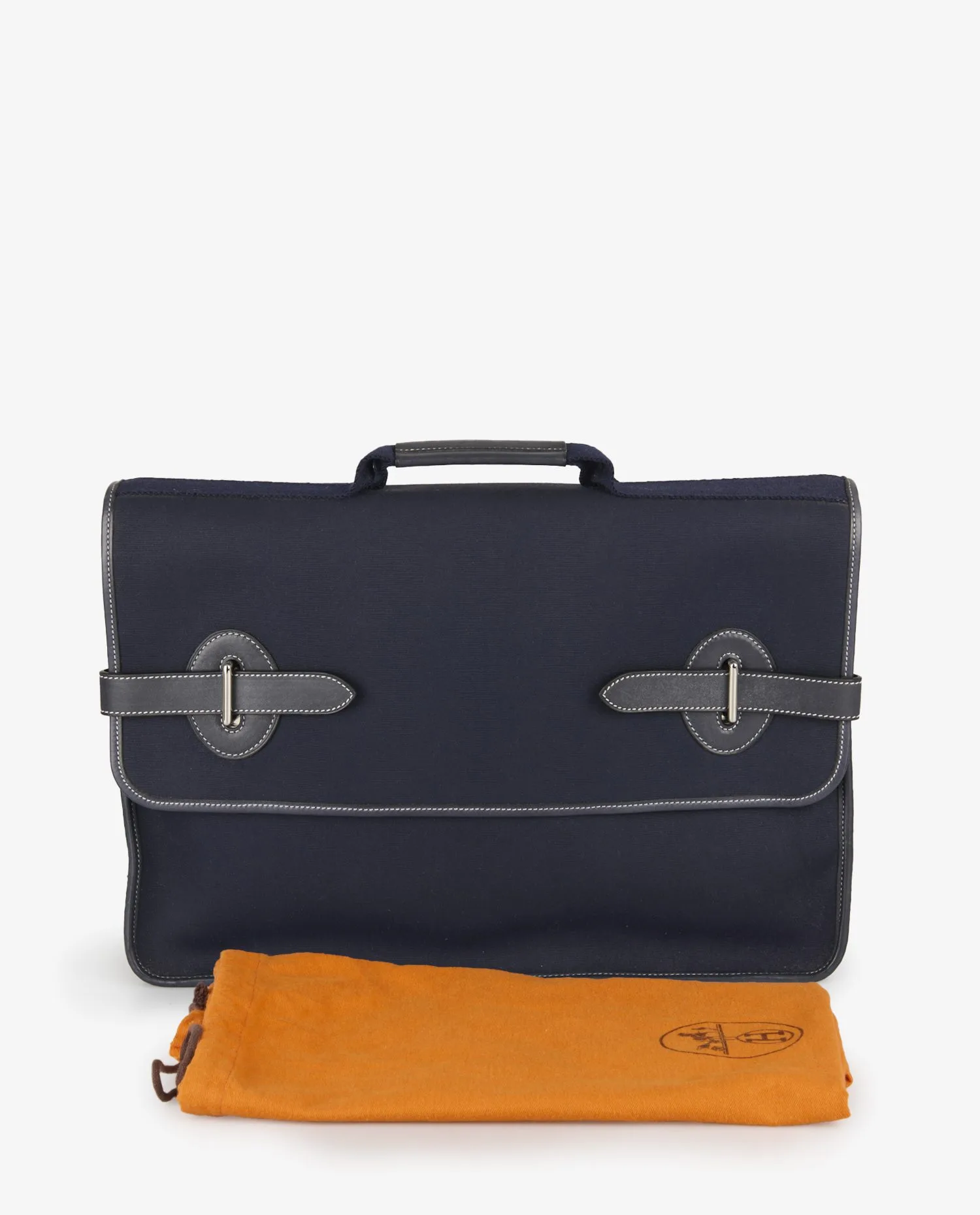 Dense, hard-wearing navy-blue canvas is trimmed in smooth leather of the same tone, stitched with thick white thread to emphasize the piece’s contours. Rounded corners reinforce the structure, while the two leather straps at the front ensure closure with a system of silver-tone metal loops. The matching rigid leather handle is discreetly and ergonomically integrated. The flat rectangular silhouette lends a classic, compact look to everyday professional use.