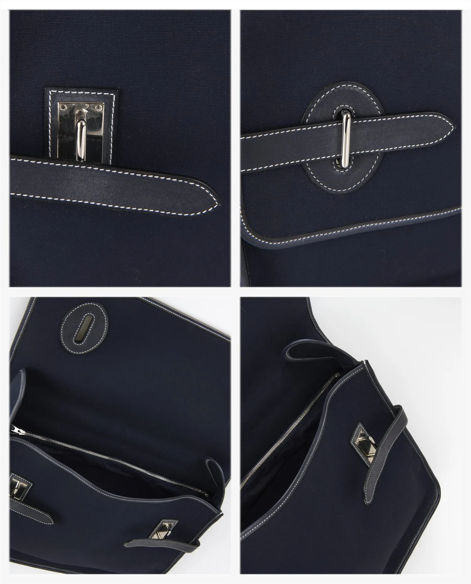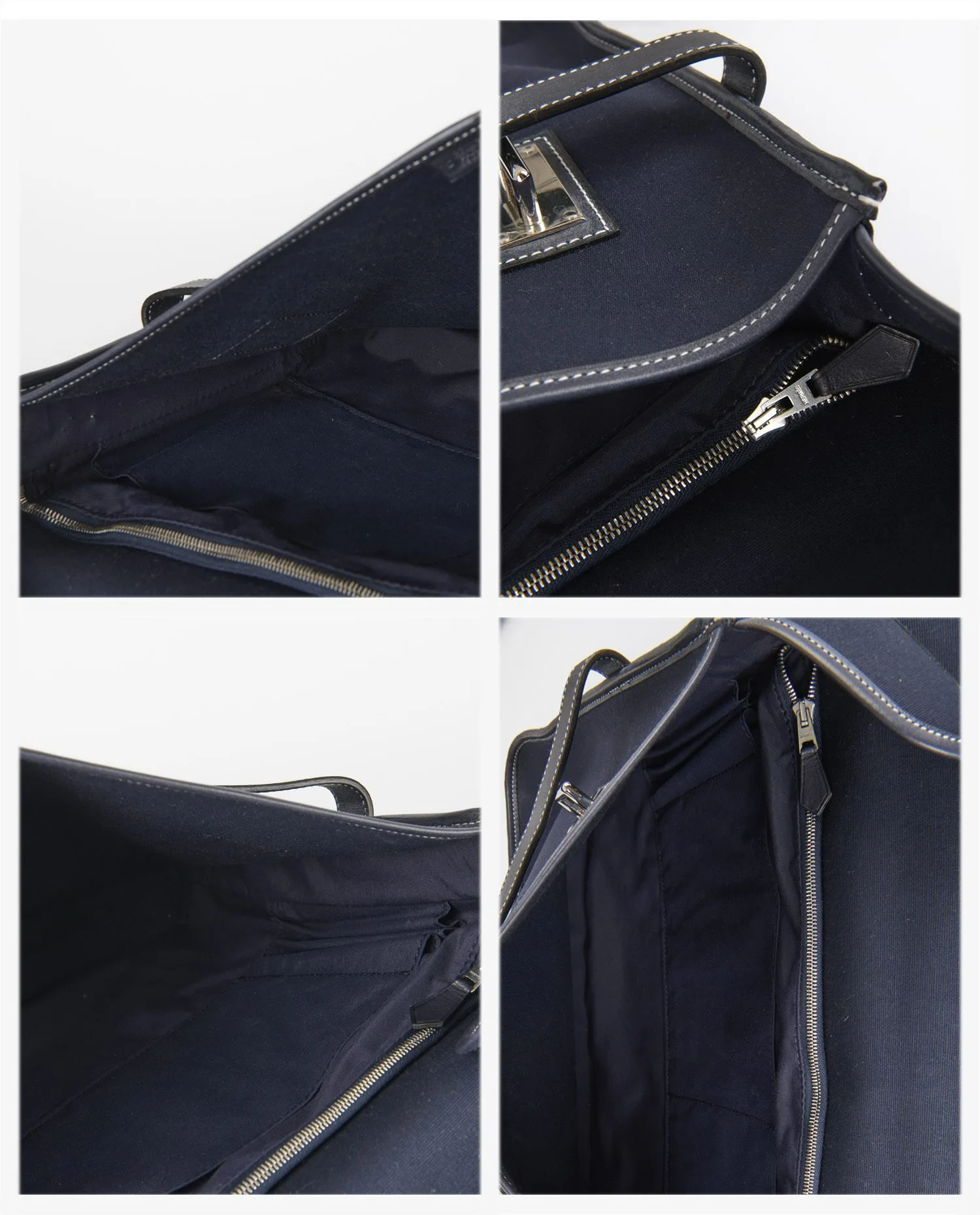 The interior is lined with navy blue tone-on-tone canvas. It features a spacious main compartment with Hermès signature wide zipper closure, as well as several flat pockets on the inside walls for documents, pens or accessories. The interior layout is designed for organized, sober and functional use, in keeping with the brand’s utilitarian philosophy.