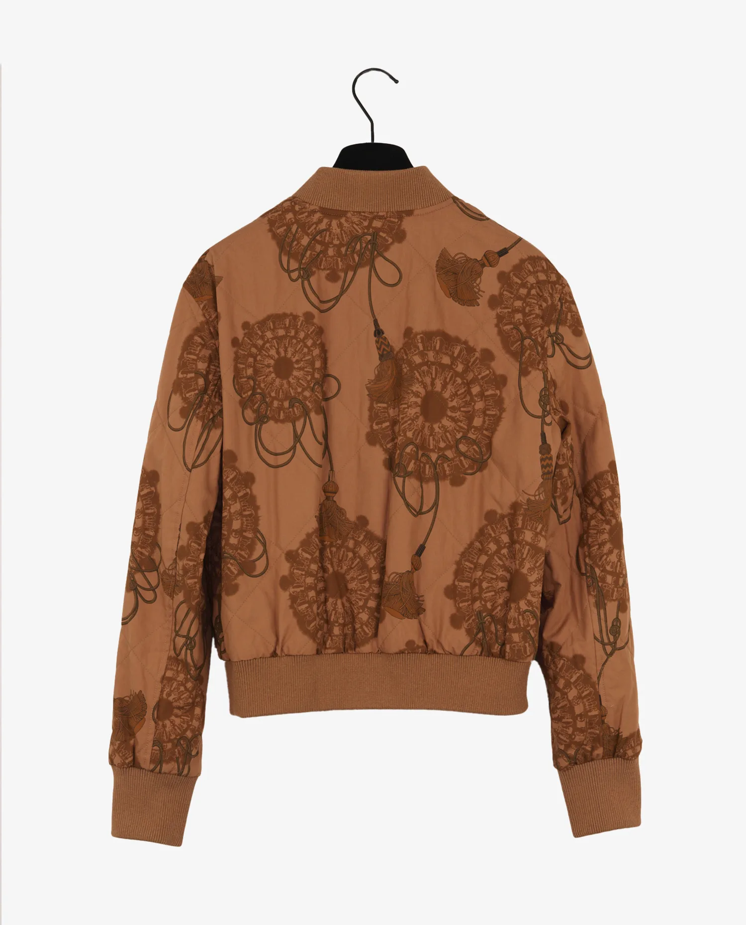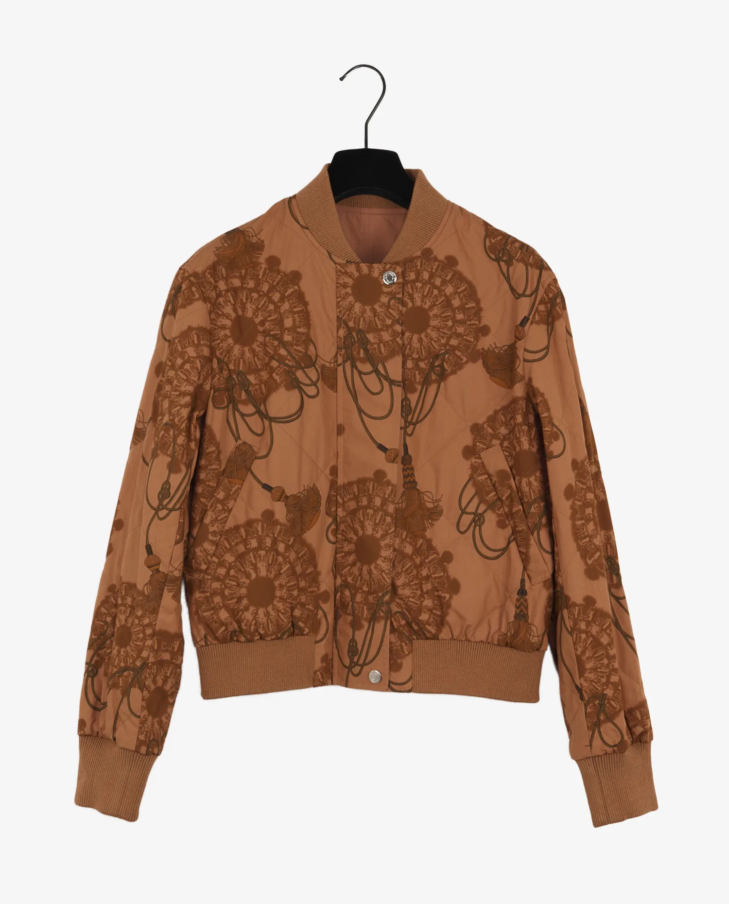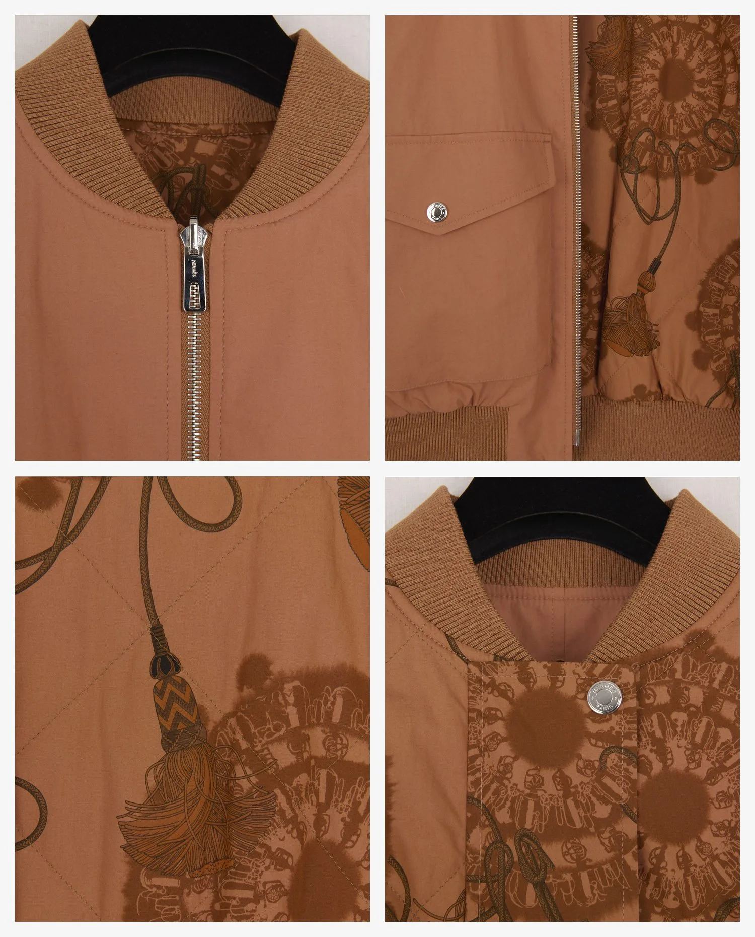 The bomber’s reverse side reveals a fabric adorned with a floral and rope print inspired by the Hermès saddlery world, in a harmony of browns. The quilted interior ensures thermal comfort while highlighting the graphic aspect. The fabric, probably a blend of cotton and synthetic fibers, lends structure and suppleness to the jacket.