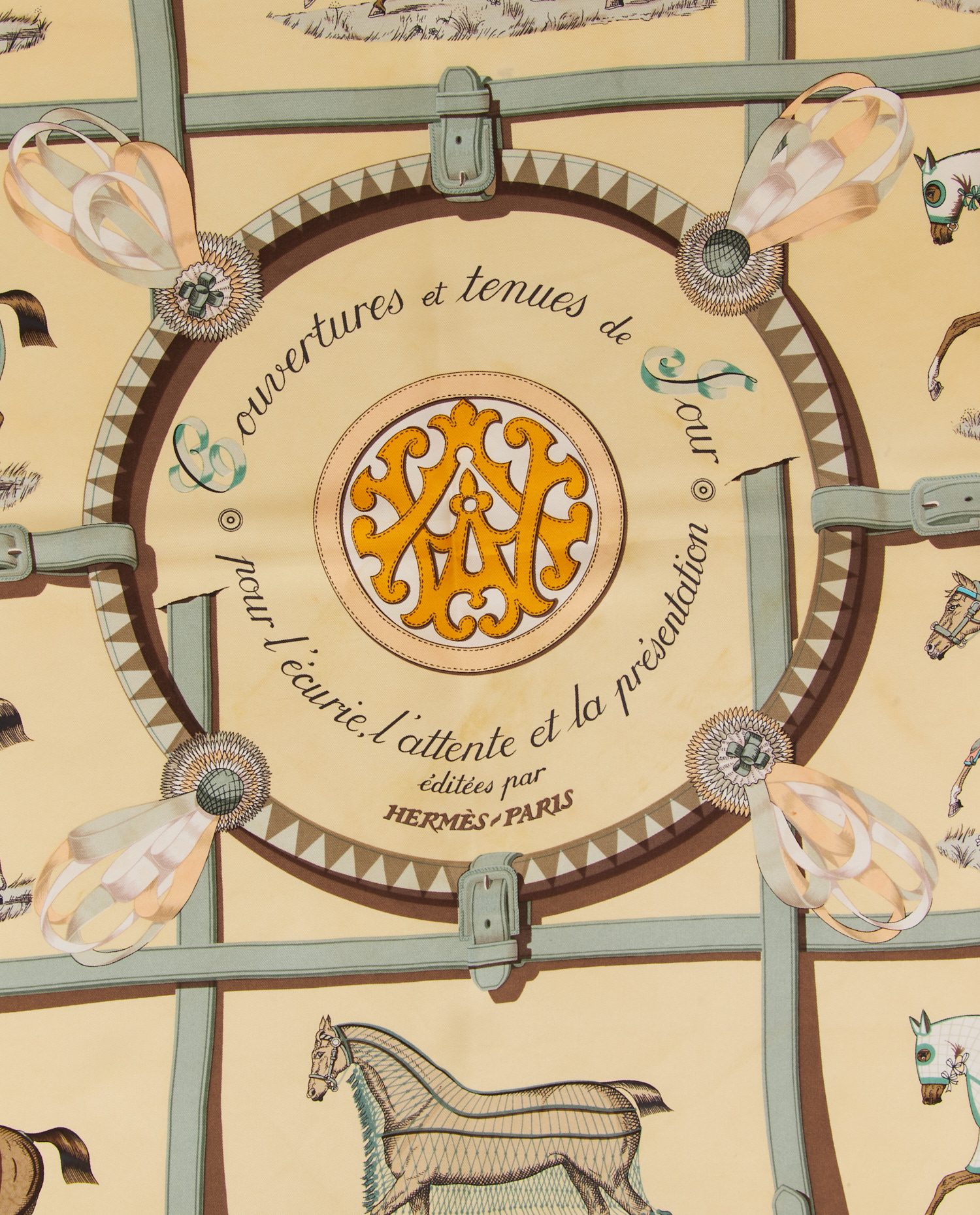 The square is in fair condition. The silk retains its suppleness and main colors, but localized stains and wear marks are present. The original Hermès label is missing, but the printed signatures are clearly visible.