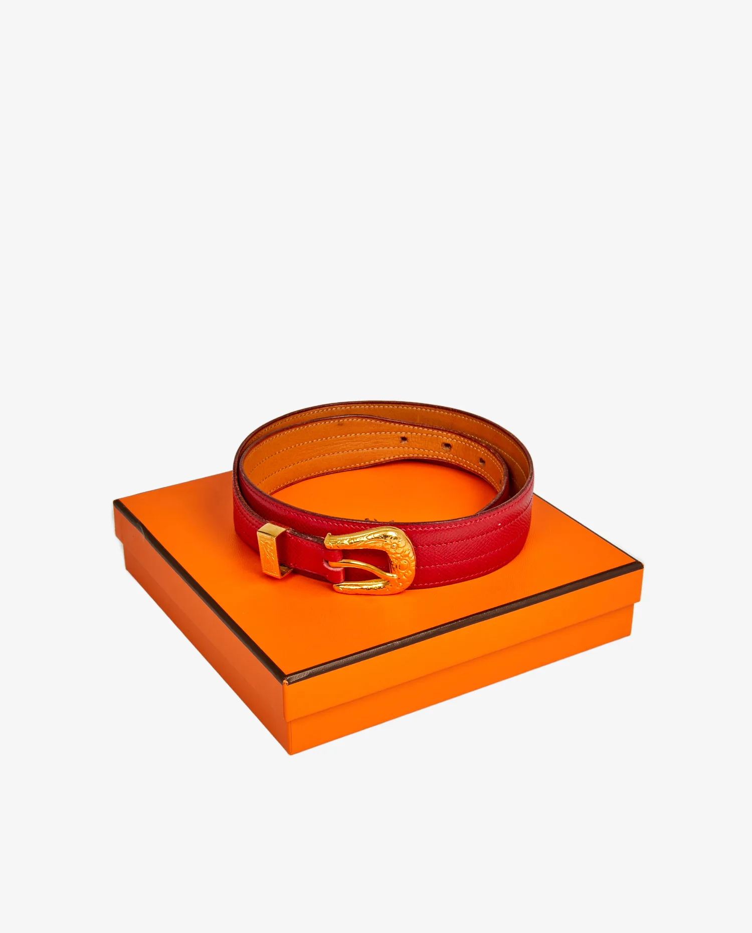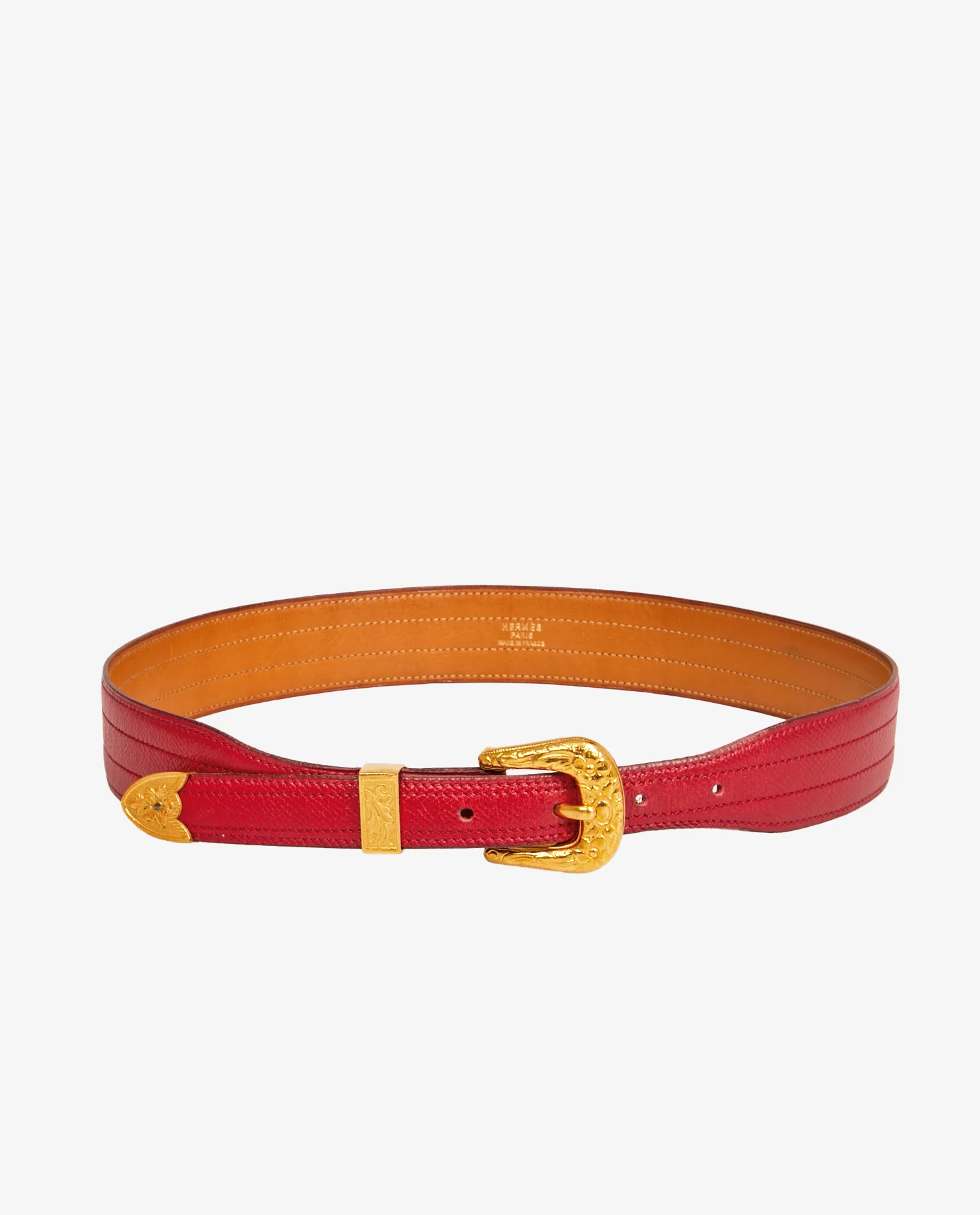 Vintage Hermès belt in red grained leather. Gold-plated buckle. Size 74. R in a circle, year 1988. In very good condition. It will be delivered in its original box.