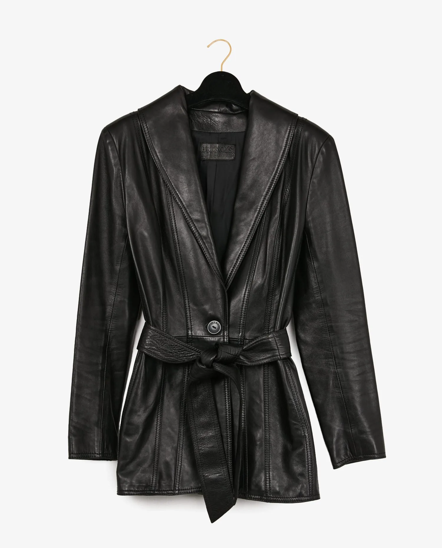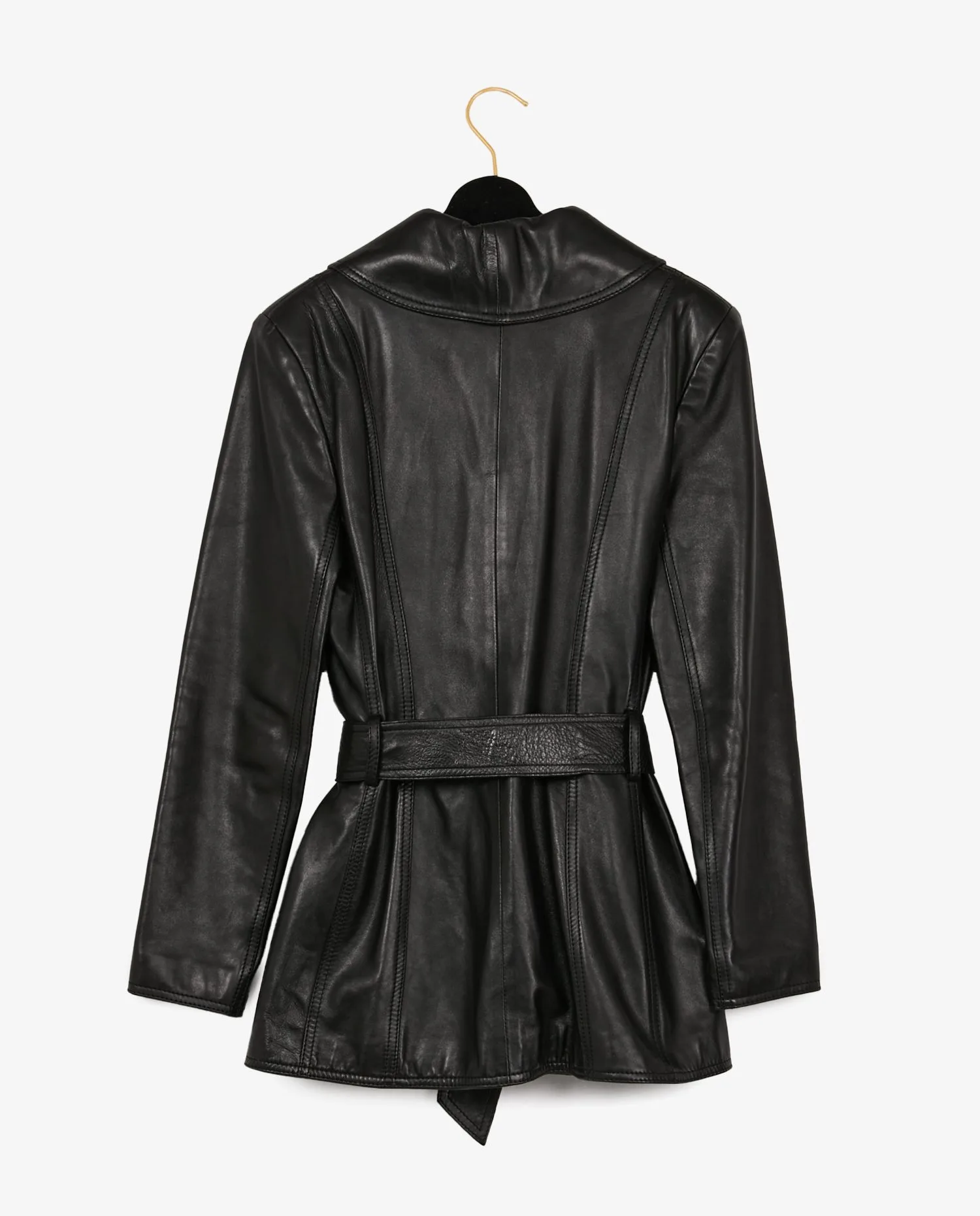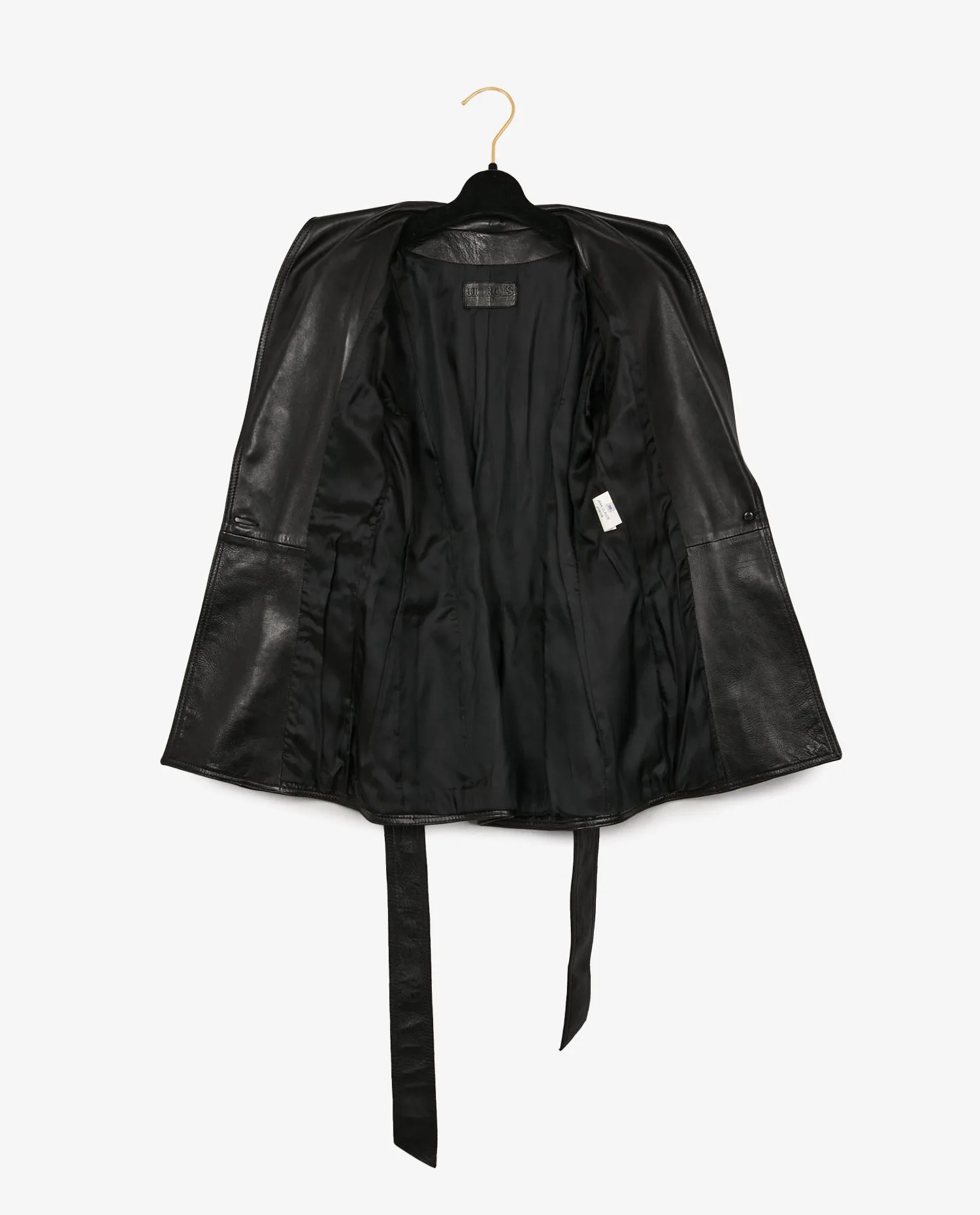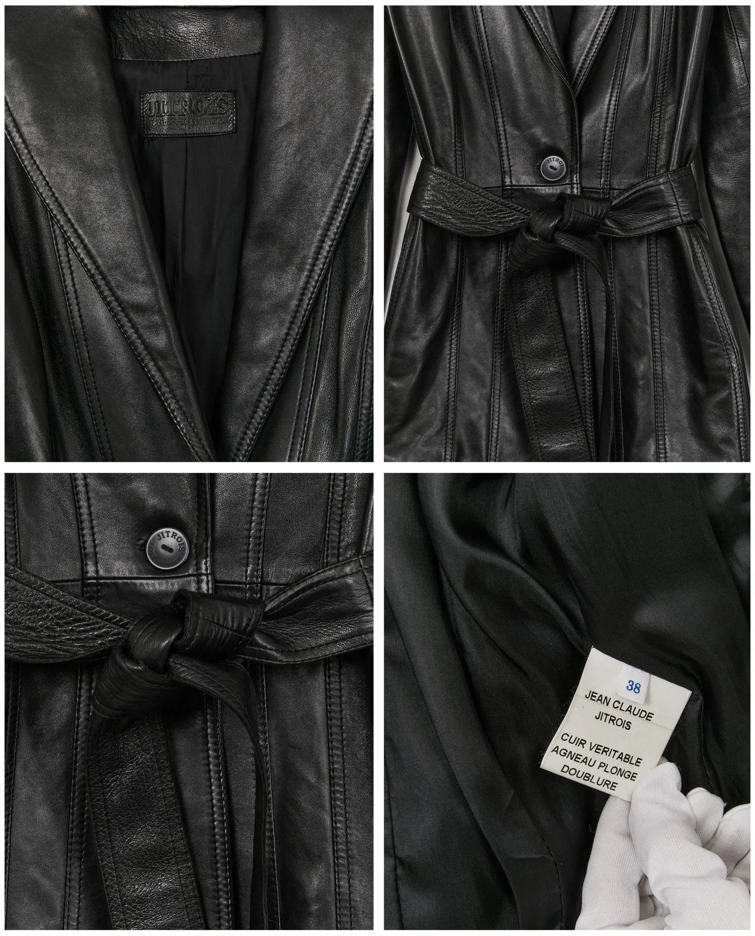 Vintage mid-length jacket by Maison Jitrois, in black plunged lambskin. Fitted and belted, with an elegant, timeless silhouette. Jitrois signature button closure, two side pockets and black acetate lining. Large epaulets give the jacket a vintage, structured look. Size 38. In very good condition.
