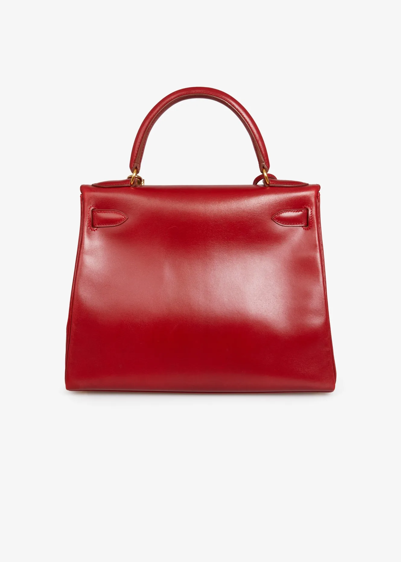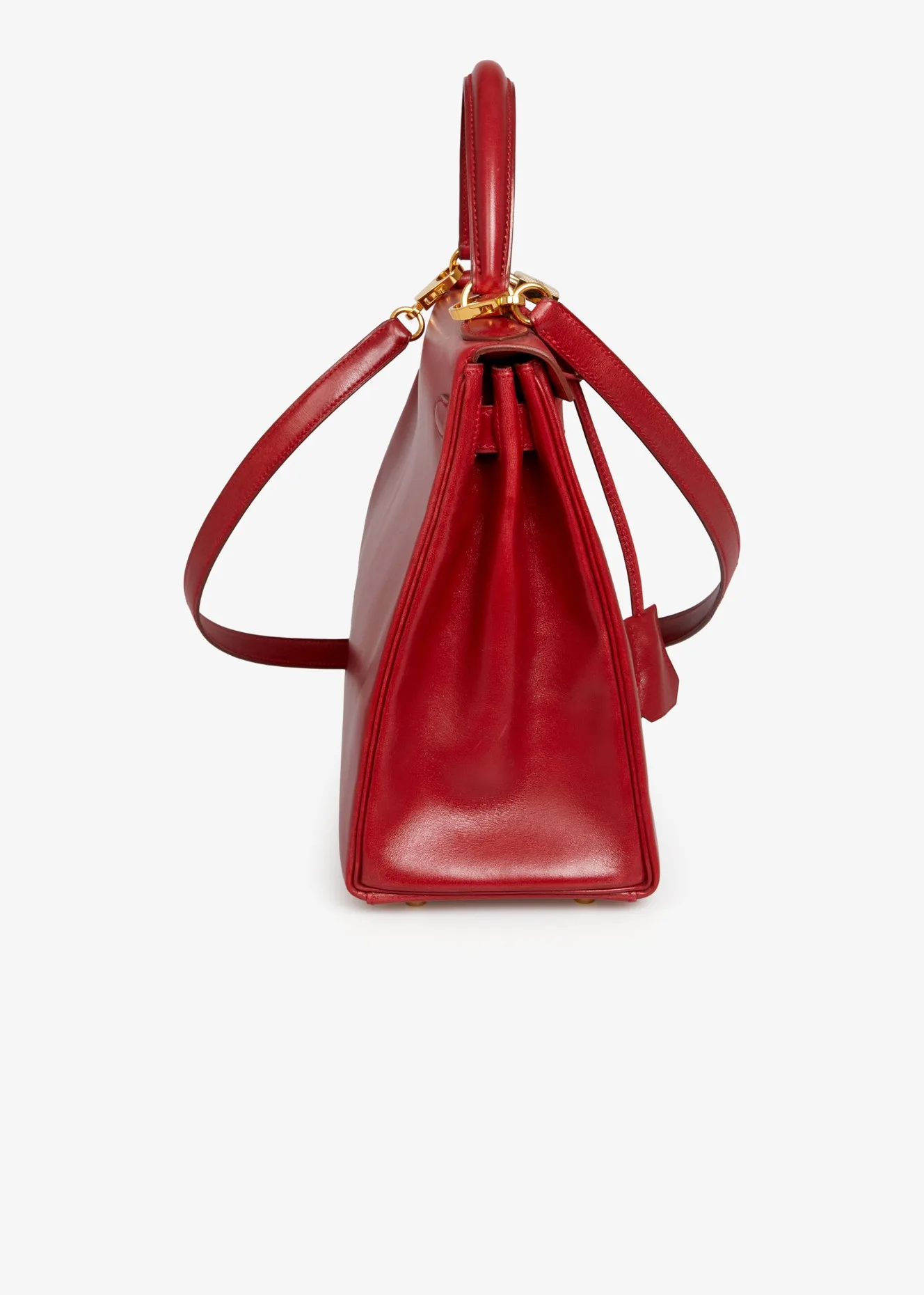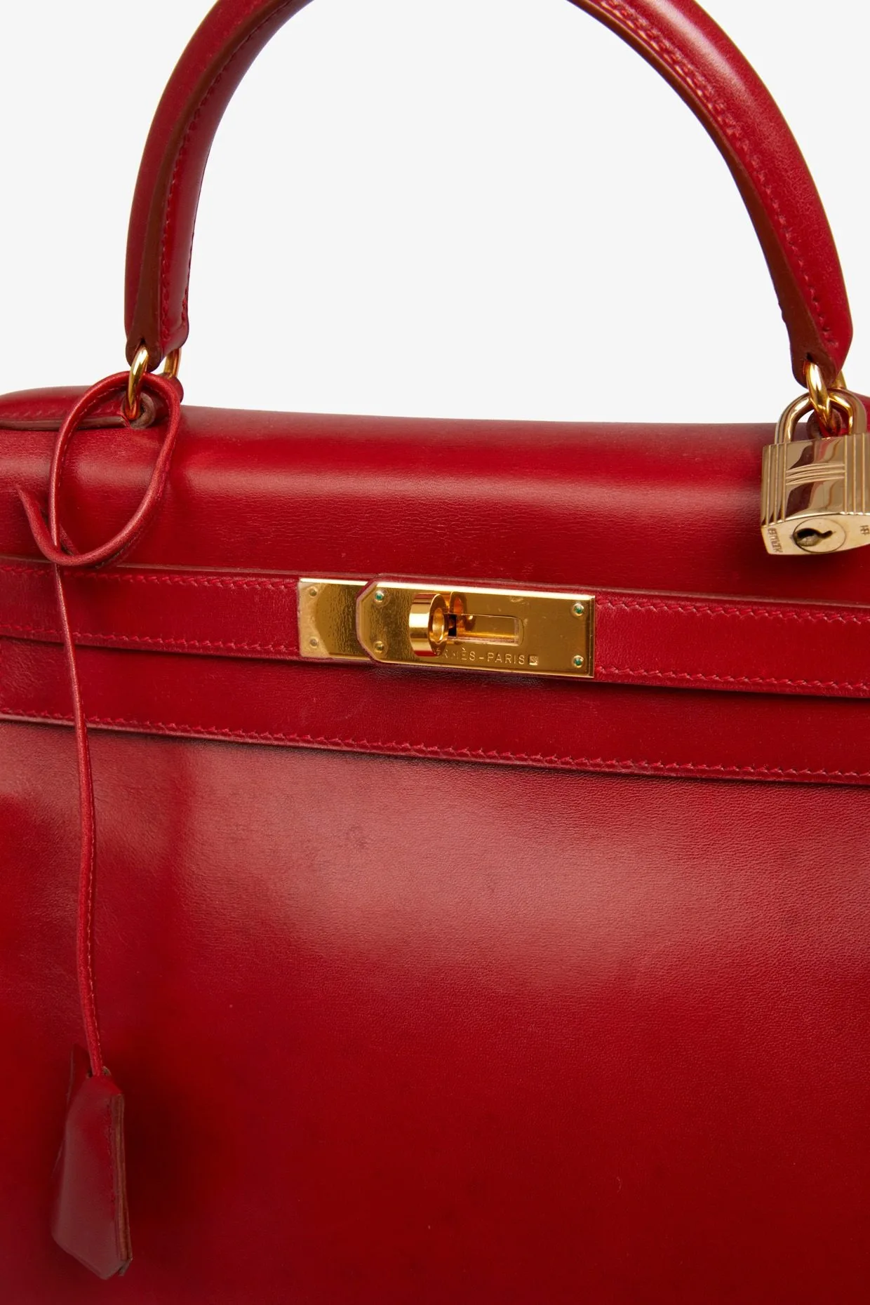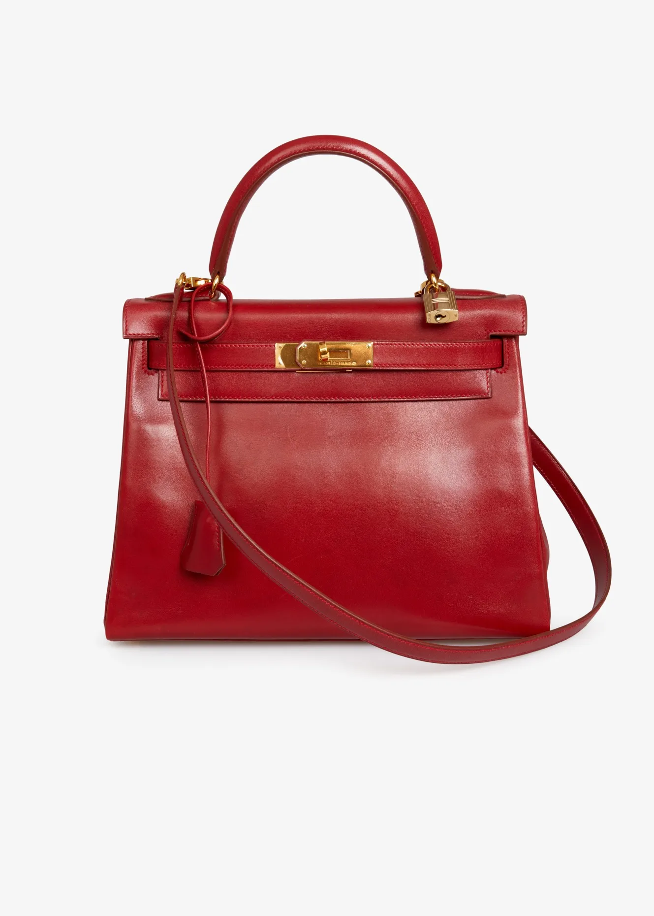 Kelly 28 Hermès bag in red box leather H. Gold jewelry. Pull cord, bell, padlock and key. Carried on the shoulder or by hand. In very good condition. Some wear marks. Plastics are still in jewelry stores.