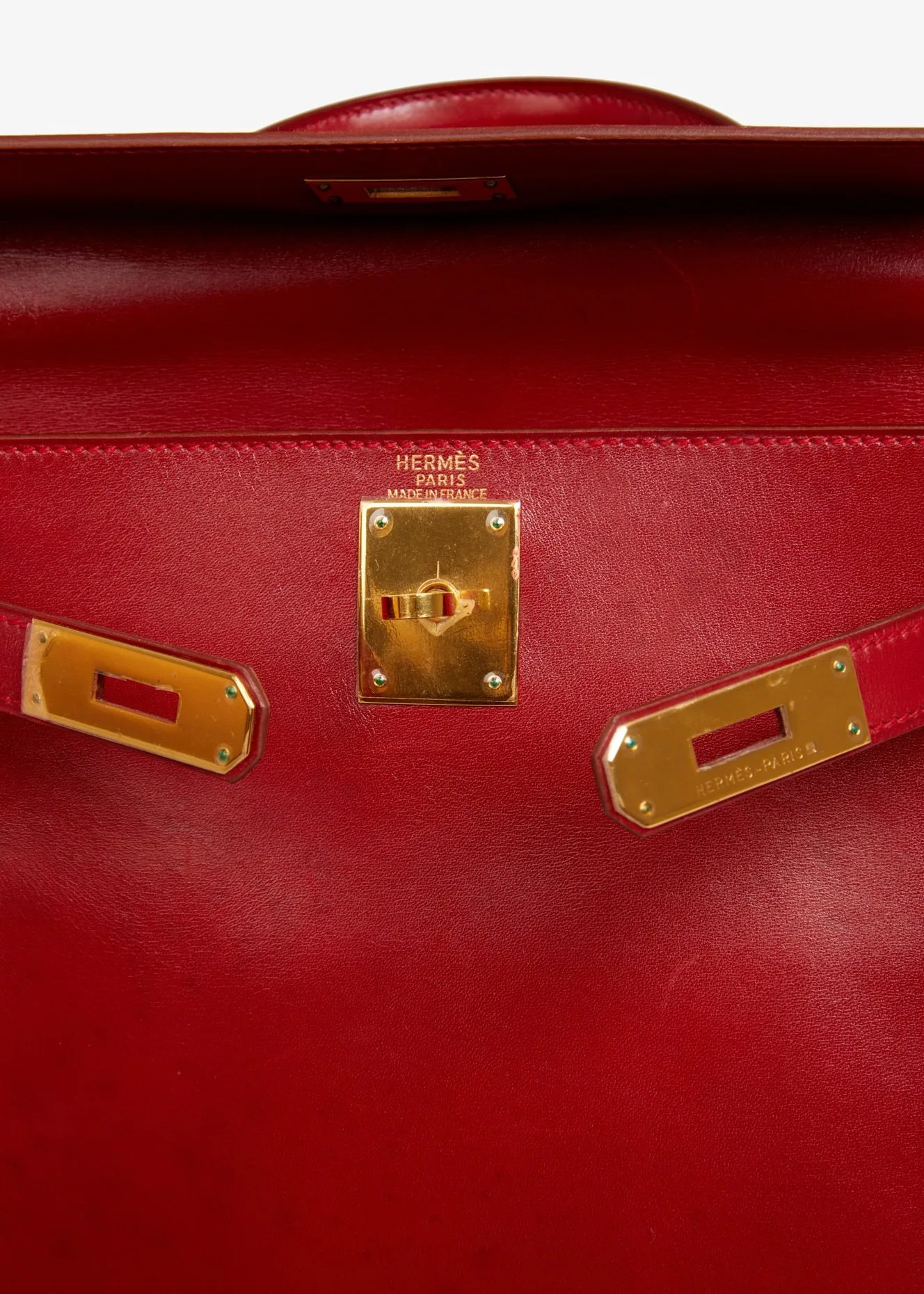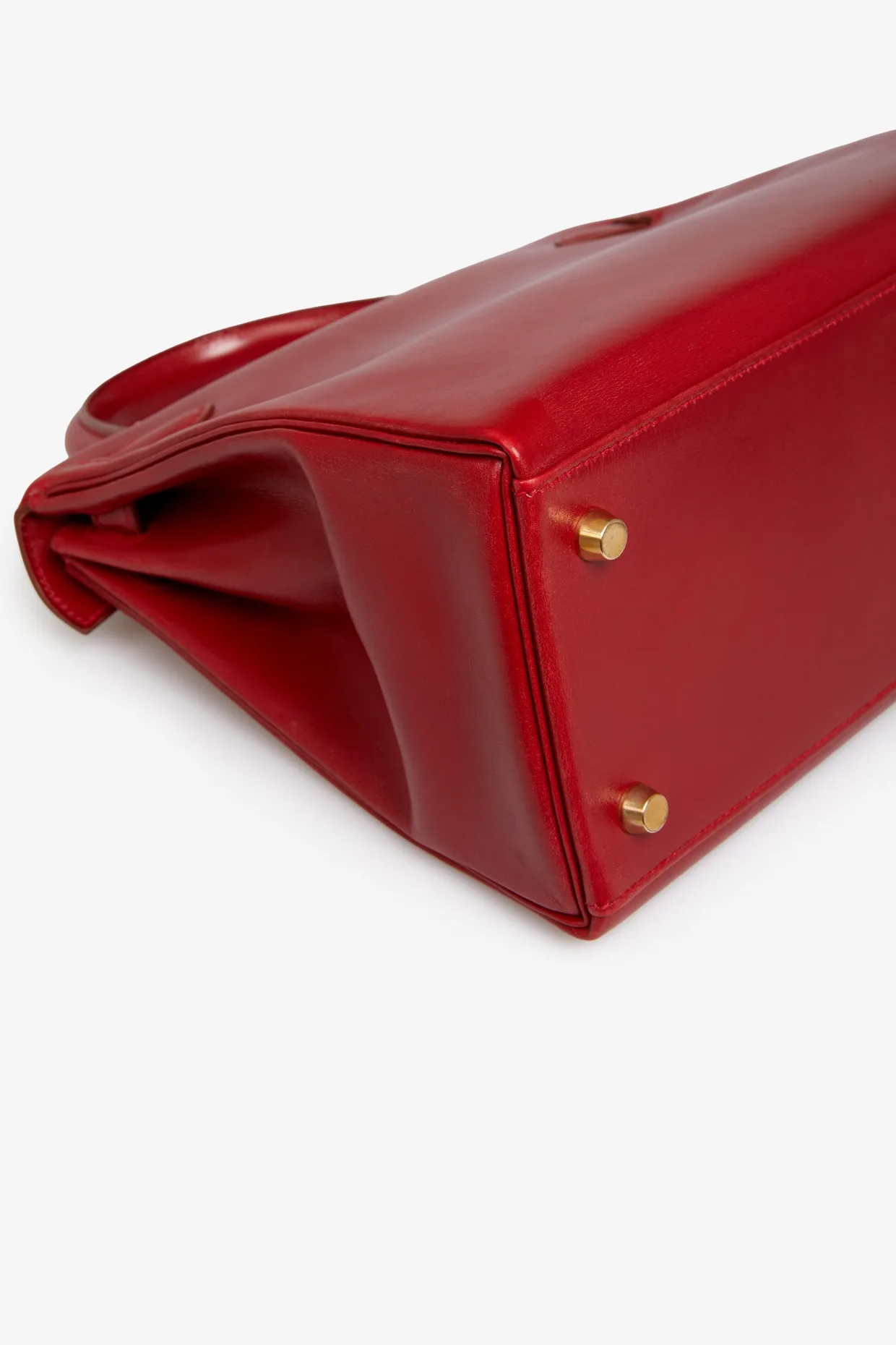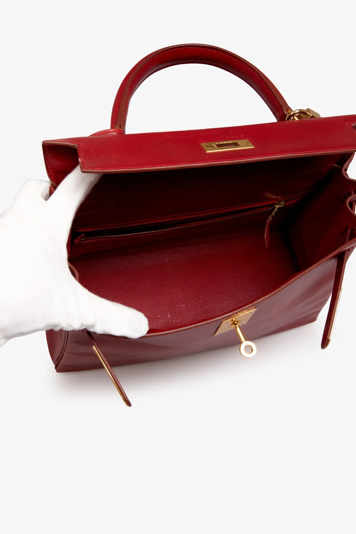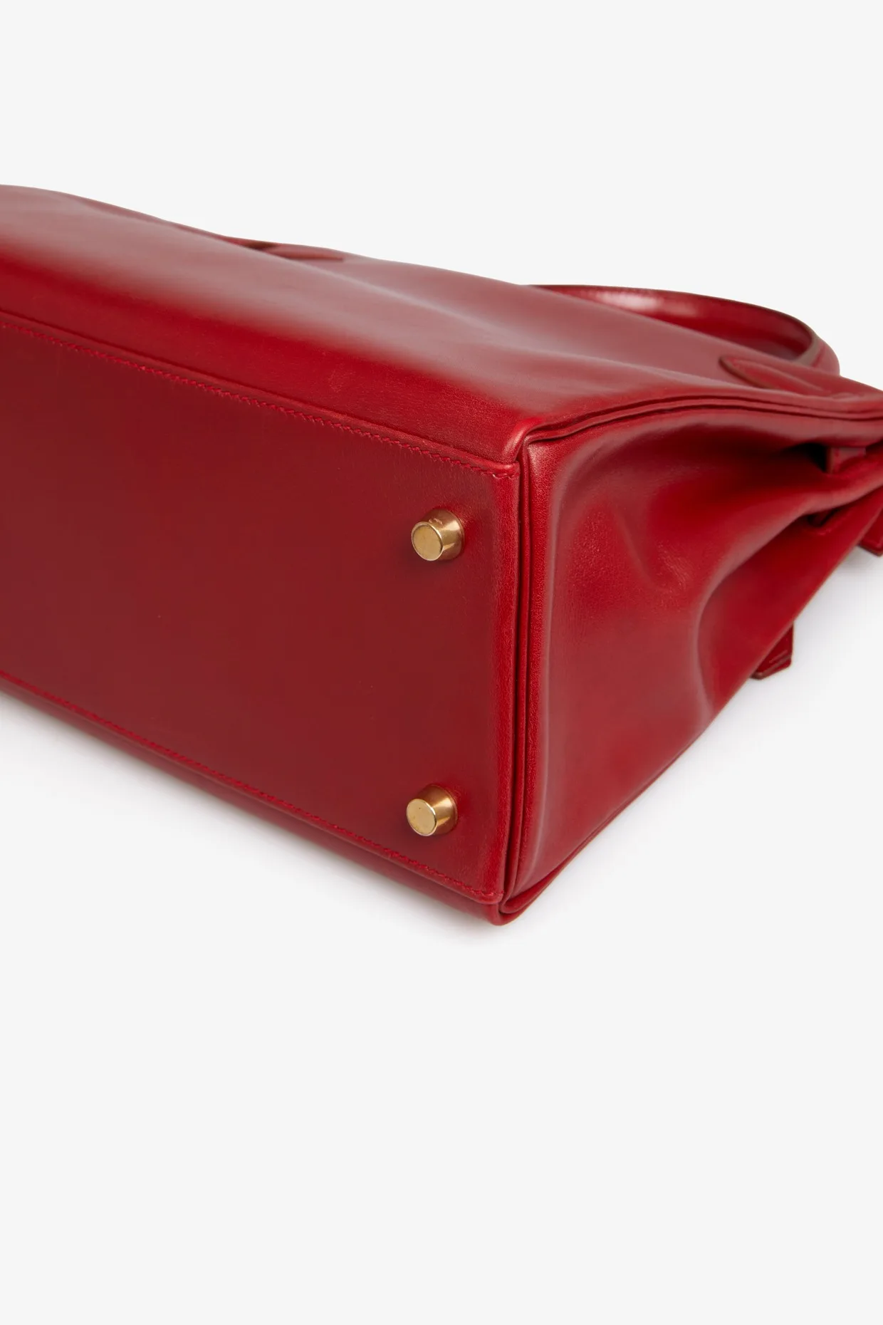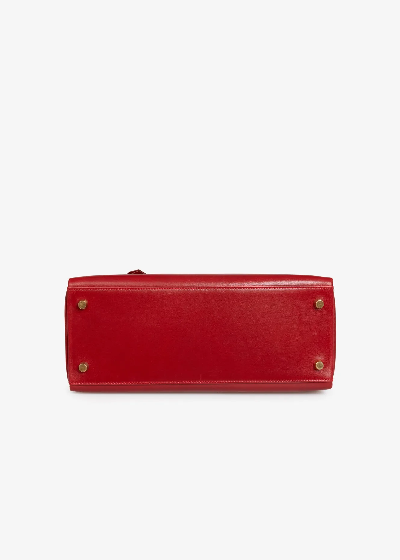 Kelly 28 Hermès bag in red box leather H. Gold jewelry. Pull cord, bell, padlock and key. Carried on the shoulder or by hand. In very good condition. Some wear marks. Plastics are still in jewelry stores.
