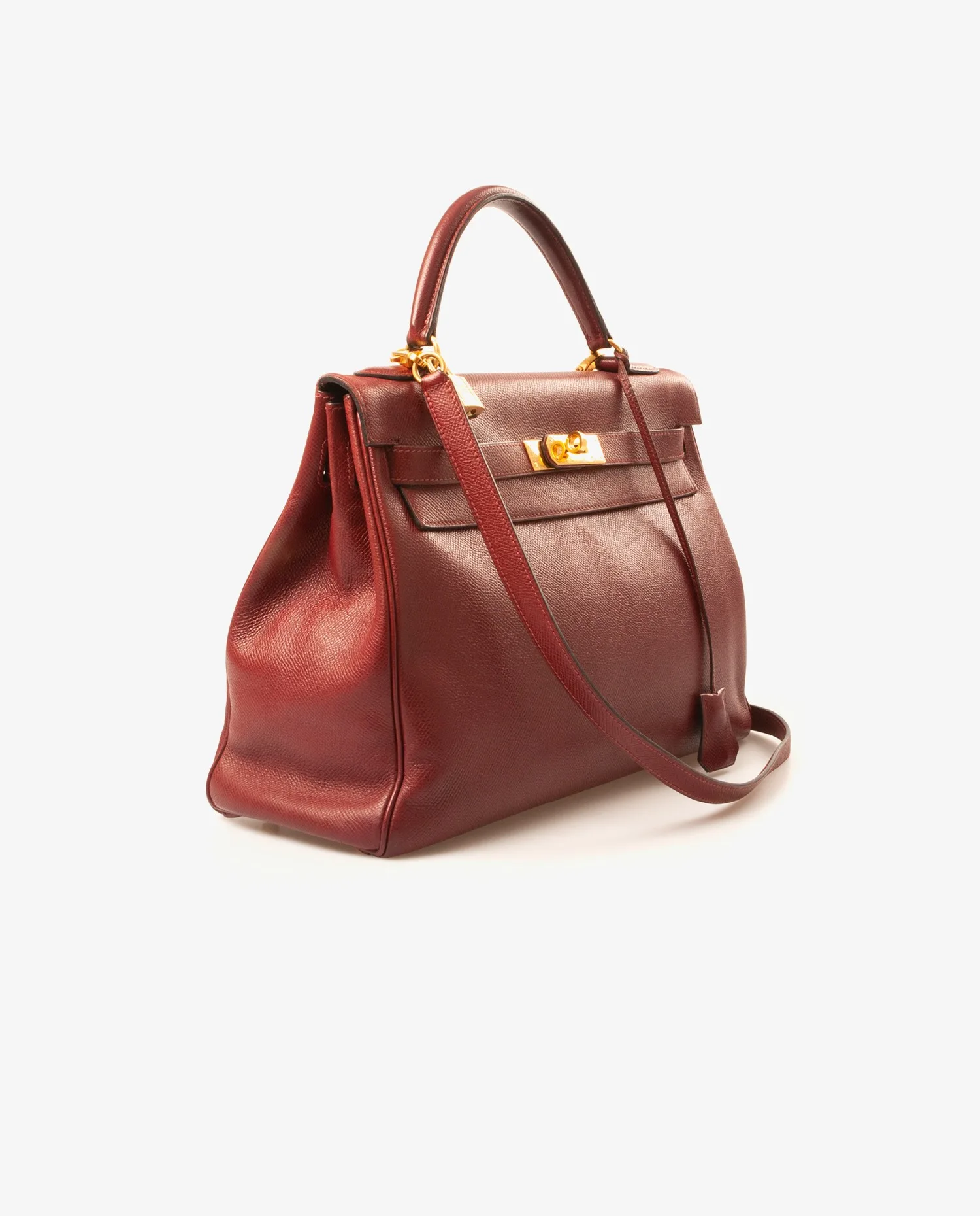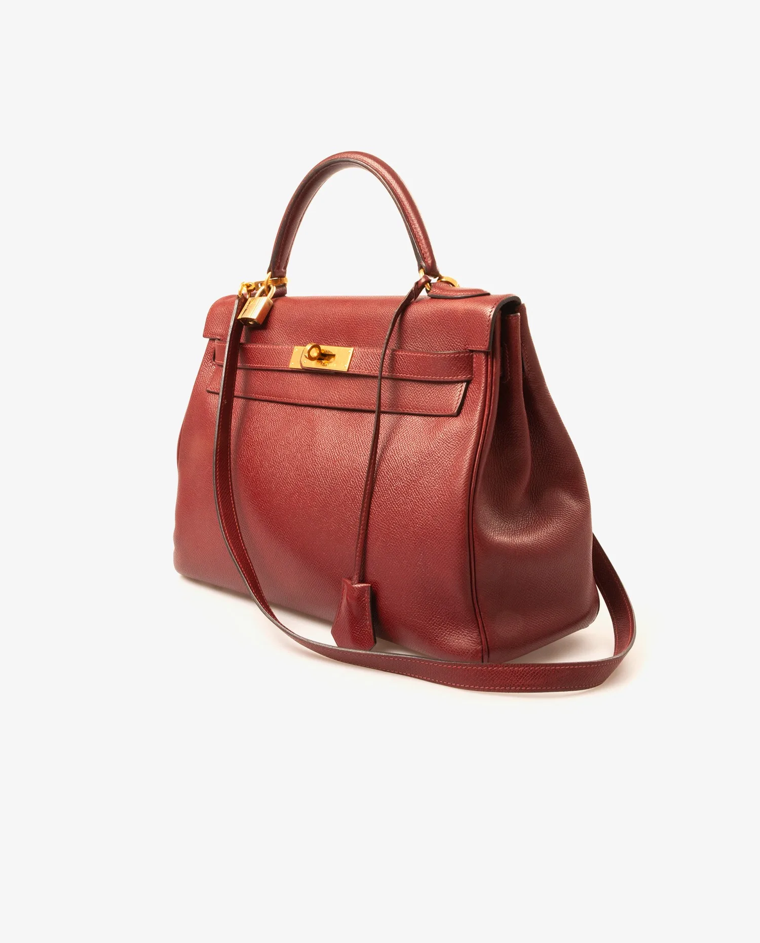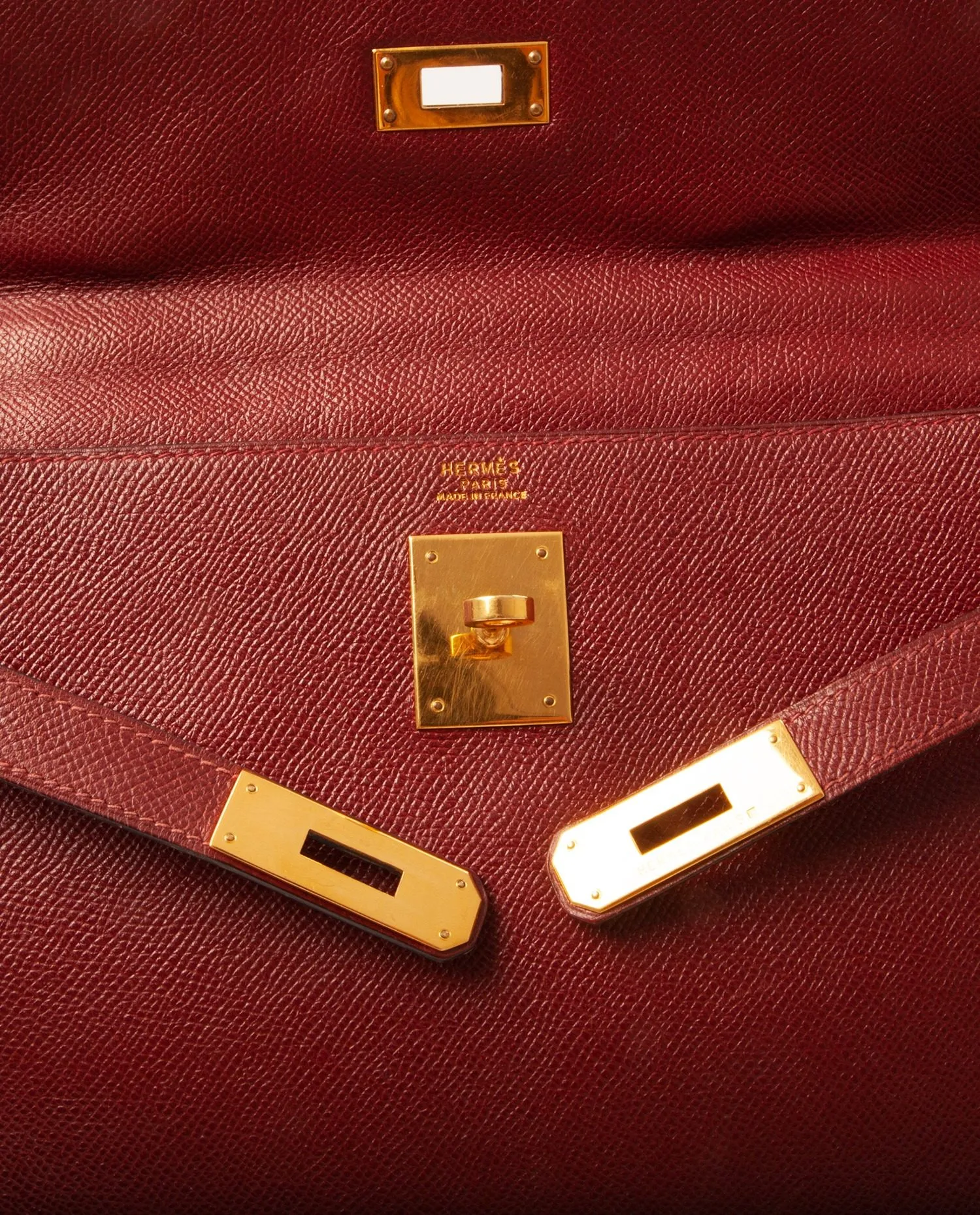 Hermès red leather Kelly 32 bag H. Gold jewelry. Carried by hand or on the shoulder with removable shoulder strap (86cm). Pulls, bells, keys and padlocks. It is in very good condition. Very slight corner wear and a few scratches on the clasp jewelry. Letter W in a circle, dated 1993.