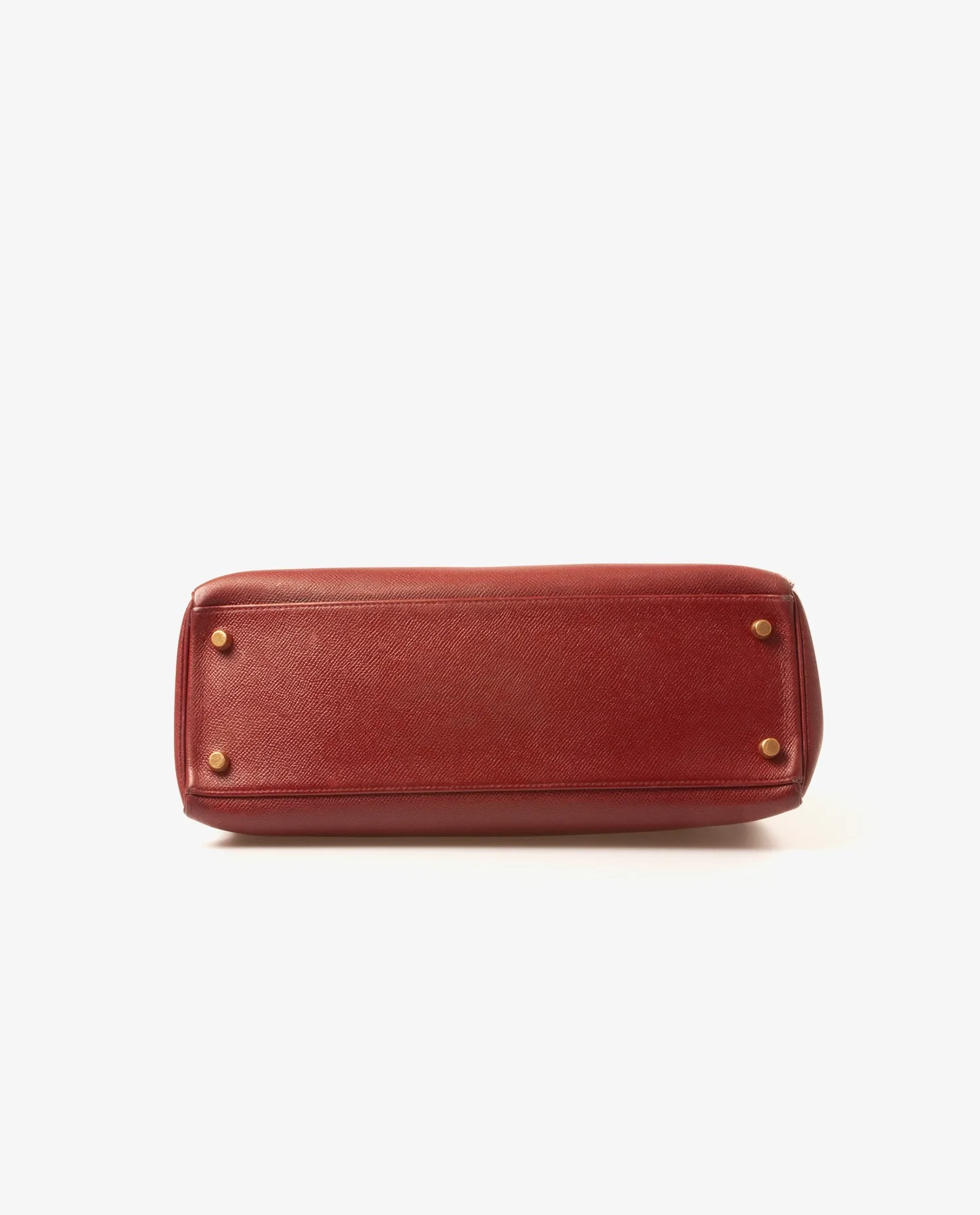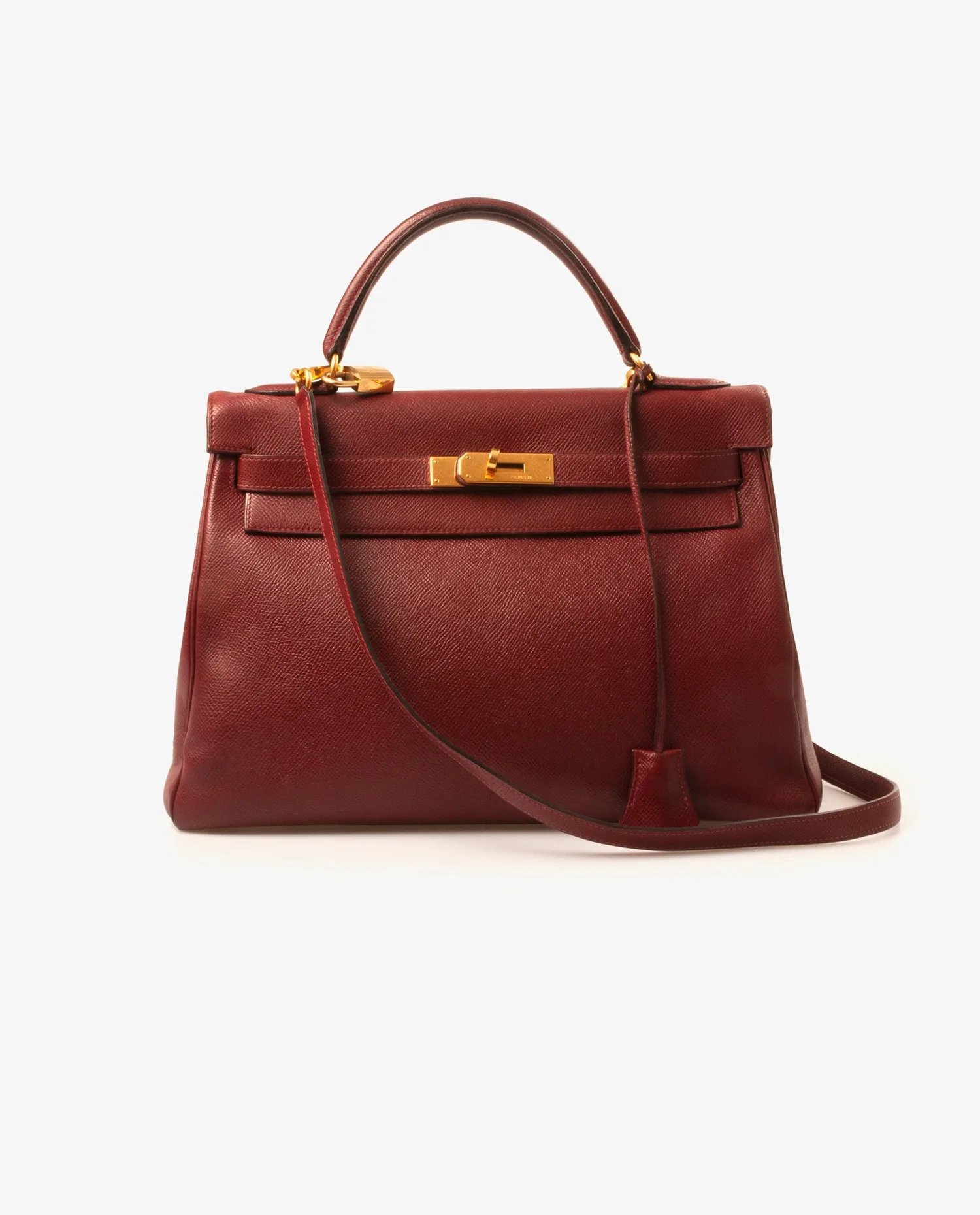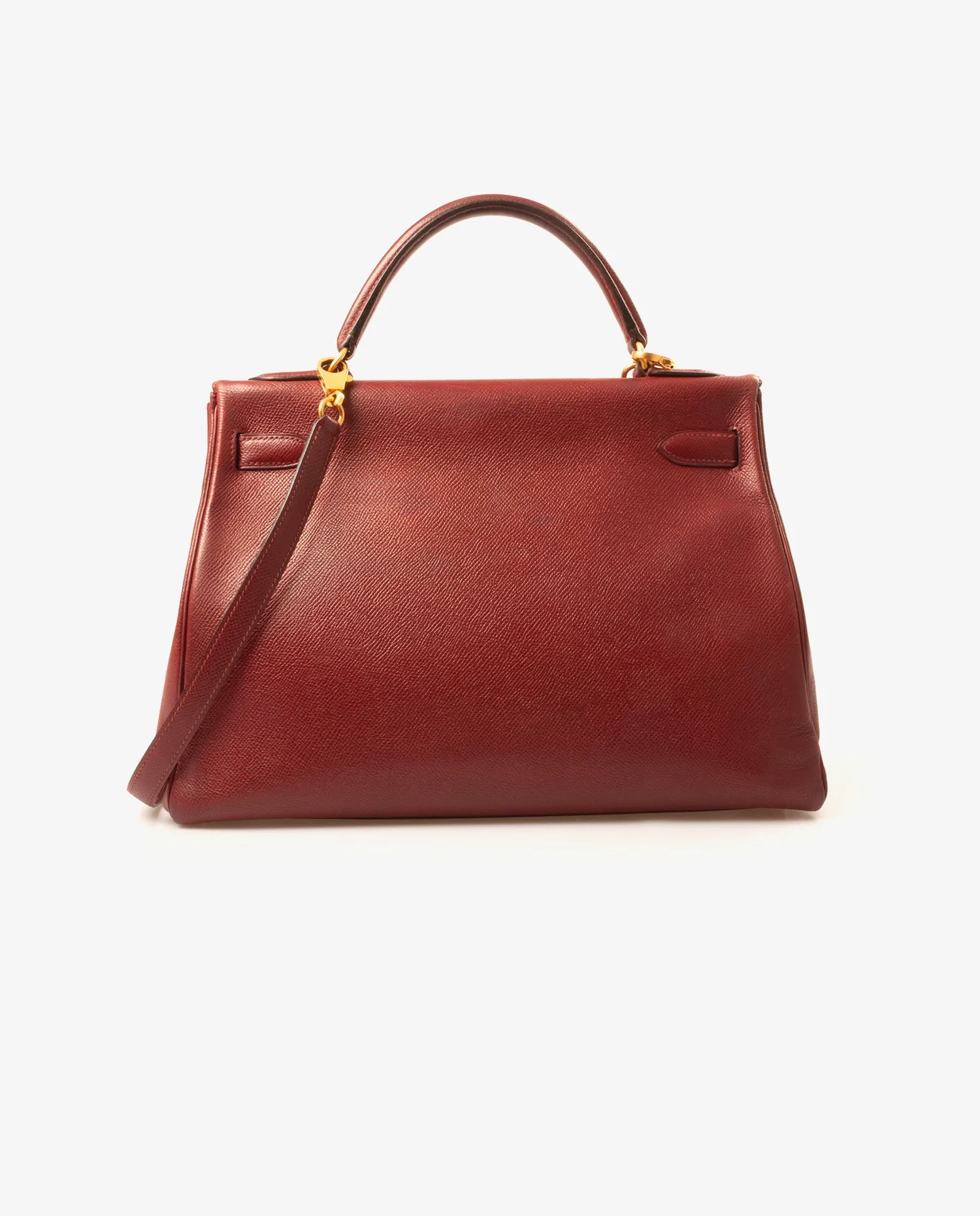 Hermès red leather Kelly 32 bag H. Gold jewelry. Carried by hand or on the shoulder with removable shoulder strap (86cm). Pulls, bells, keys and padlocks. It is in very good condition. Very slight corner wear and a few scratches on the clasp jewelry. Letter W in a circle, dated 1993.