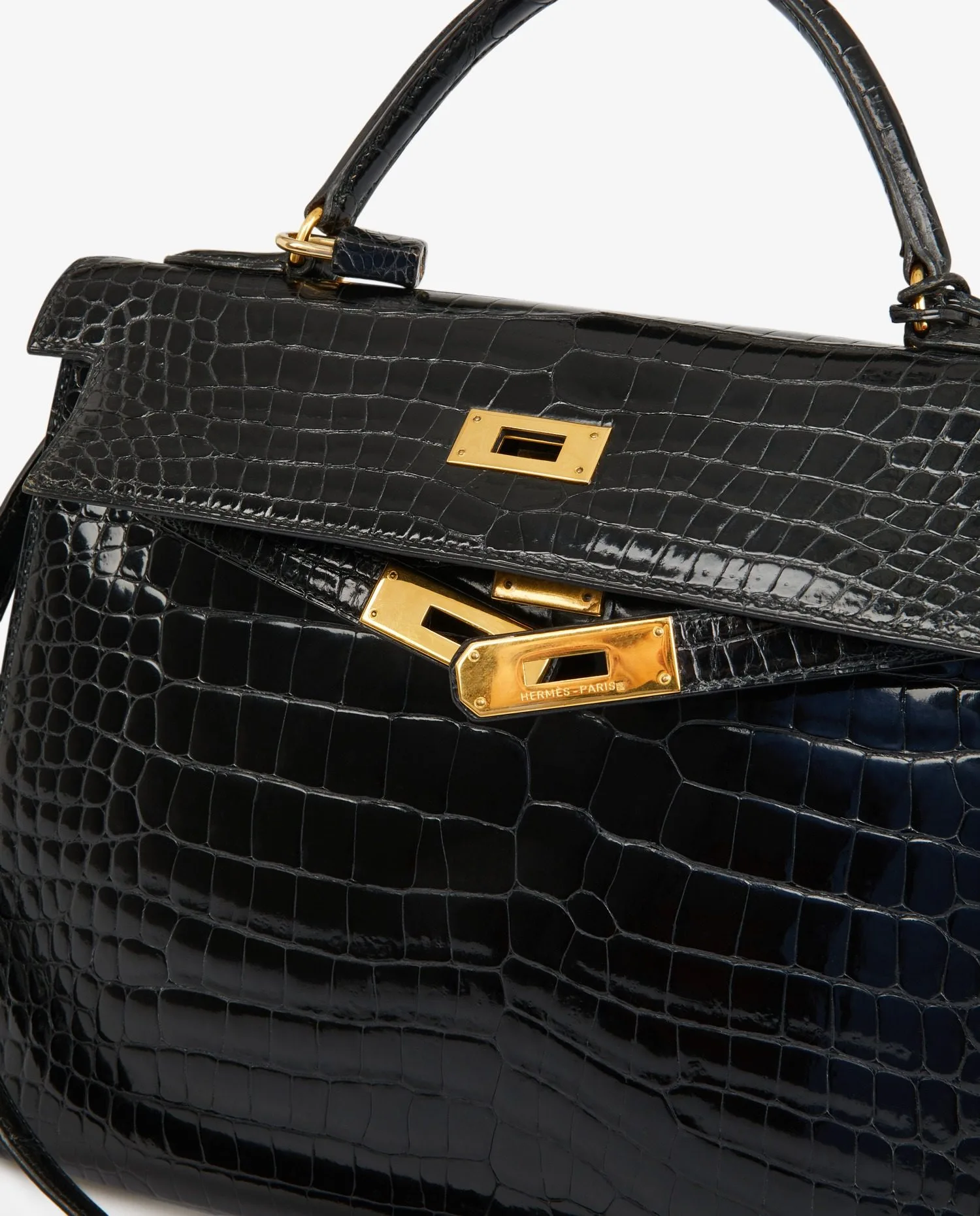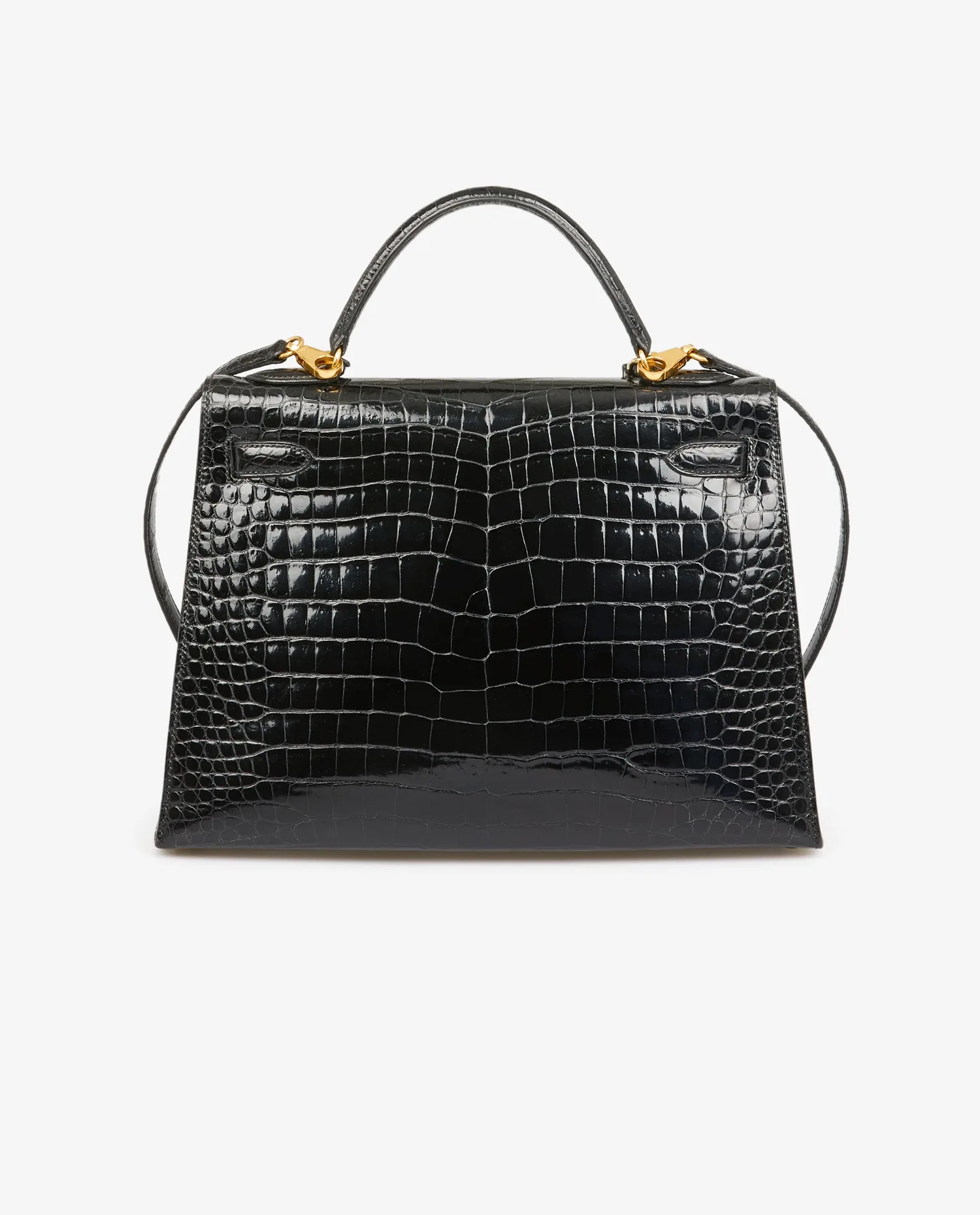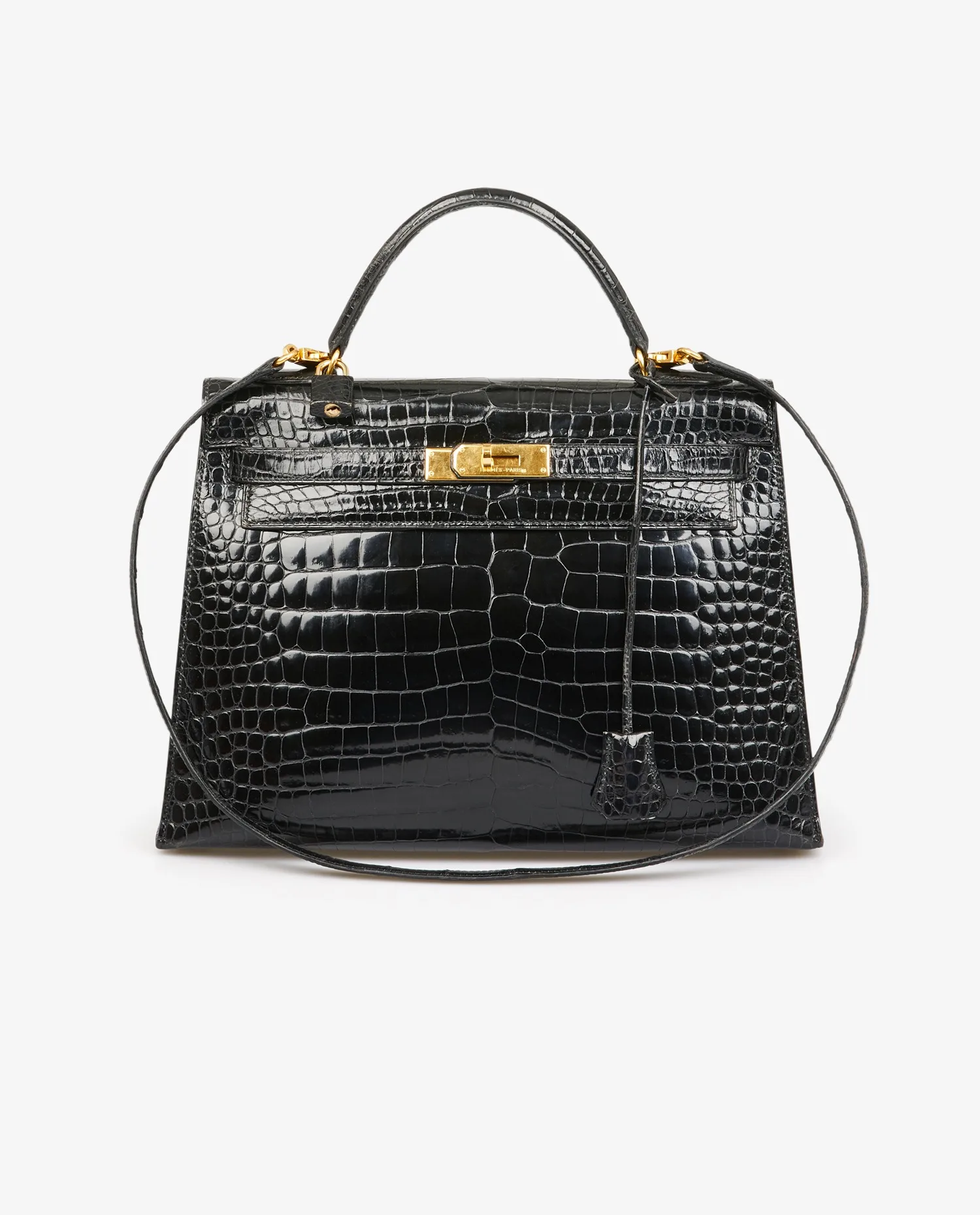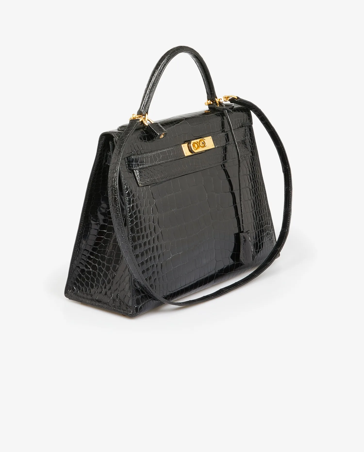 Kelly 32 Hermès bag in black porosus crocodile. Pull cord, bell and padlock. Carried by hand or on the shoulder with a detachable shoulder strap measuring 90cm. Stamp V in a circle, year 1992. In very good condition.