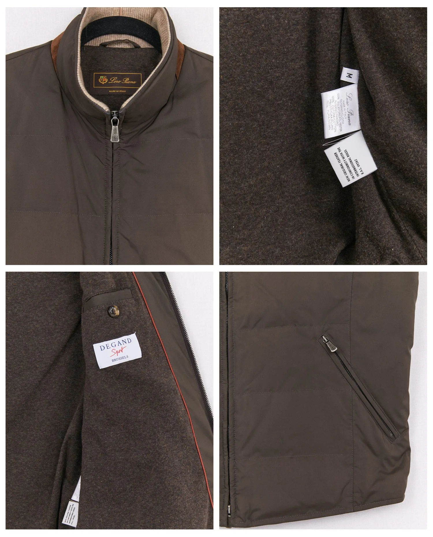 The interior is fully lined with a wool-blend fabric in a warm brown shade, offering insulation and comfort. A buttoned inside pocket is integrated on the left side. Finishes include discreet bright red contrast piping along the inner seams, adding a refined touch to the ensemble. The label “Loro Piana – Made in Italy” is sewn onto the collar, and “Degand Sport Bruxelles” is featured on the inside.