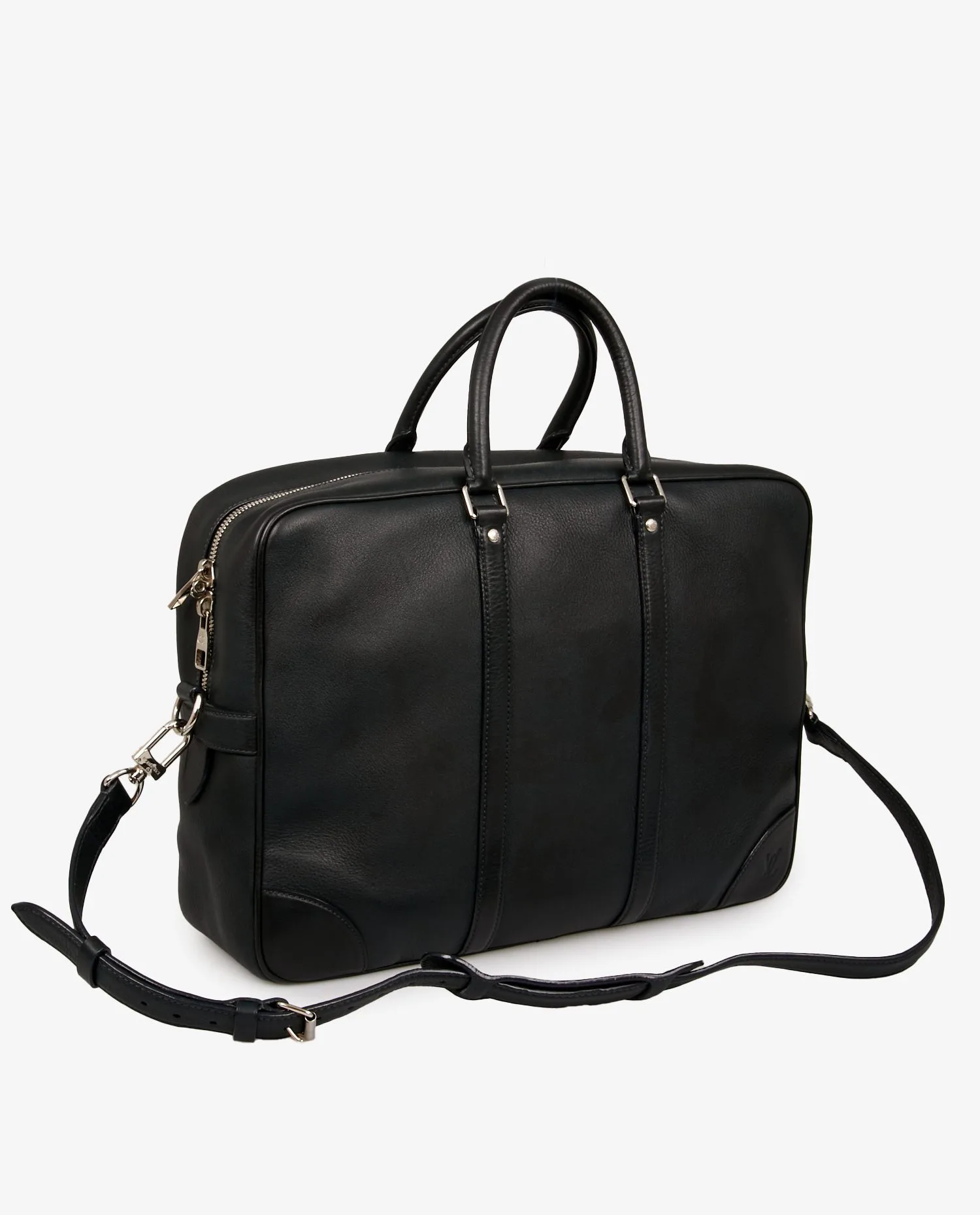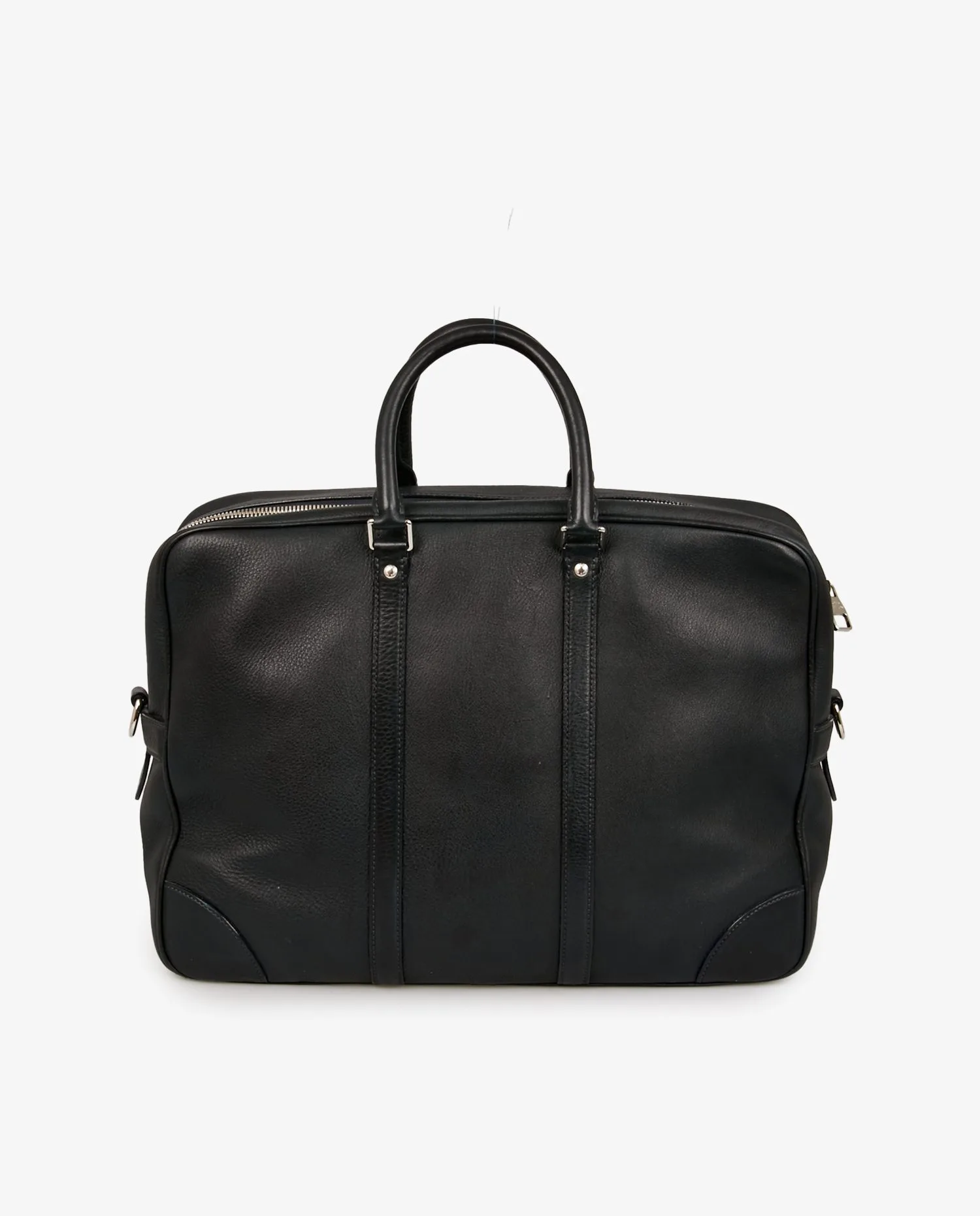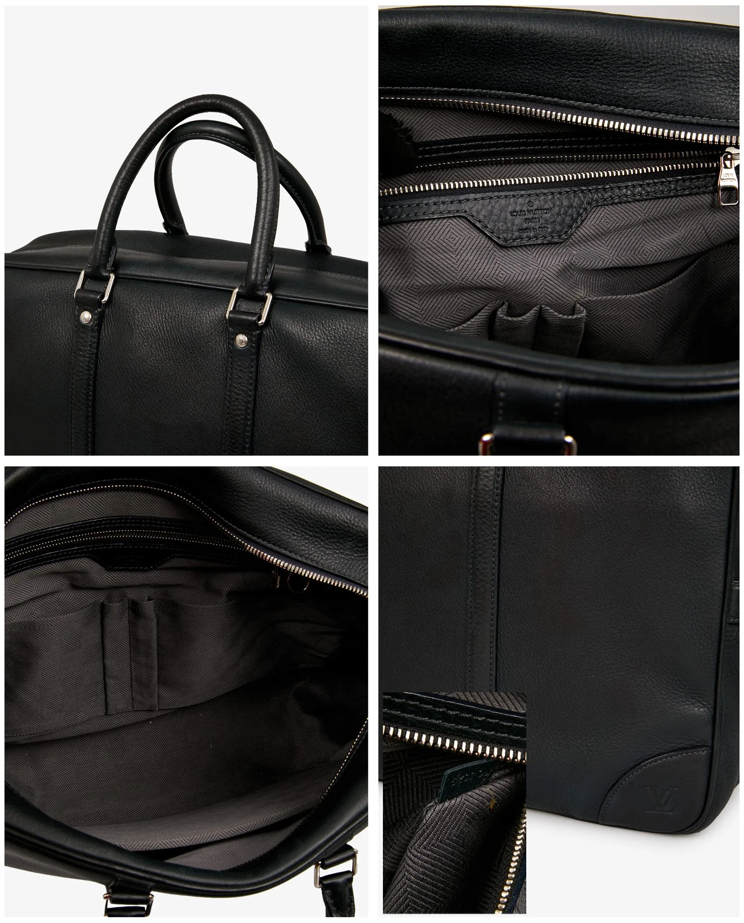 Louis Vuitton satchel in navy blue grained leather. The jewelry is in silver-plated metal. Zipper closure. Carried by hand or on the shoulder with an adjustable, removable shoulder strap. The interior is in gray checkerboard fabric. It features a large zipped pocket and a dedicated slot for your laptop. In very good condition. It will be delivered in its original dustbag.